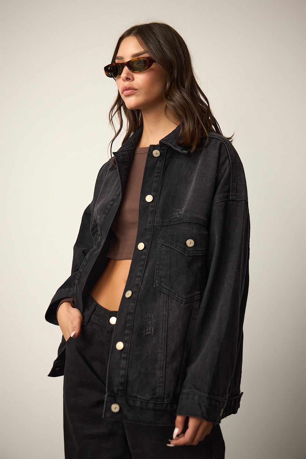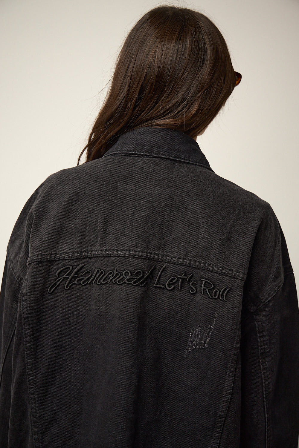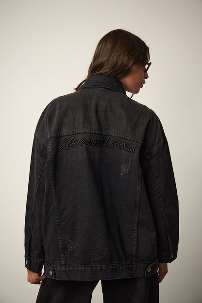 ג'קט ג'ינס בגזרת אוברסייז בשילוב שני כיסים מלפנים צווארון קלאסי, הדפס כיתוב רקום מאחור וכיסים נסתרים