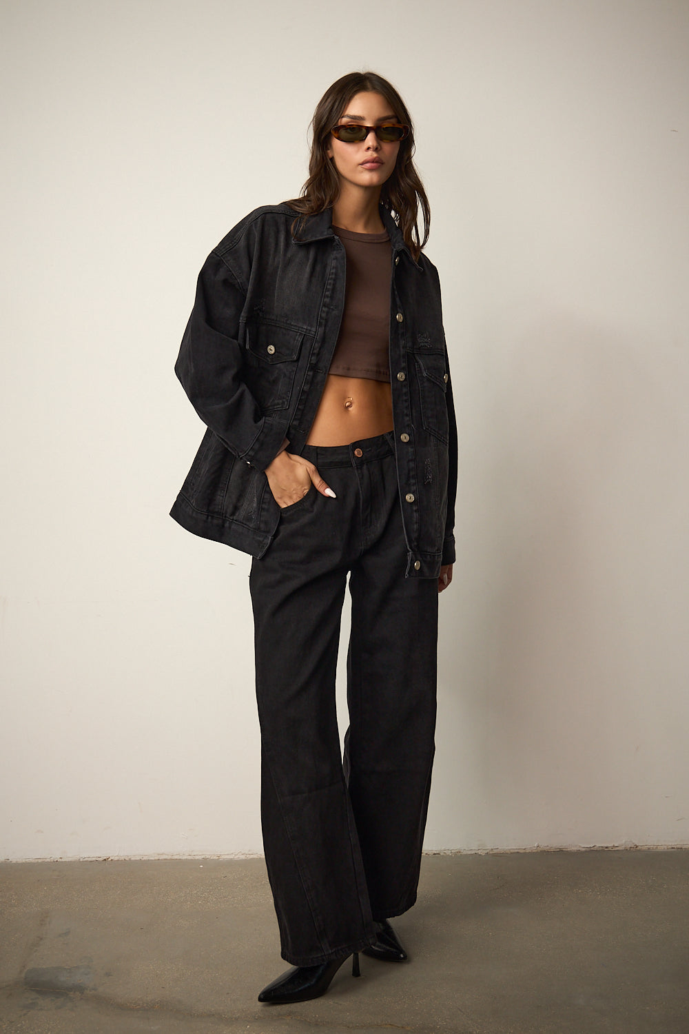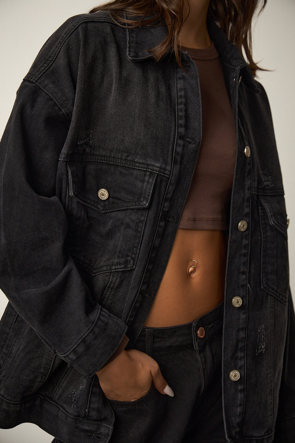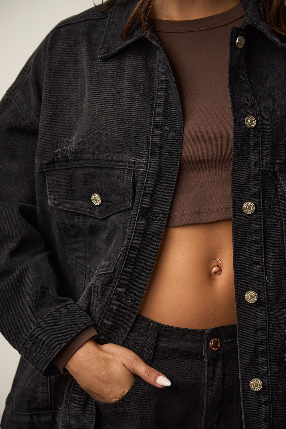 ג'קט ג'ינס בגזרת אוברסייז בשילוב שני כיסים מלפנים צווארון קלאסי, הדפס כיתוב רקום מאחור וכיסים נסתרים