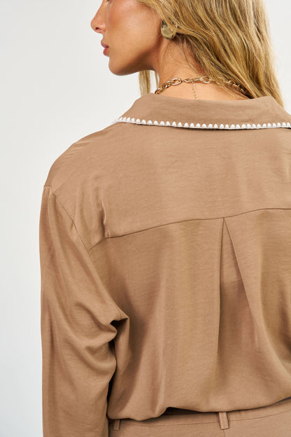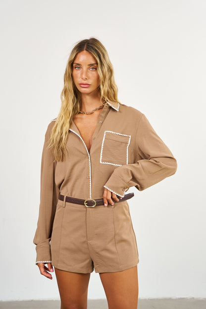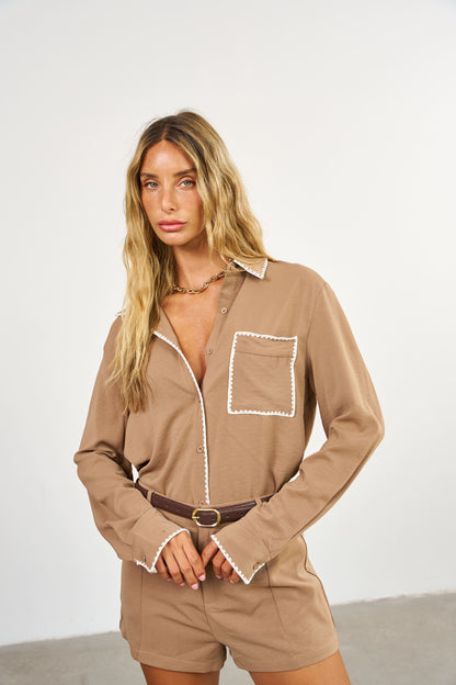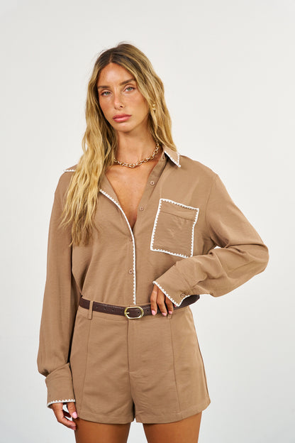 מכופתרת בגזרה משוחררת מבד קרפ נעים ורך למגע בשילוב צווארון קלאס, כפתורים מלפנים, כיס קדמי ועיטורי תפרים עיצוביים. שלבי עם שורט רטרו ללוק שאת חייבת בארון