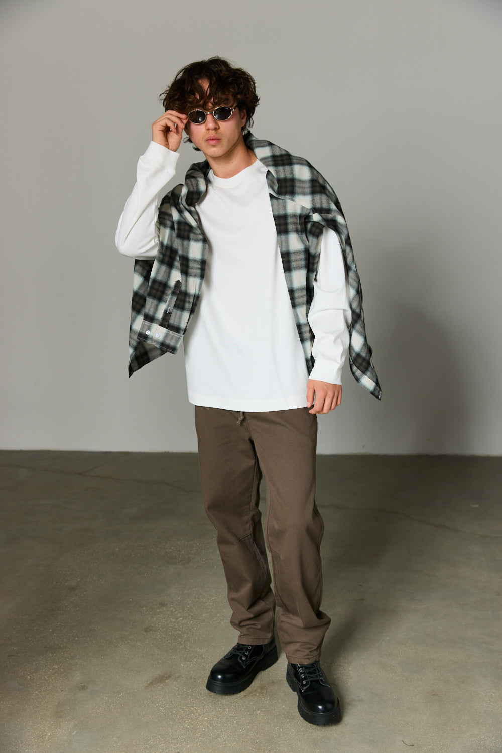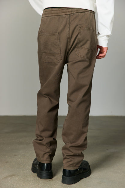 מכנסיים בגזרה משוחררת בשילוב מותן אלסטית, שרוך קשירה להידוק וארבעה כיסים