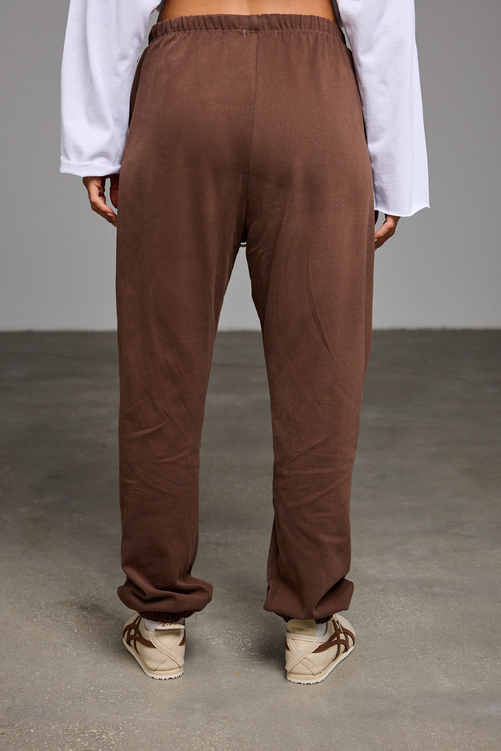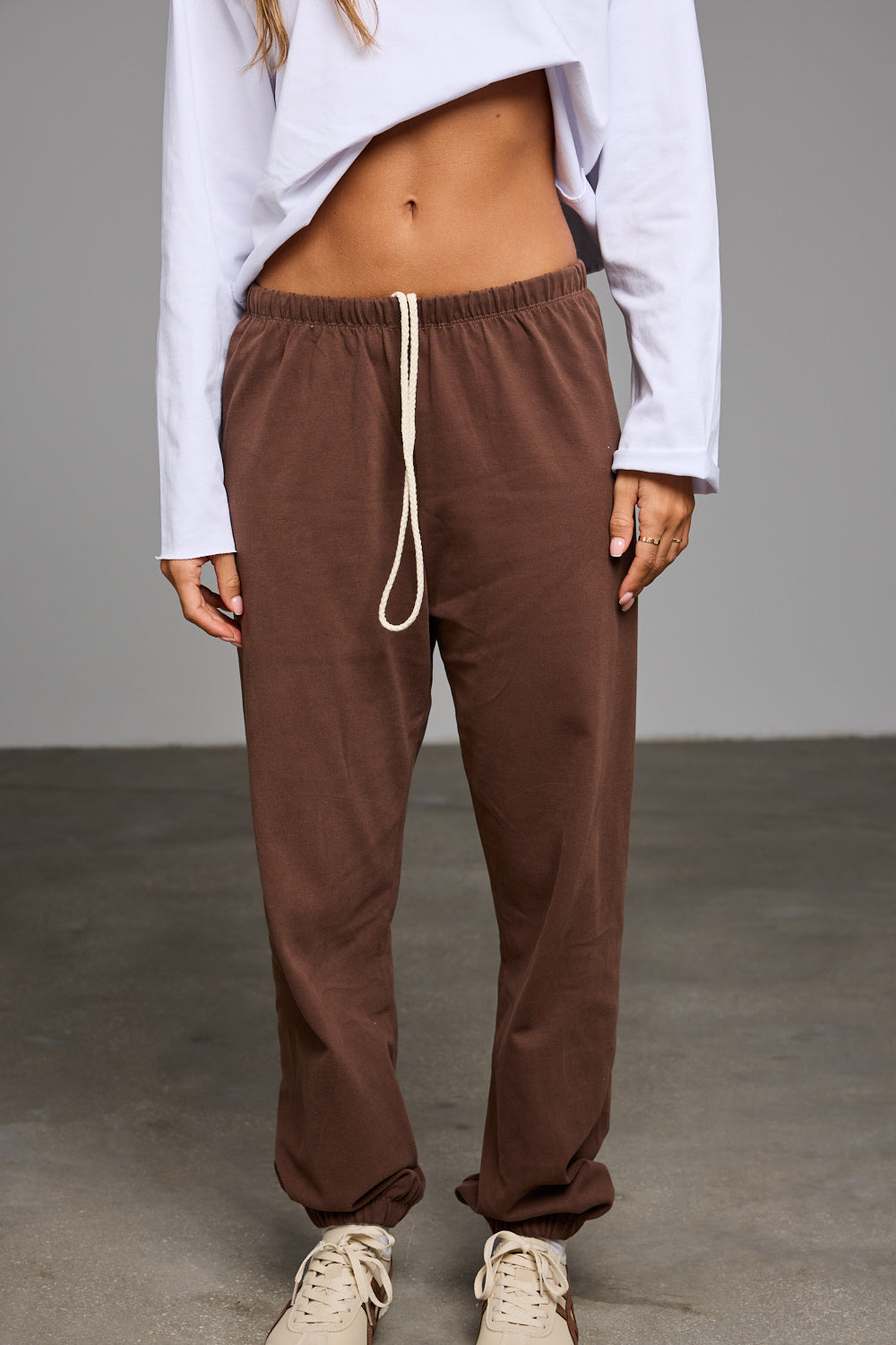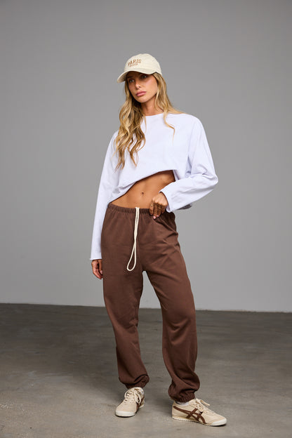 מכנסי בלון בגזרה משוחררת מבד נעים למגע בשילוב שרוך קשירה, מותן אלסטית ומכפלת גומי