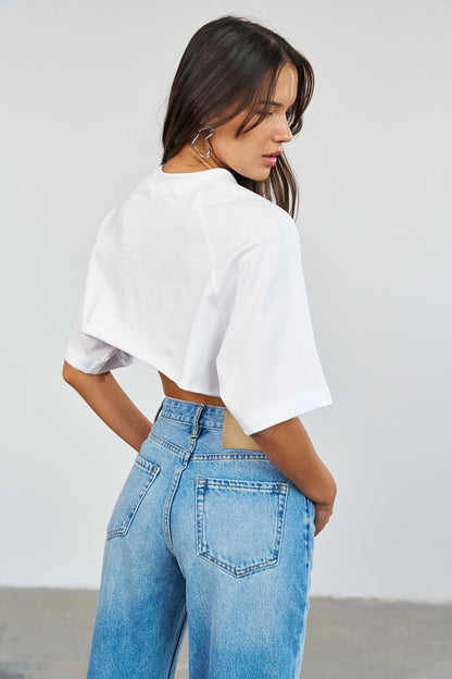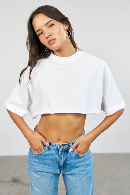 חולצת קרופ בגזרת אוברסייז מחמיאה לגוף בשילוב מפתח צוואר עגול, שרוולים רפויים וסיומת גזורה