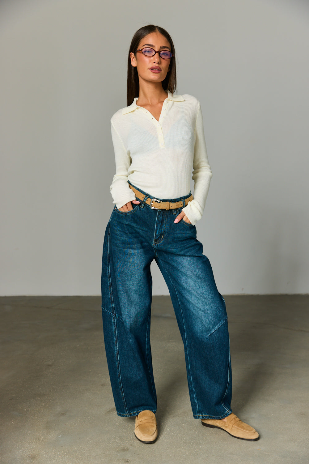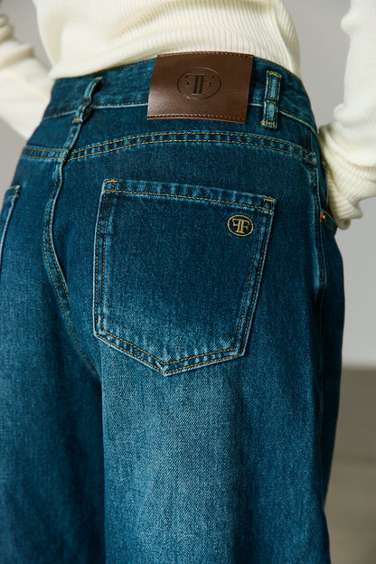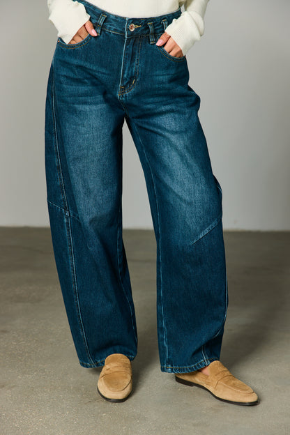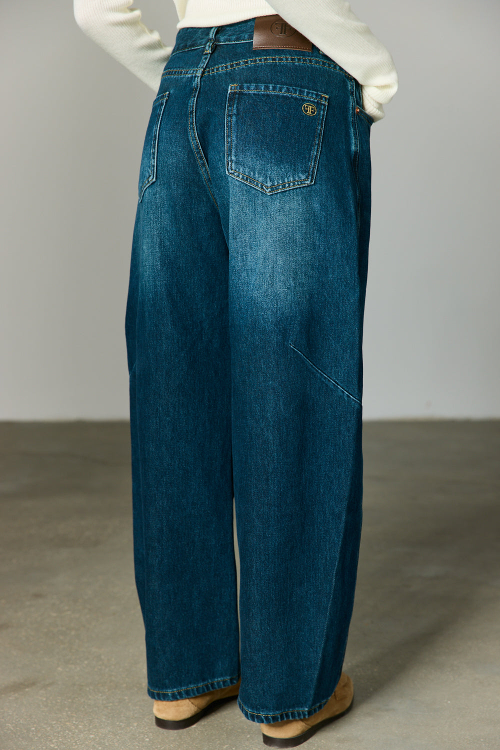 מכנסי ג'ינס בגזרה משוחררת בשילוב שטיפה עדינה, לולאות דקות, חמישה כיסים וסגירת כפתור עם רוכסן מלפנים