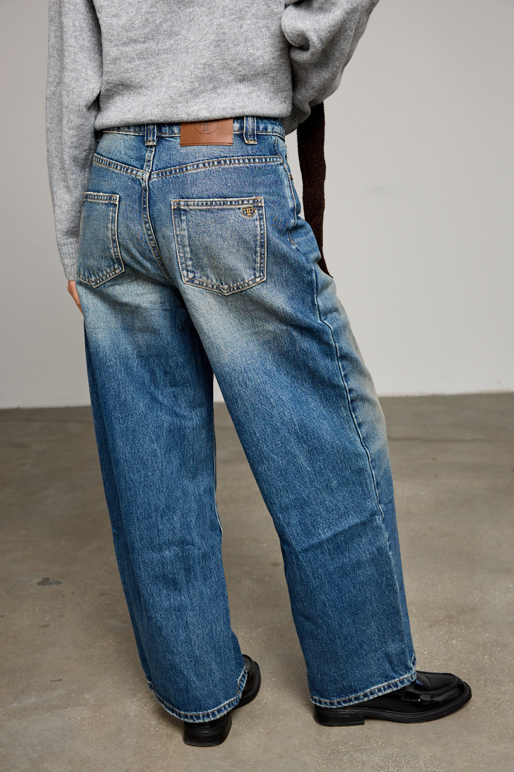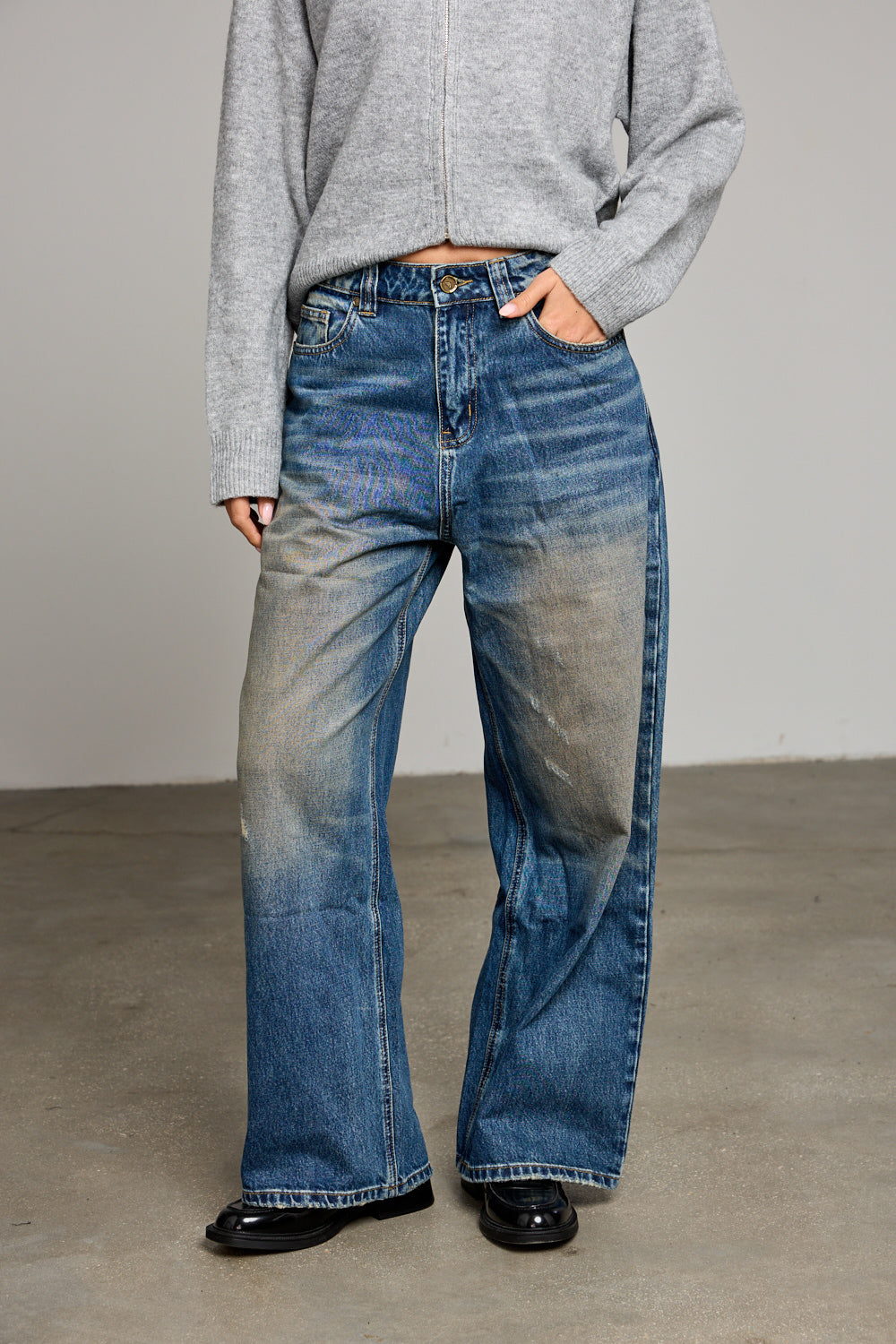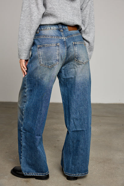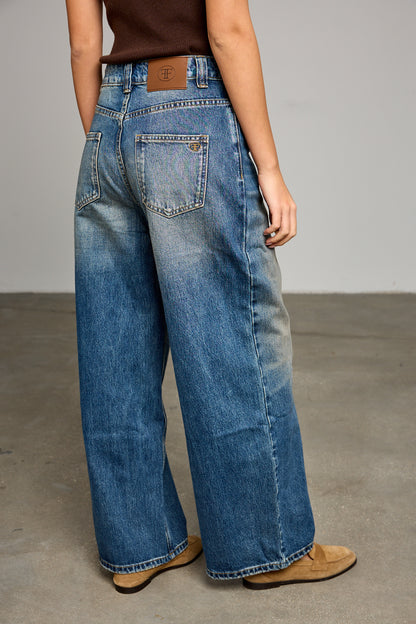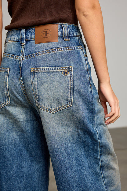 ג׳ינס בגזרה גבוה ומשוחררת בשילוב שטיפה, לולאות לחגורה, חמישה כיסים וסגירת כפתור עם רוכסן מלפנים