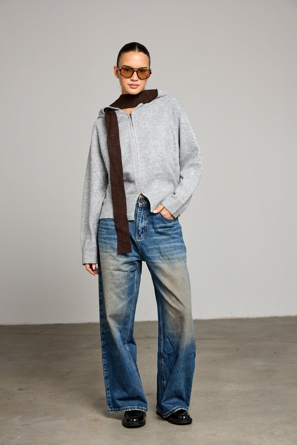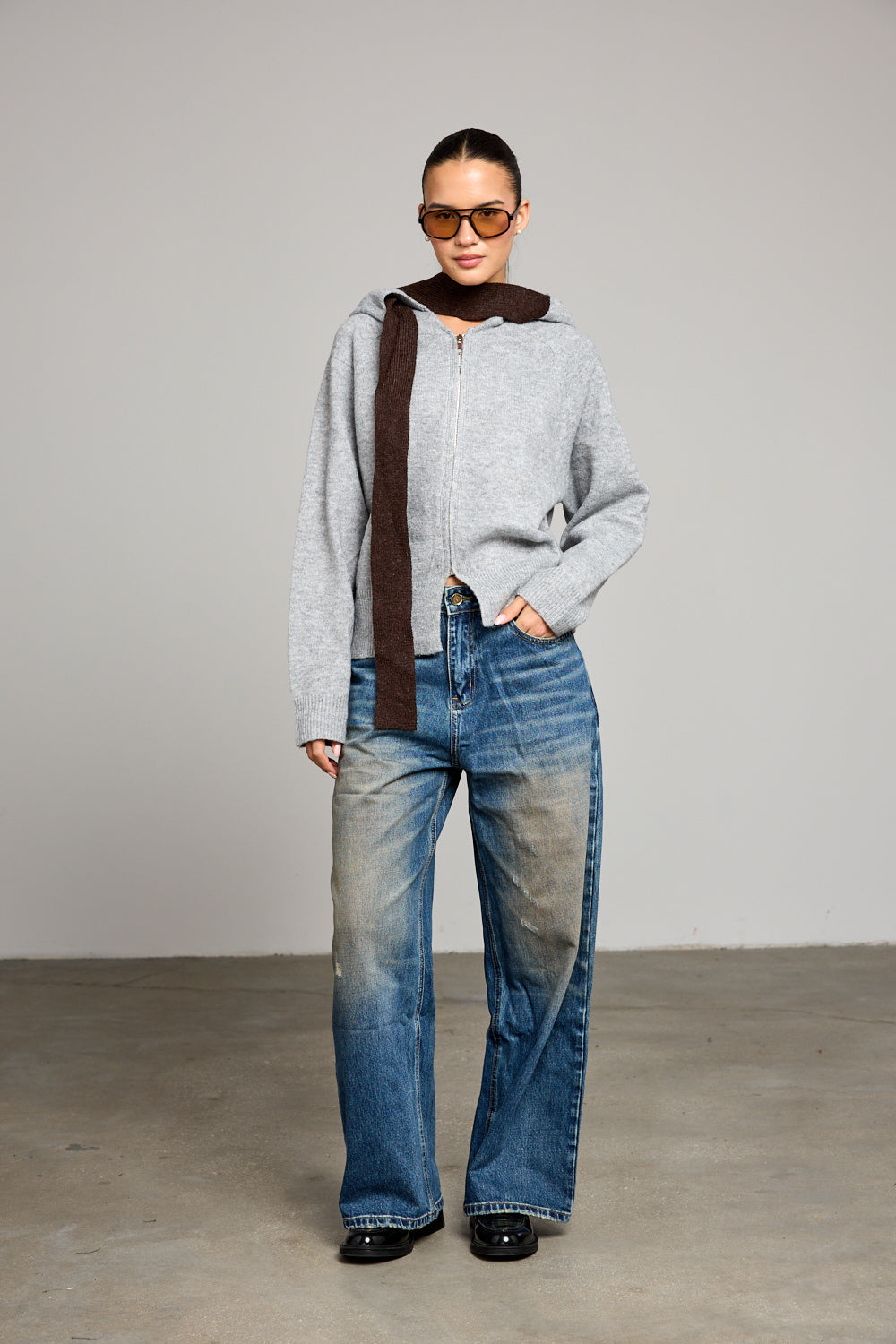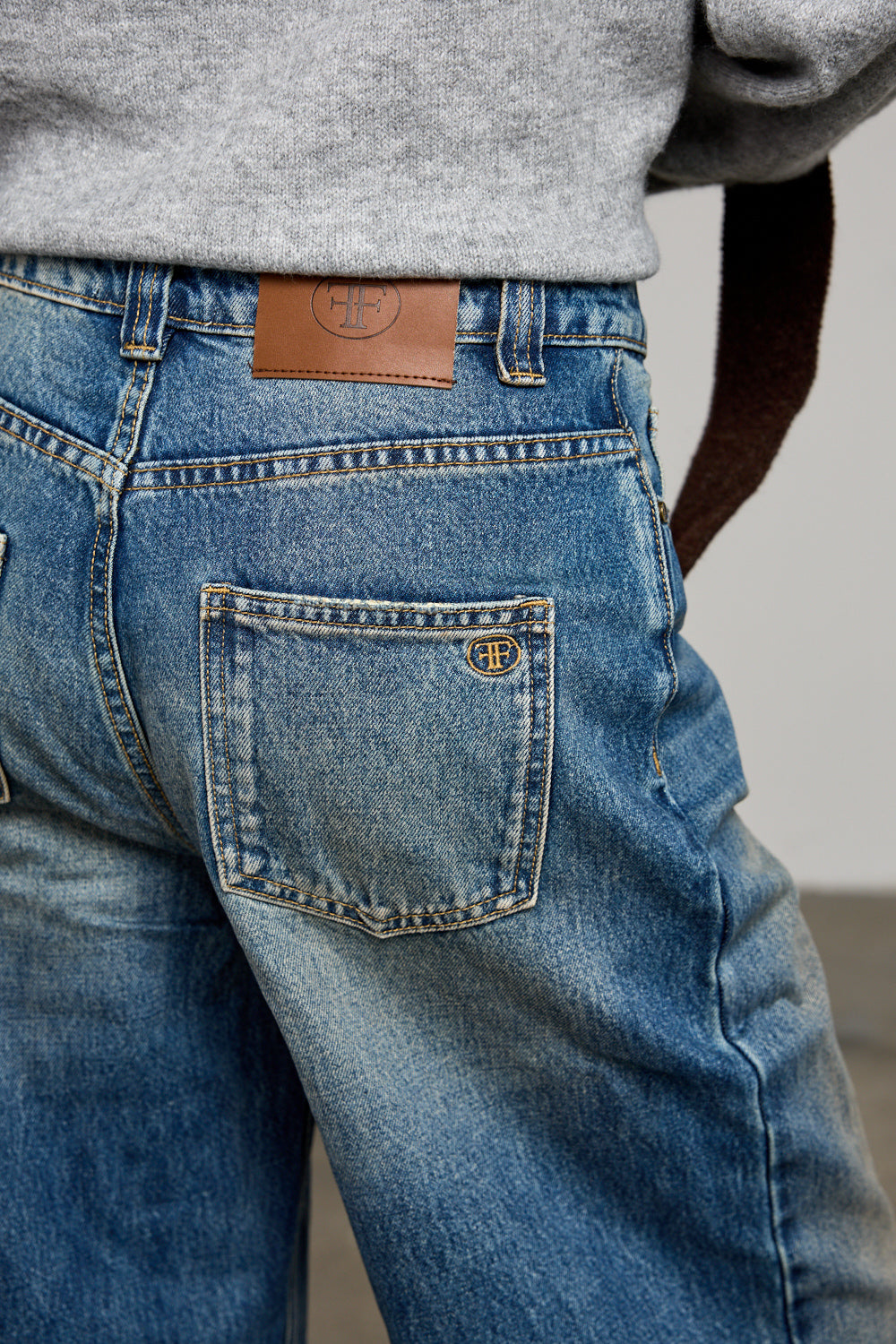 ג׳ינס בגזרה גבוה ומשוחררת בשילוב שטיפה, לולאות לחגורה, חמישה כיסים וסגירת כפתור עם רוכסן מלפנים