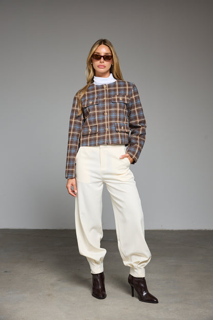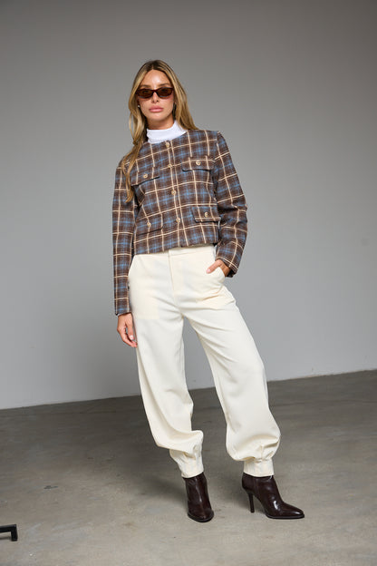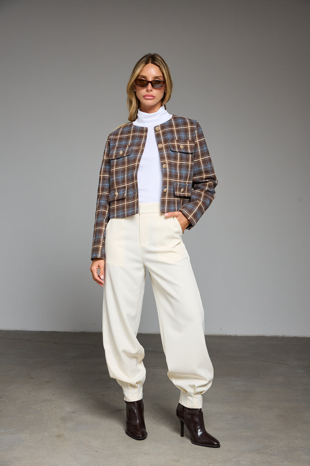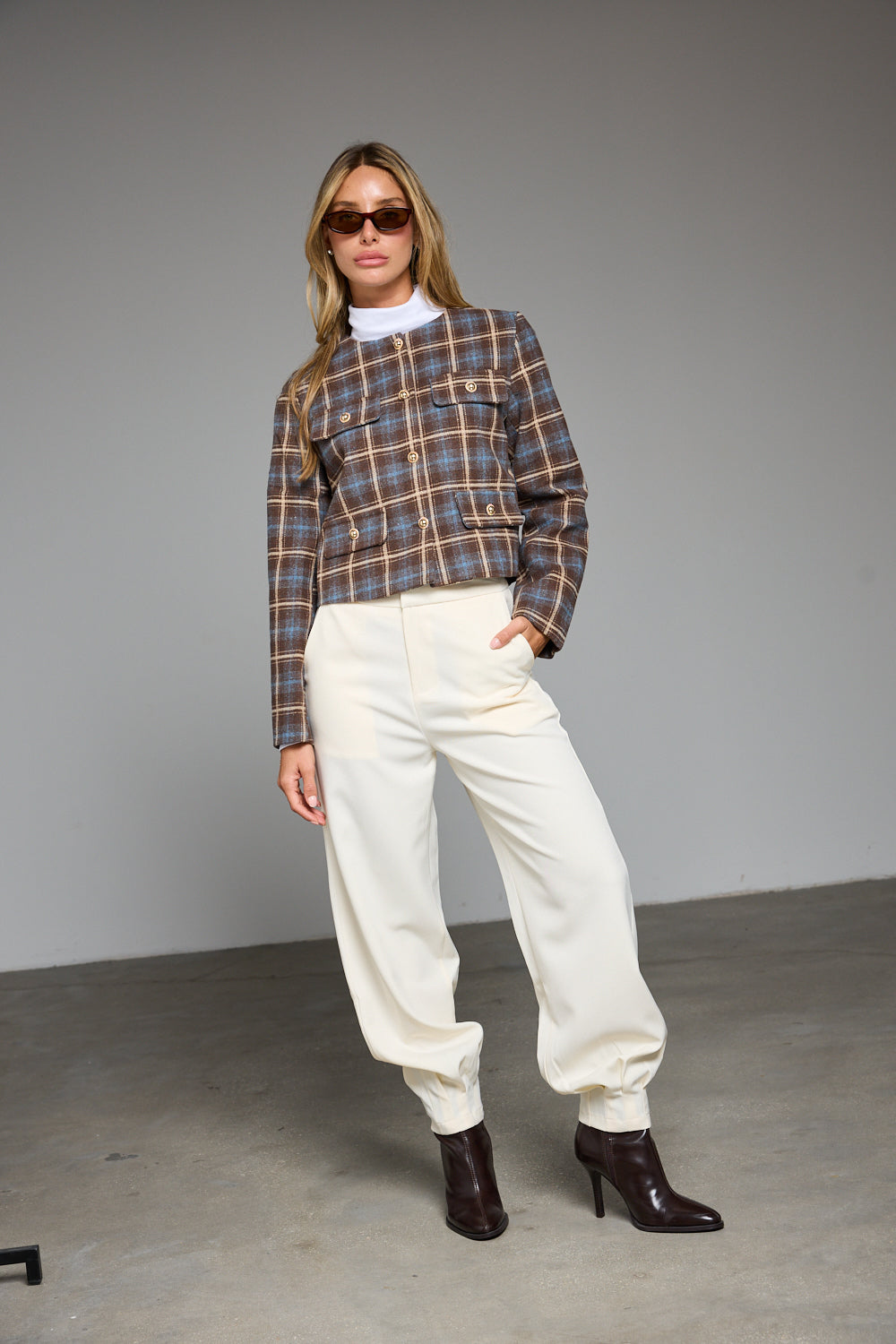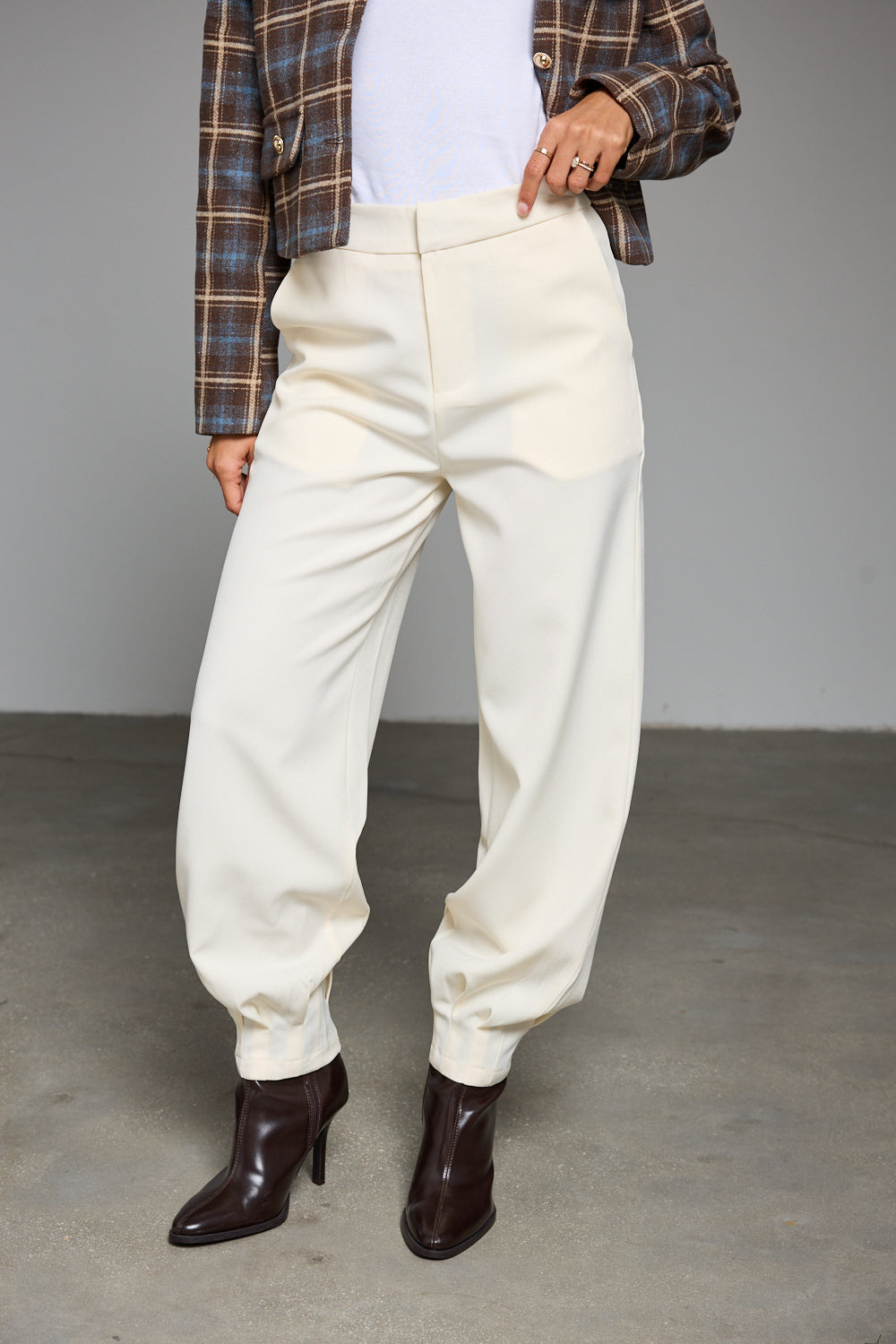 מכנסיים אלגנטיים בגזרה ישרה מבד אריג בשילוב צמד כיסים אלכסוניים ומכפלת קפלים עם מנג'ט