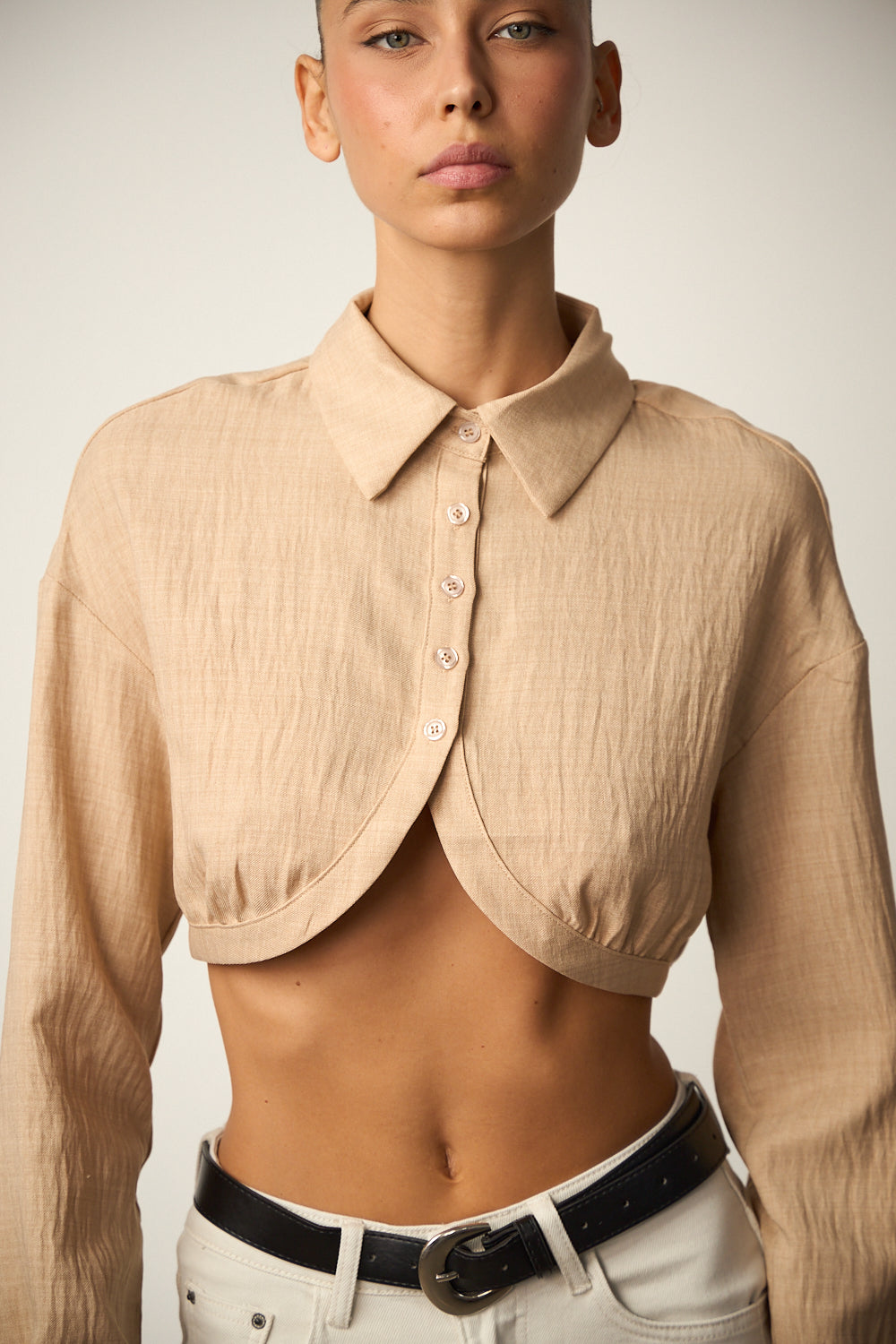 מכופתרת קרופ בשילוב צווארון קלאסי, כפתורים מלפנים, וי הפוך, מכפלת אלסטית מאחור ושרוולים ארוכים