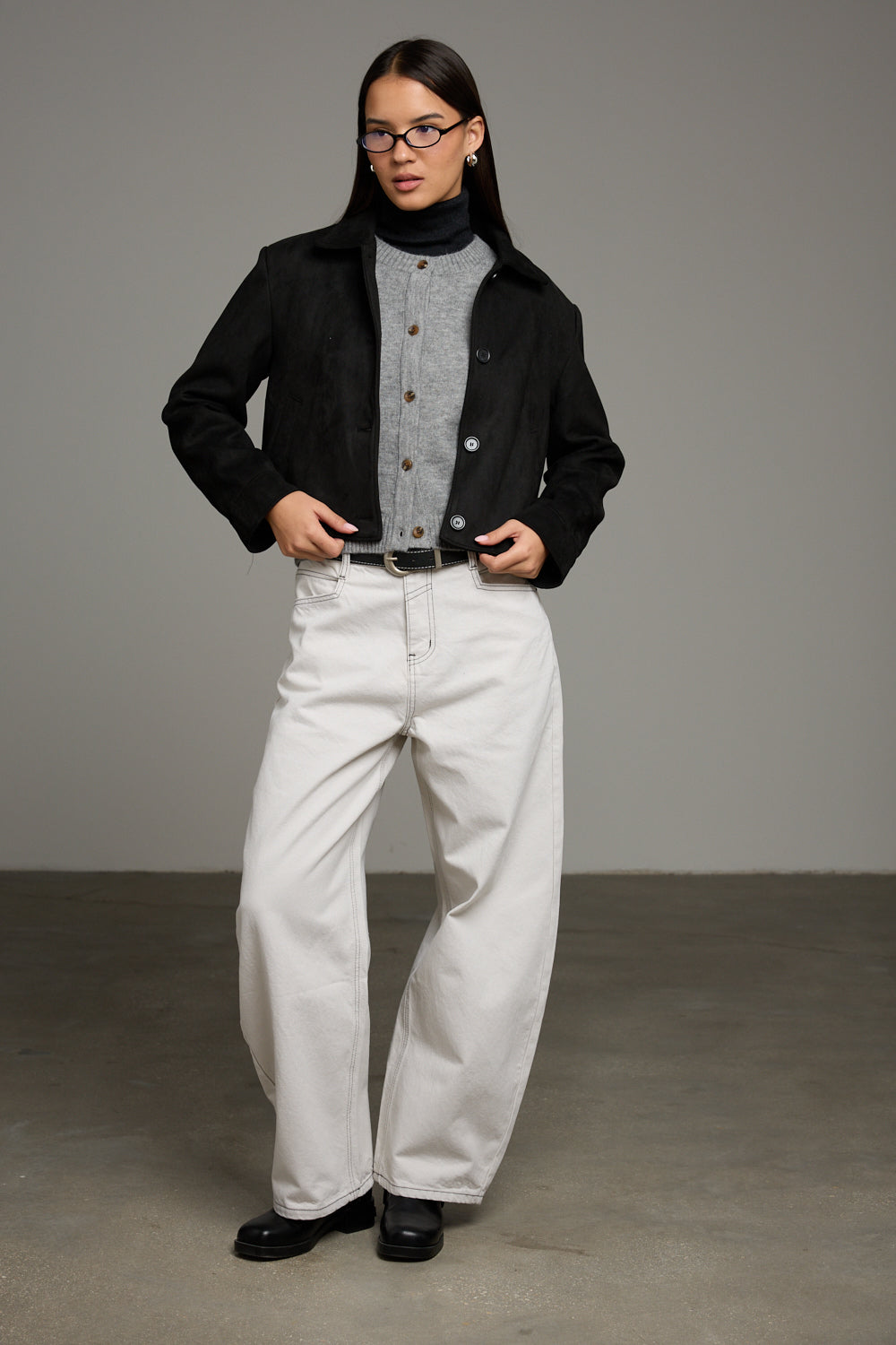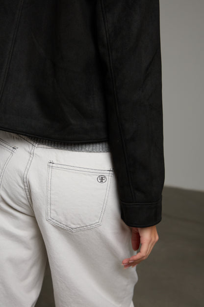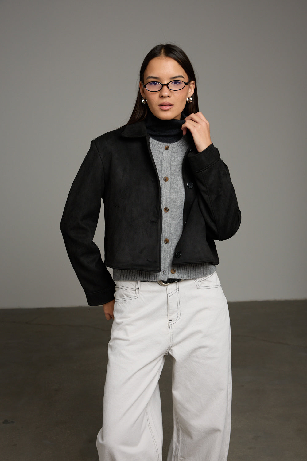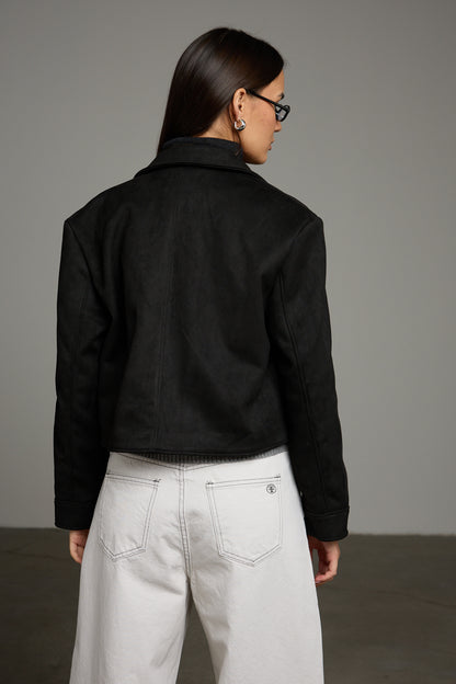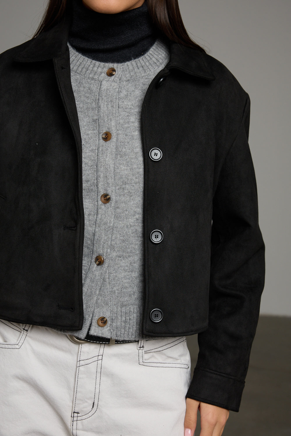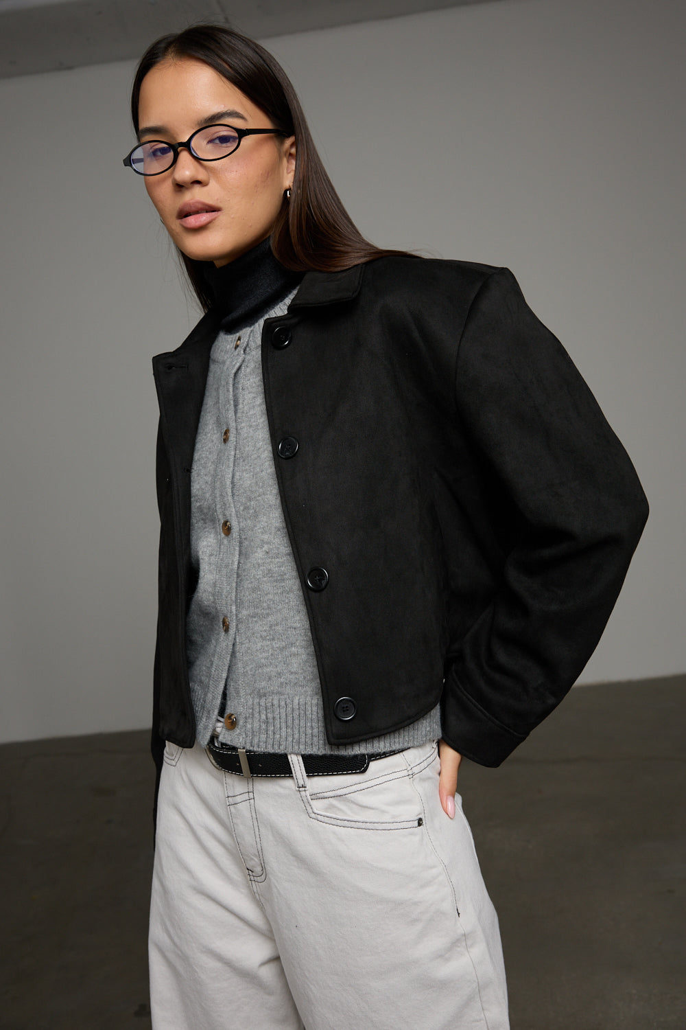 ג'קט בגזרה קרובה לגוף עד קו המותן מבד דמוי זמש בשילוב צווארון קלאסי, סגירת כפתורים מלפנים וצמד כיסים