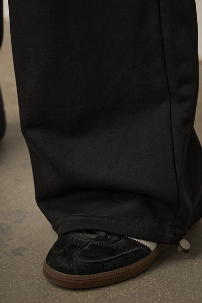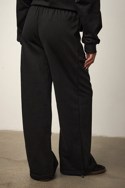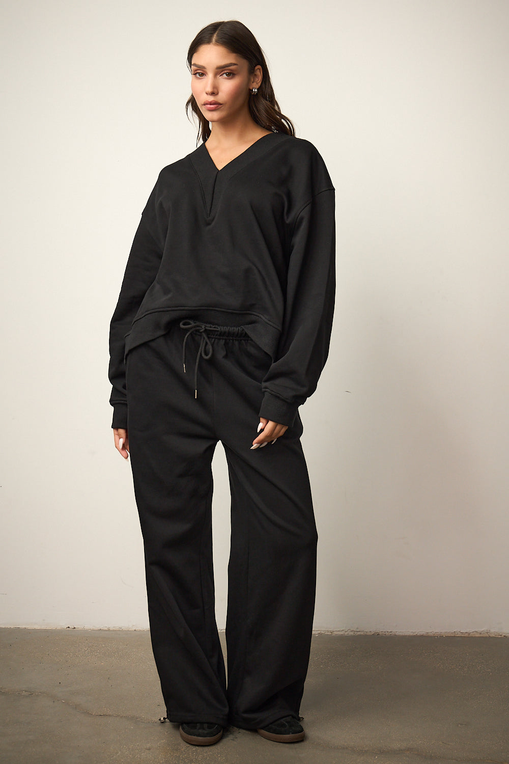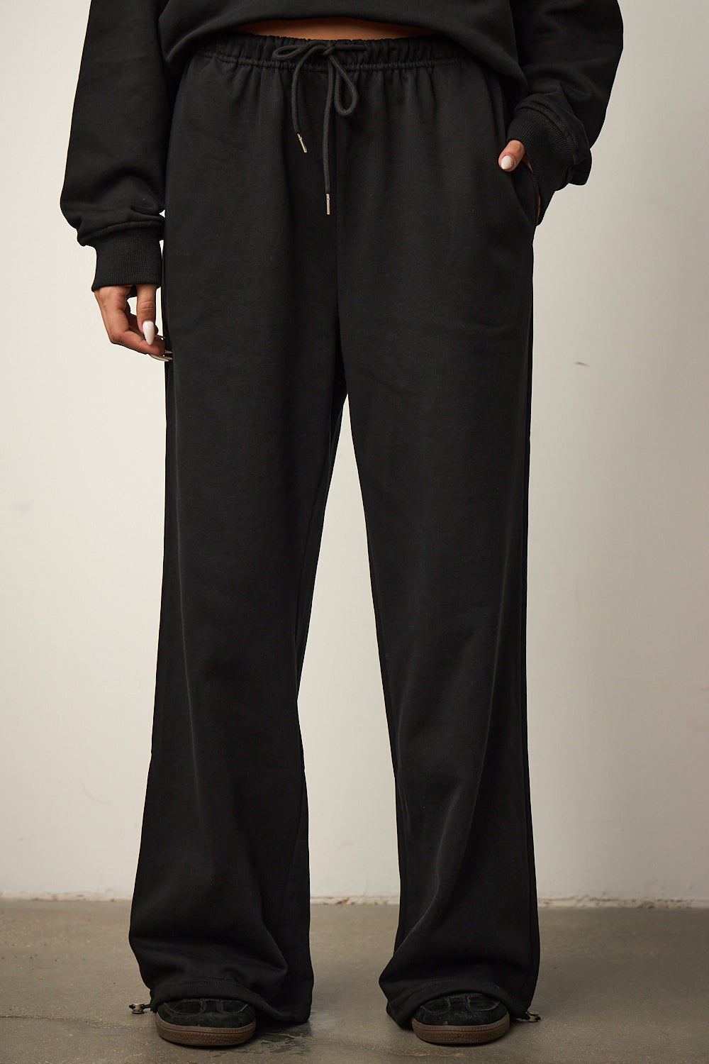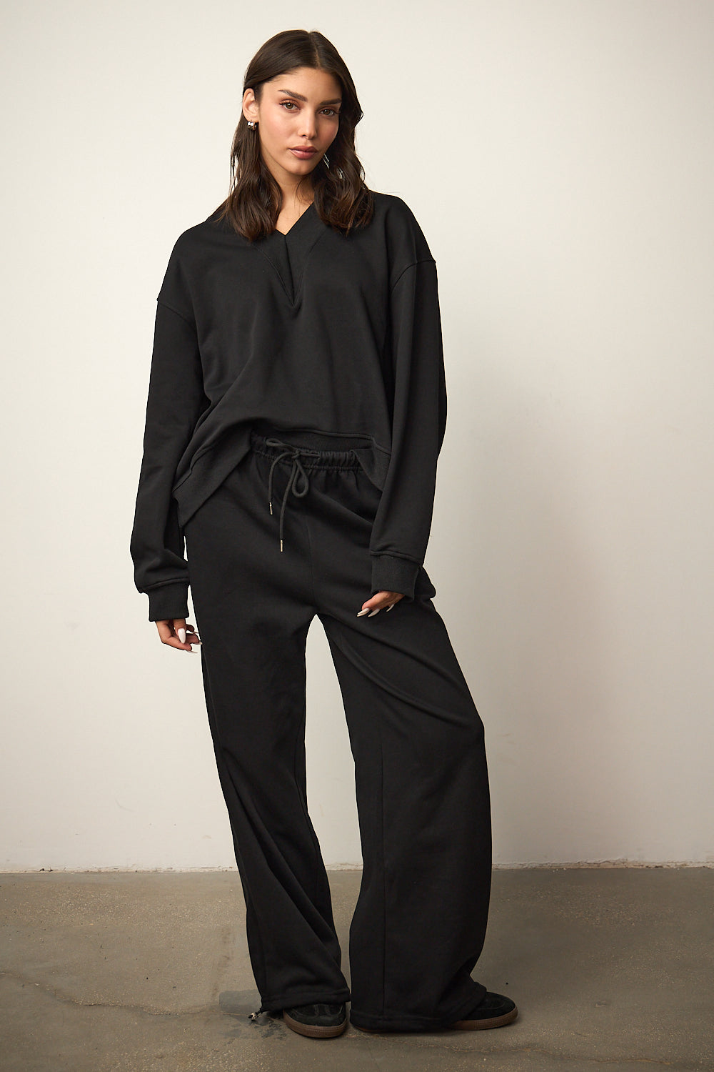 מכנסיים בגזרה ישרה מבד נעים למגע בשילוב מותן אלסטית, שרוך קשירה להידוק, צמד כיסים ומכפלת עם שרוך מתכוונן שלבי עם חולצת קנדי לחליפת בייסיק מושלמת