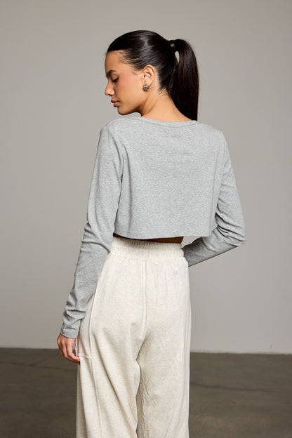 חולצה בגזרת קרופ מבד נעים למגע בשילוב צווארון מעוגל, סגירת כפתורים מלפנים ושרוולים ארוכים עם פתח לאגודל
