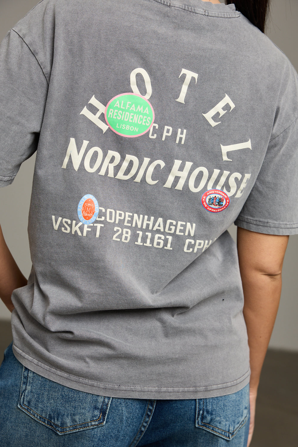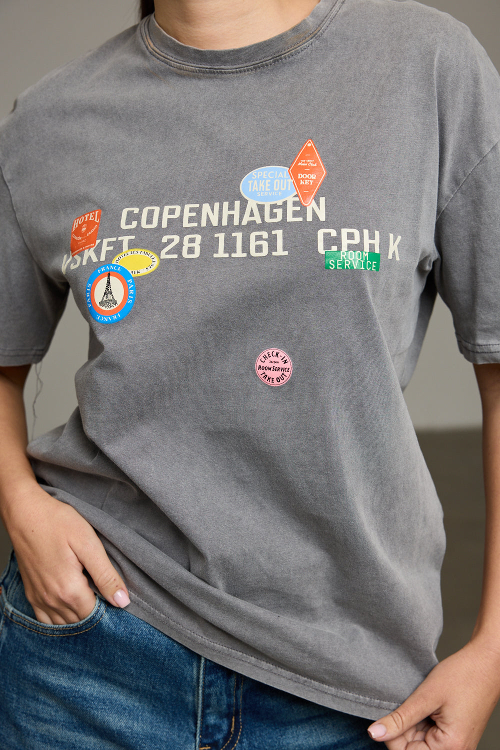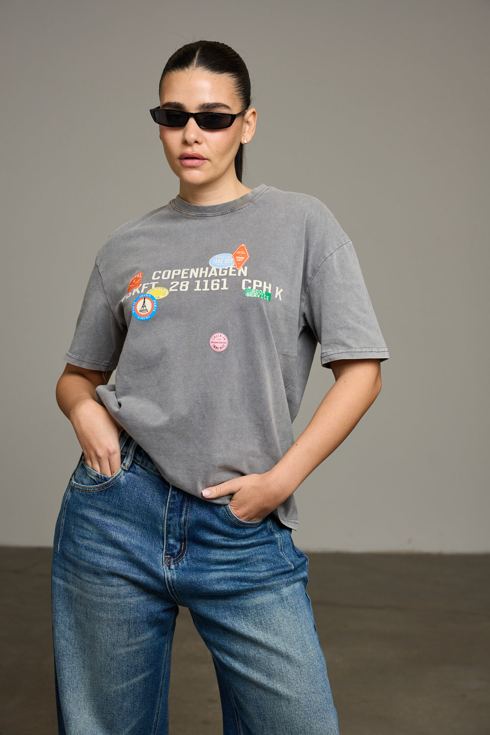 חולצה בגזרה משוחררת מבד נעים צווארון מעוגל והדפס כיתוב עם פאץ קדמי ואחורי