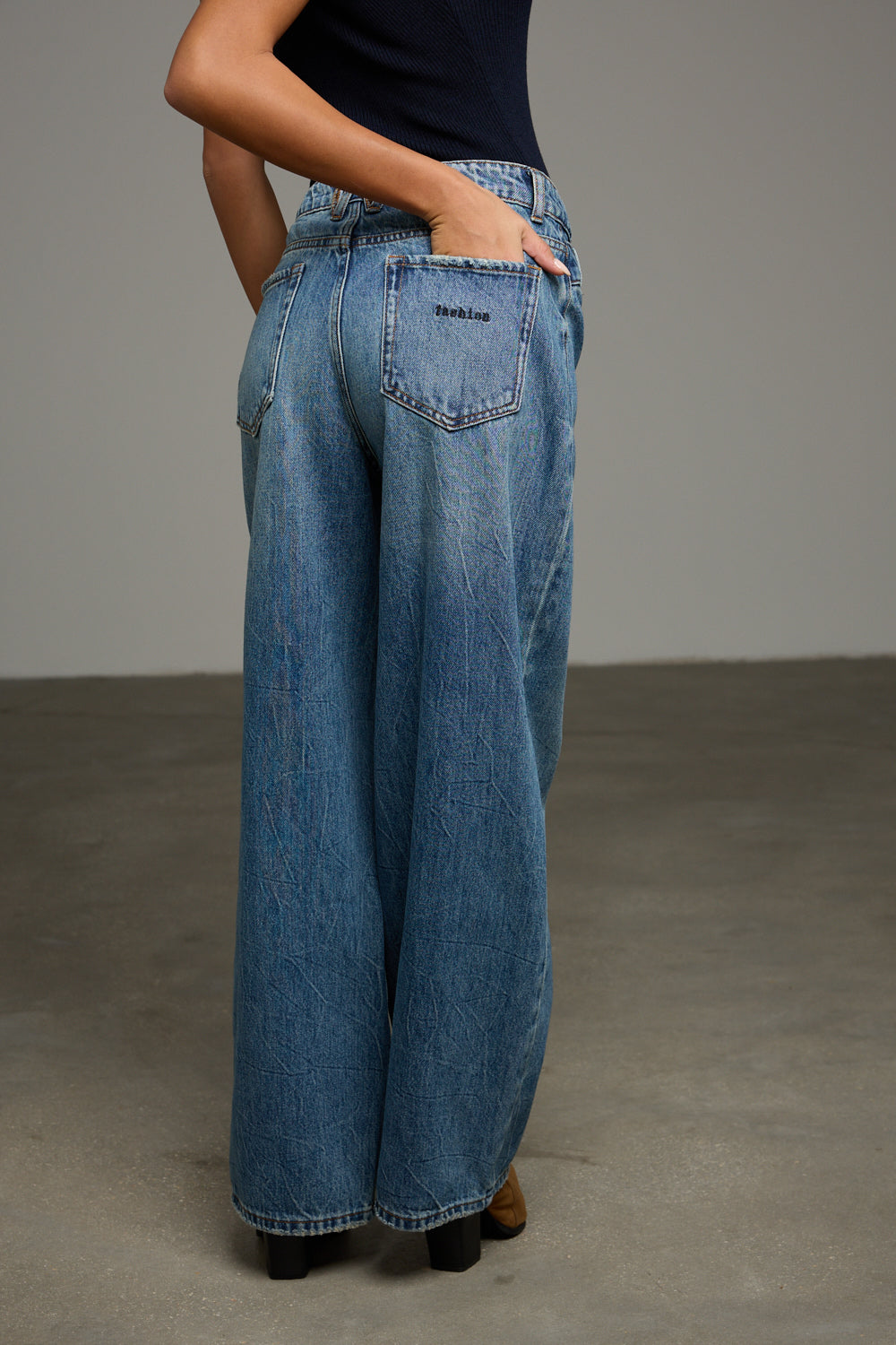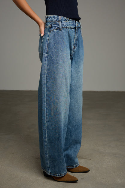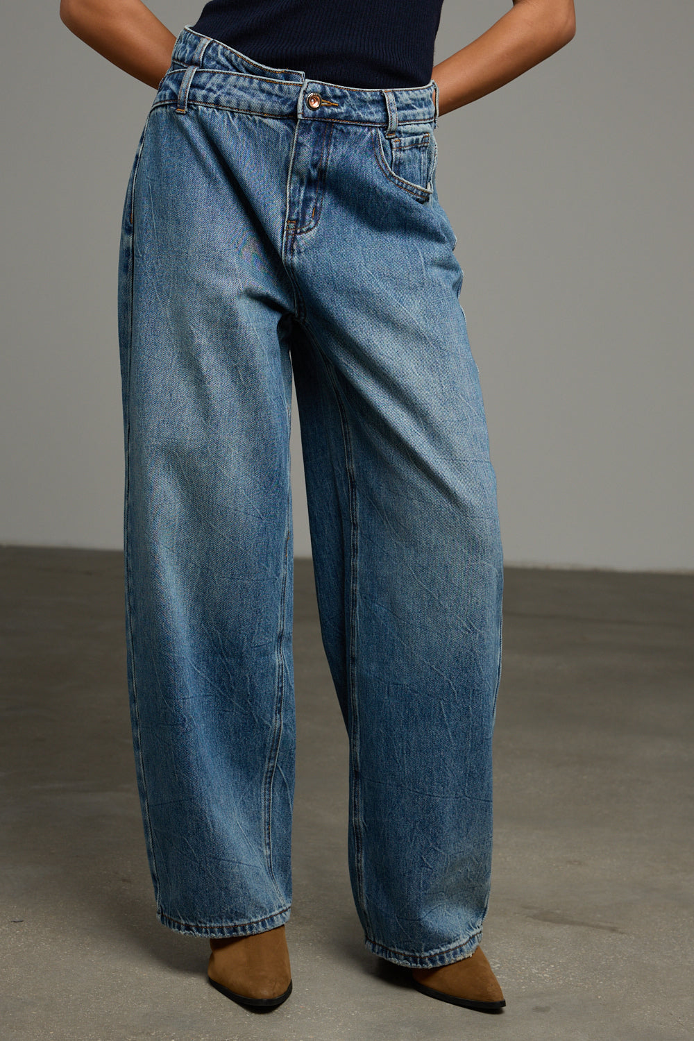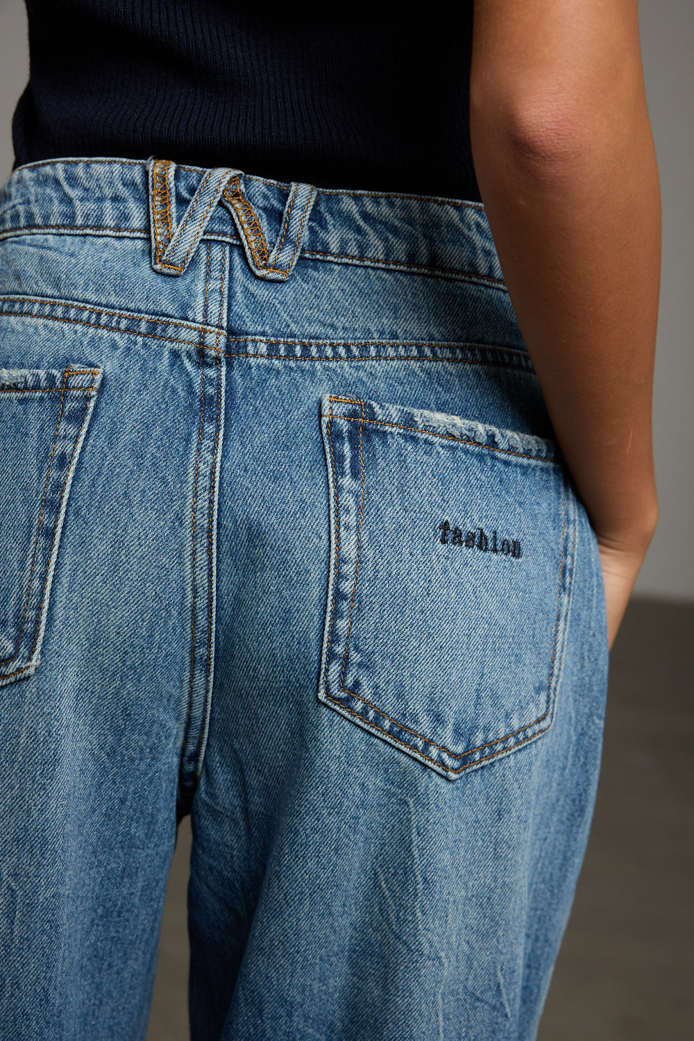 מכנסי ג'ינס בגזרת בויפרנד בשילוב מותן אלכסונית, לולאות לחגורה, ארבעה כיסים וסגירת כפתור עם רוכסן מלפנים