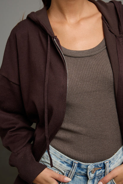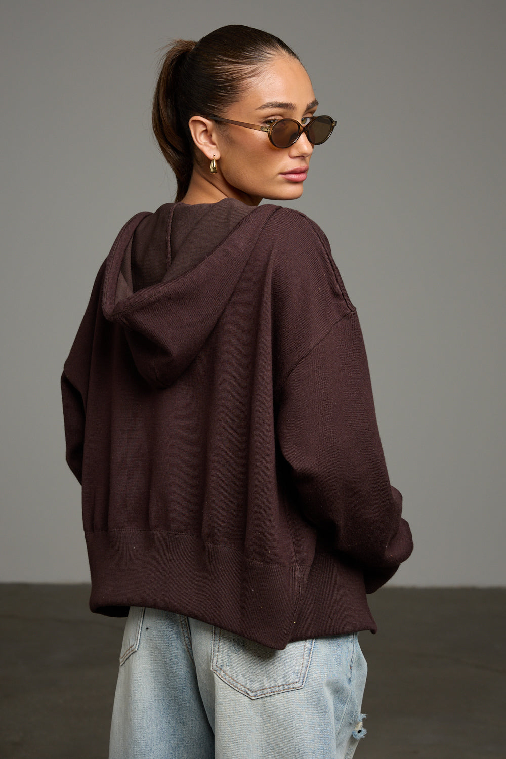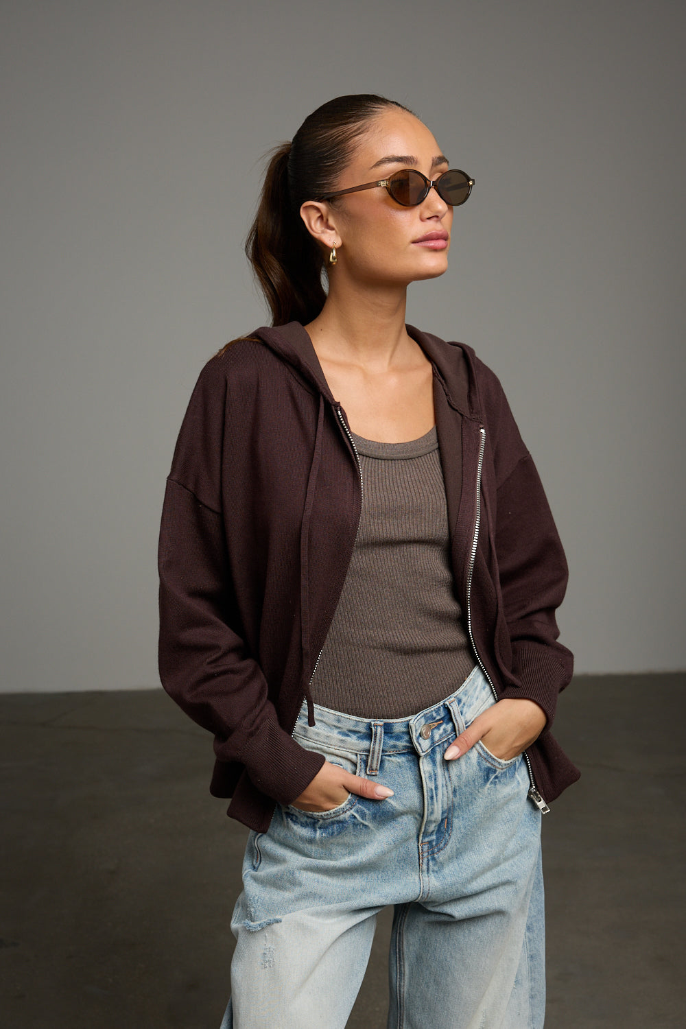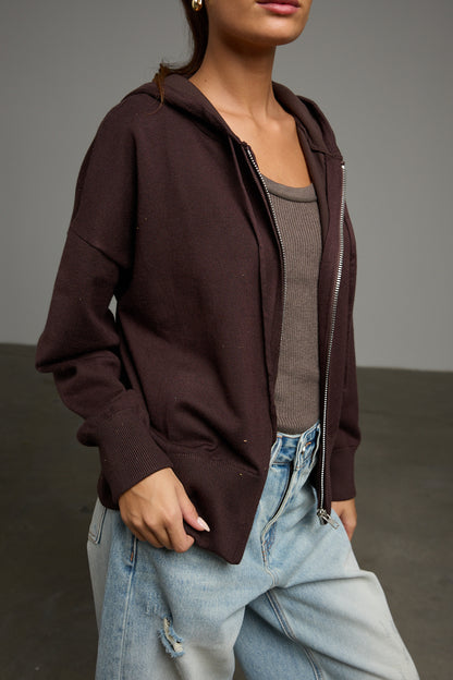 קפוצ'ון בגזרה קרובה לגוף מבד סריג נעים למגע בשילוב כובע עם שרוך קשירה להידוק, צמד כיסים, רוכסן סגירה מלפנים וסיומת מנג'ט