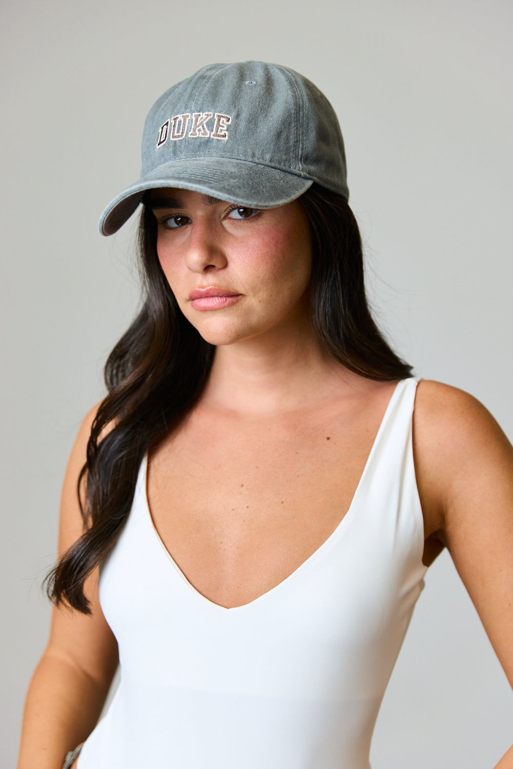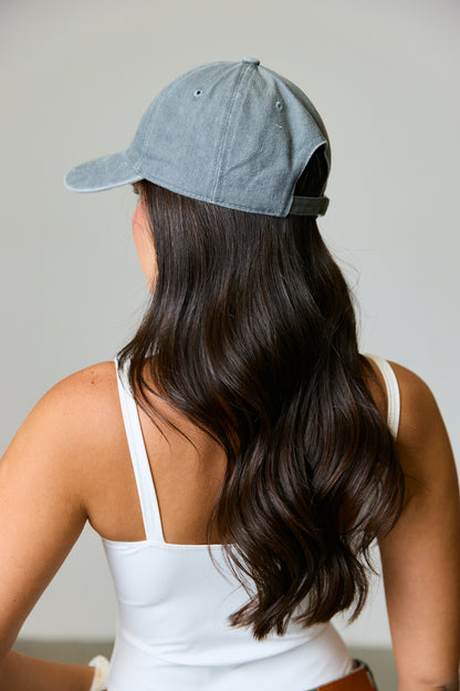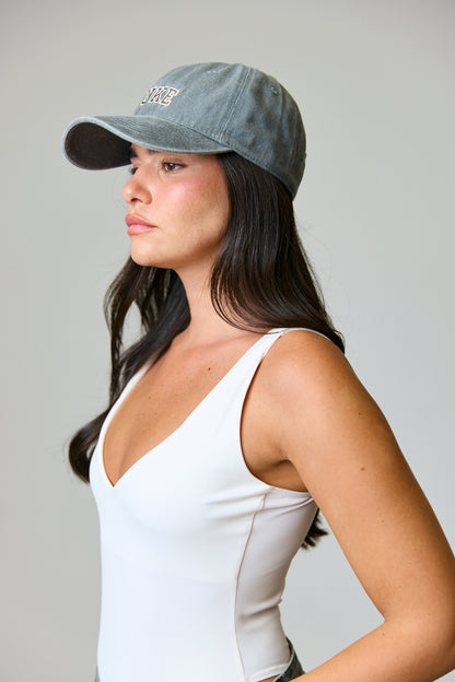 כובע מצחייה מבד ווש עם כיתוב רקמה בחזית וסגירת רצועה מתכווננת מאחור