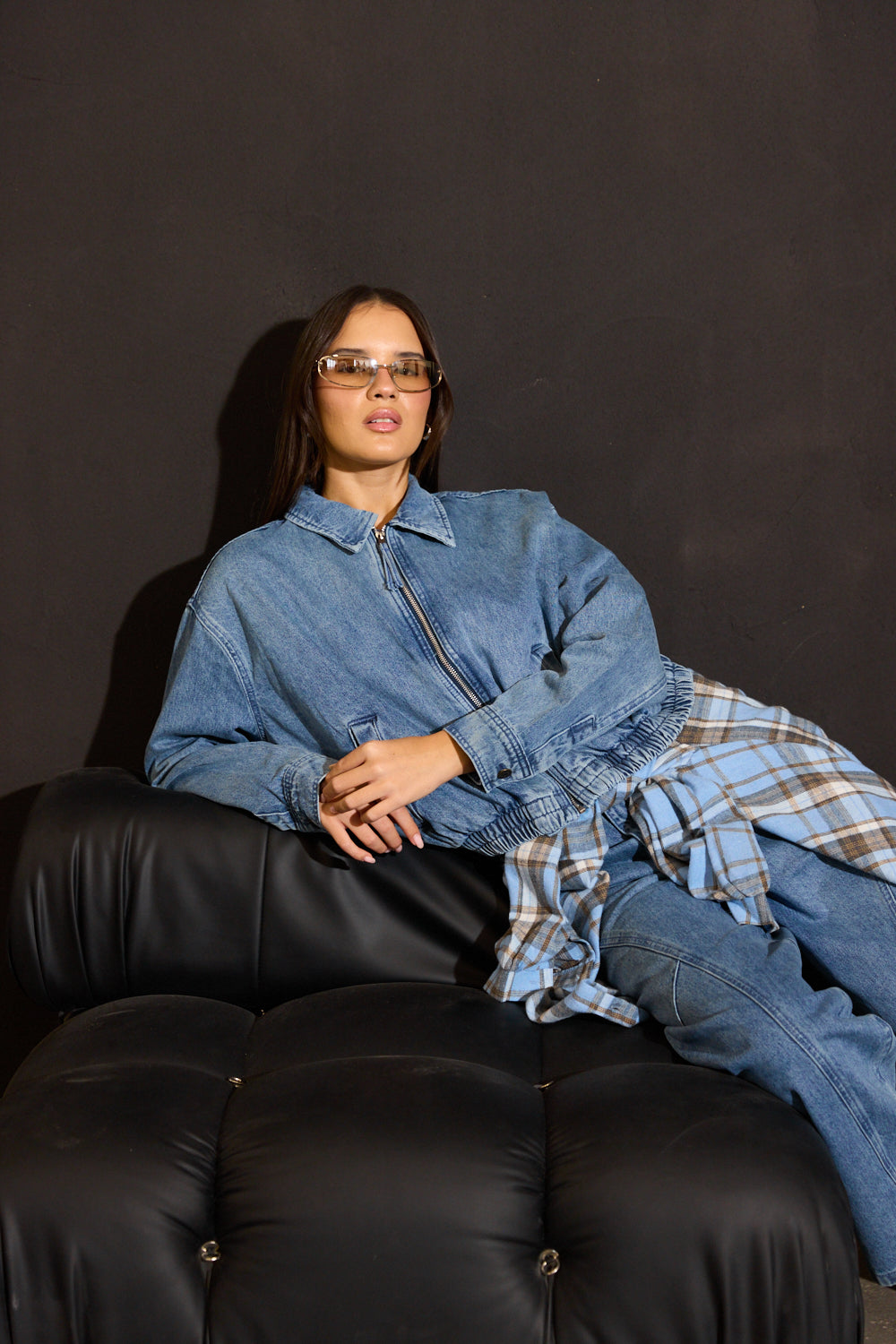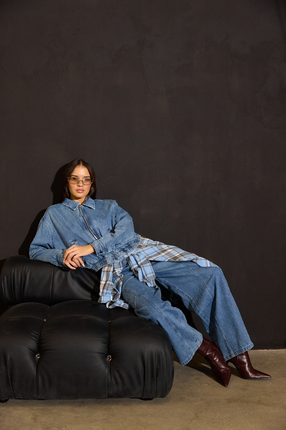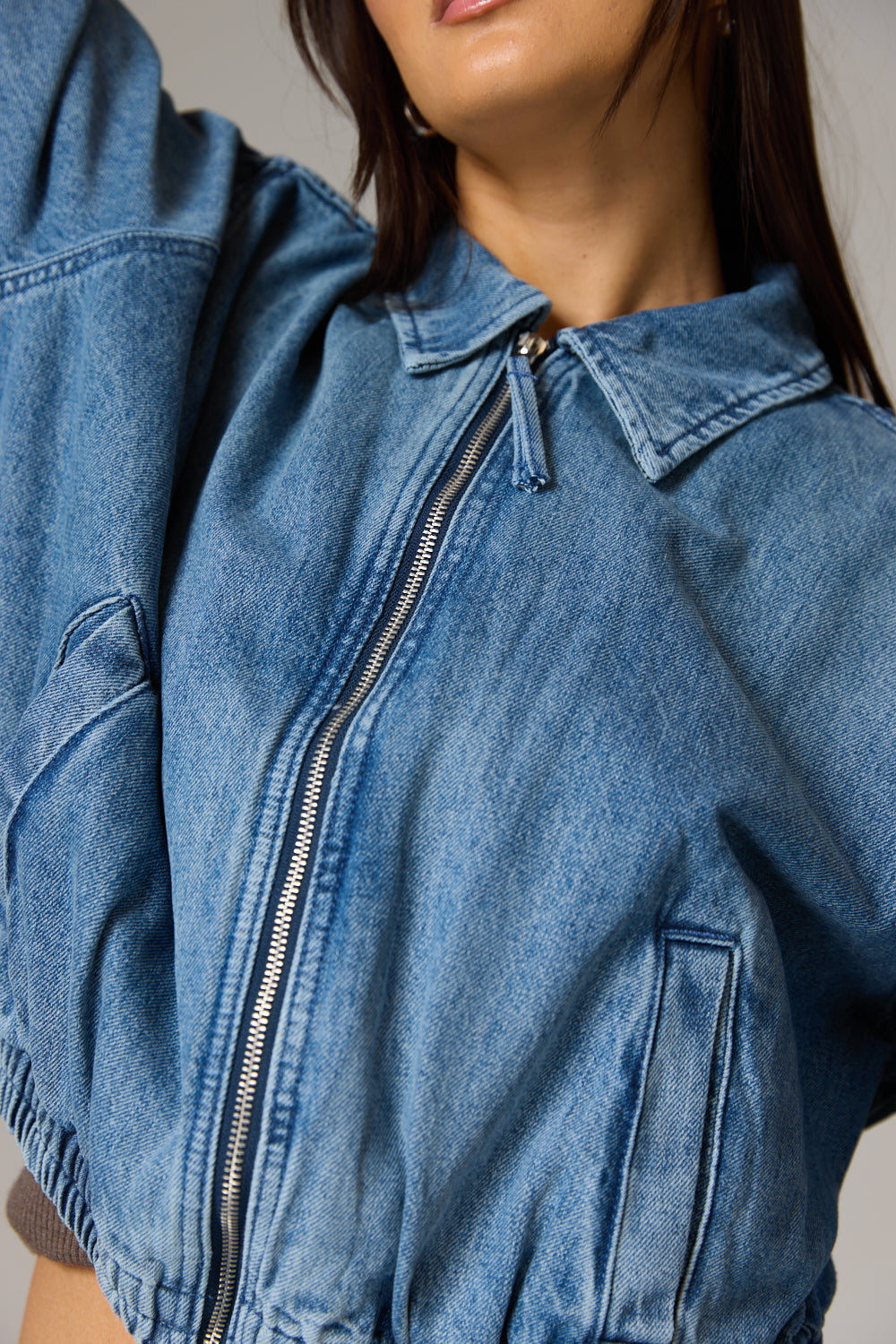 ג'קט בומבר מבד ג'ינס בשילוב רכיסת רוכסן וצווארון קלאסי. שלבי עם ג'ינס אלסי ליצירת חליפת דנים היסטרית!