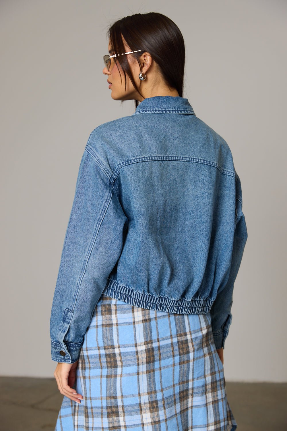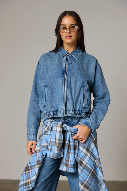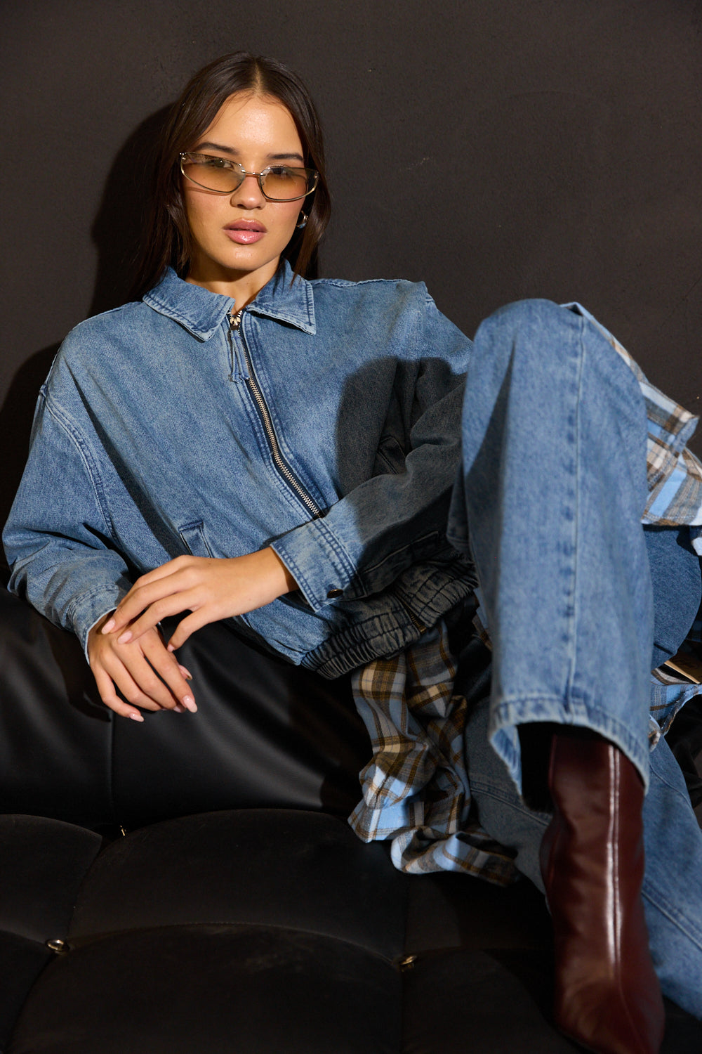 ג'קט בומבר מבד ג'ינס בשילוב רכיסת רוכסן וצווארון קלאסי. שלבי עם ג'ינס אלסי ליצירת חליפת דנים היסטרית!