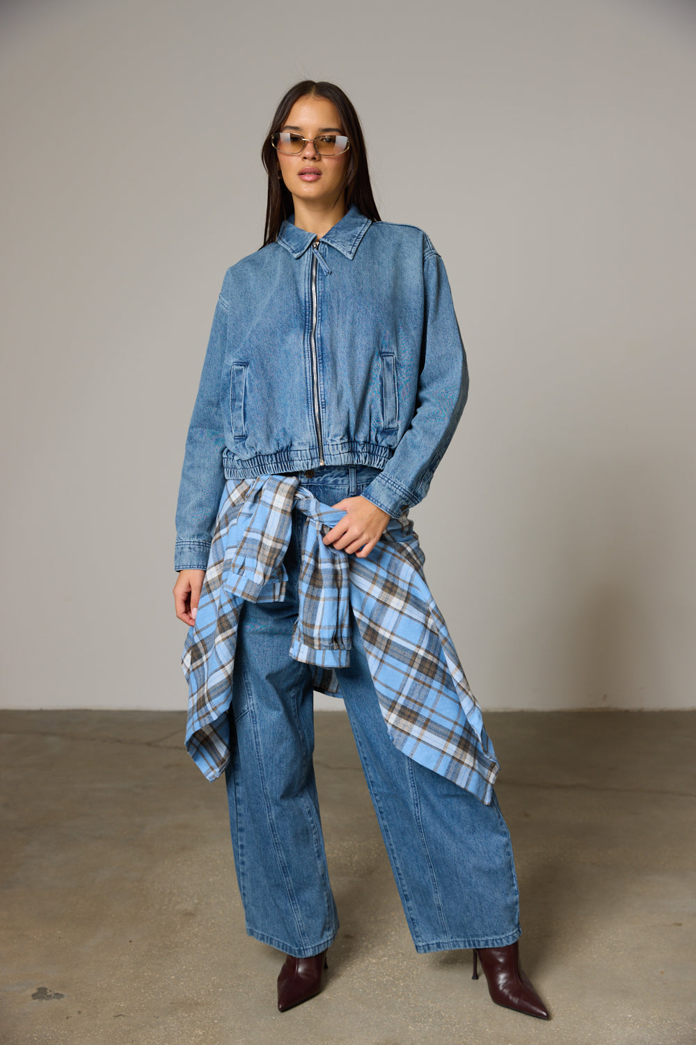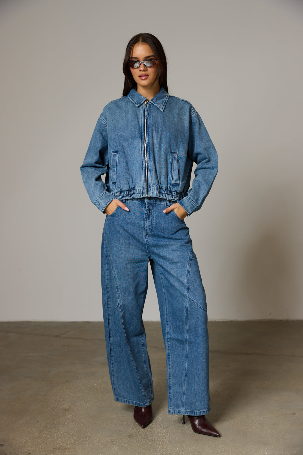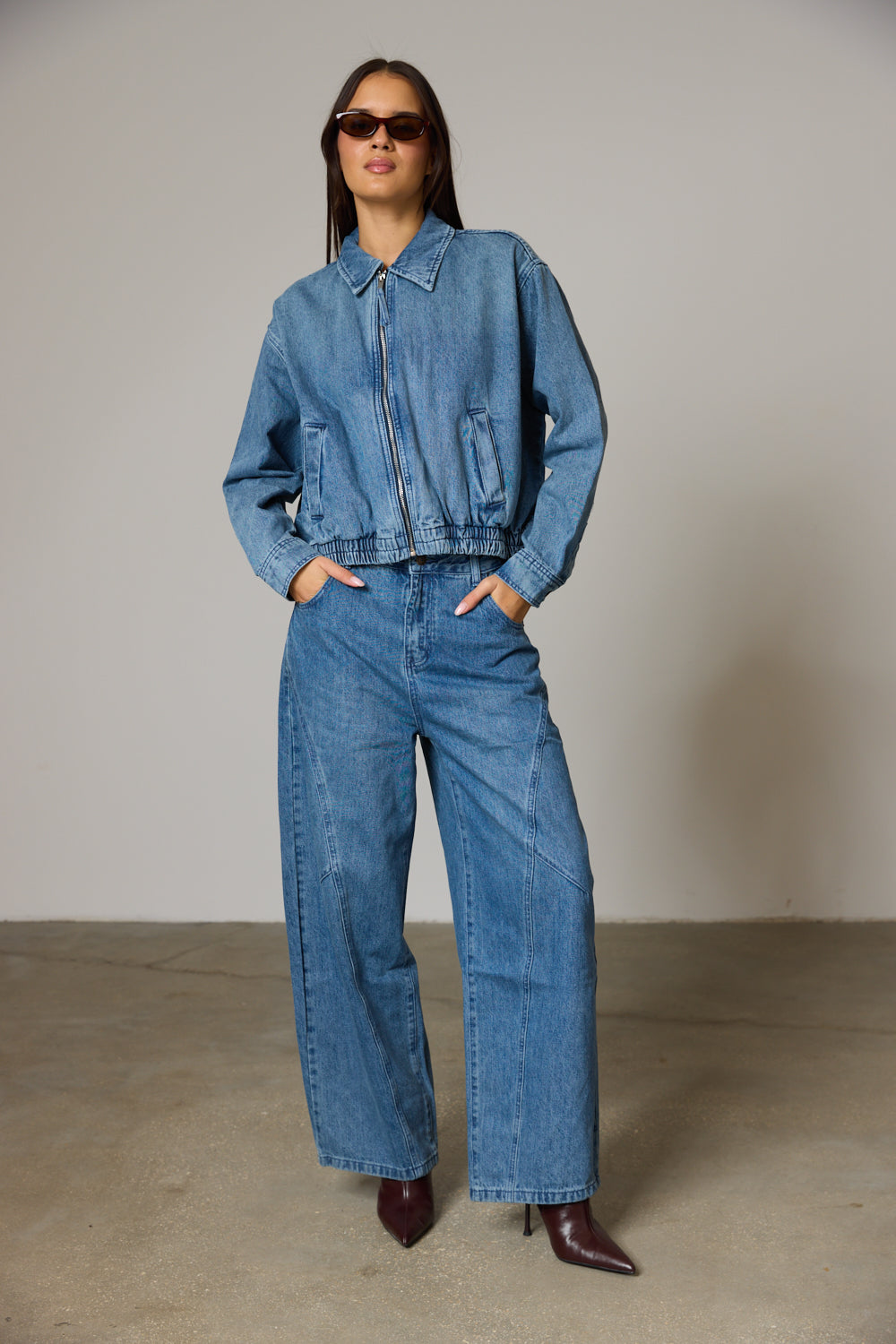 מכנסי ג'ינס ישרים בשילוב תיפורים, חמישה כיסים וסגירת רוכסן עם כפתור. שלבי עם ג'קט אלסי ליצירת חליפת דנים היסטרית!