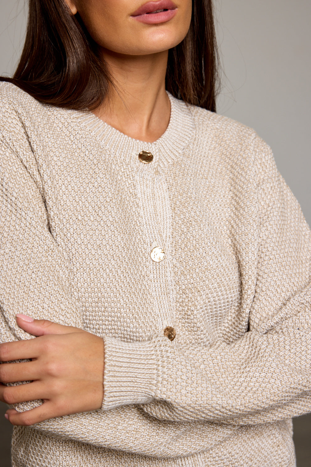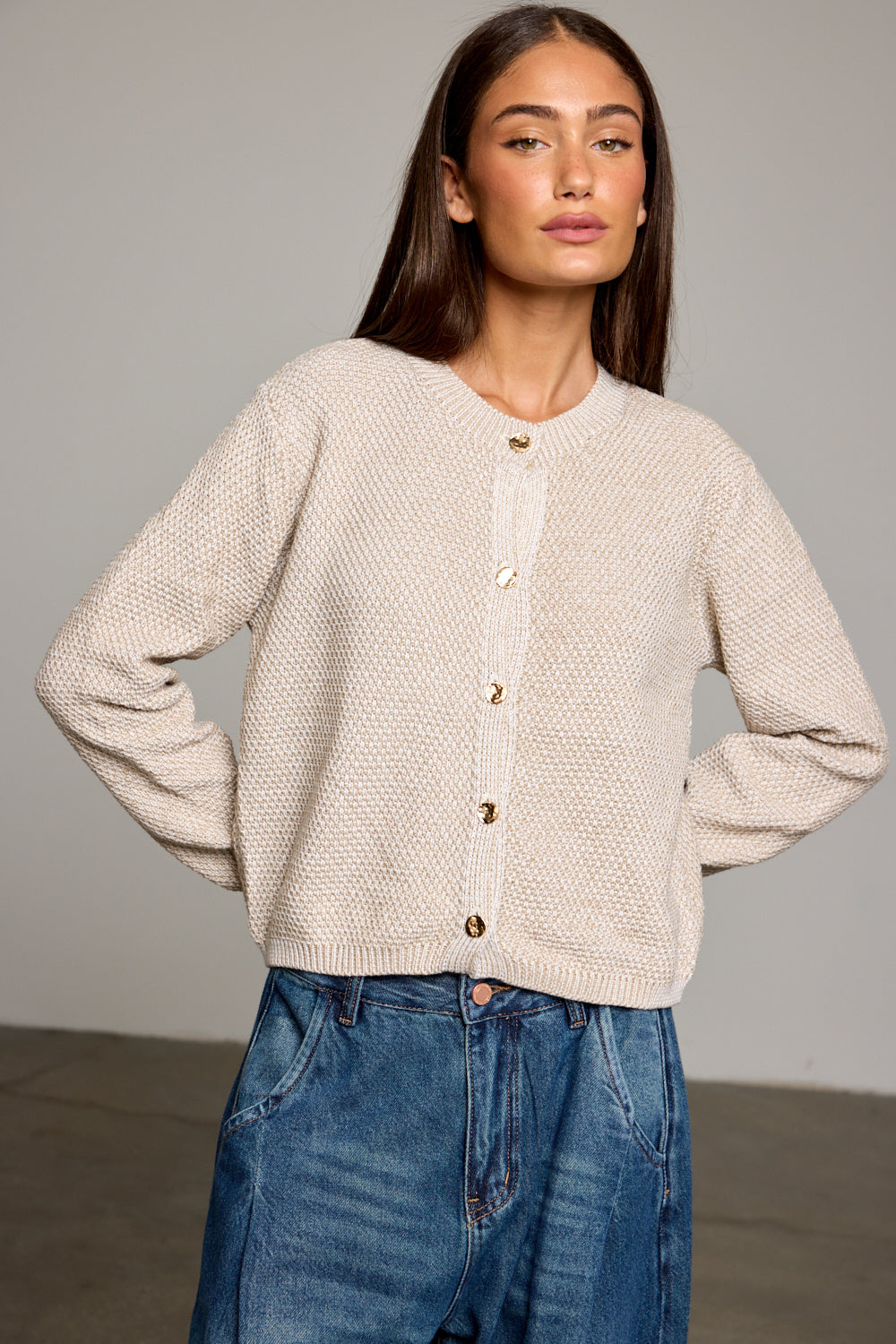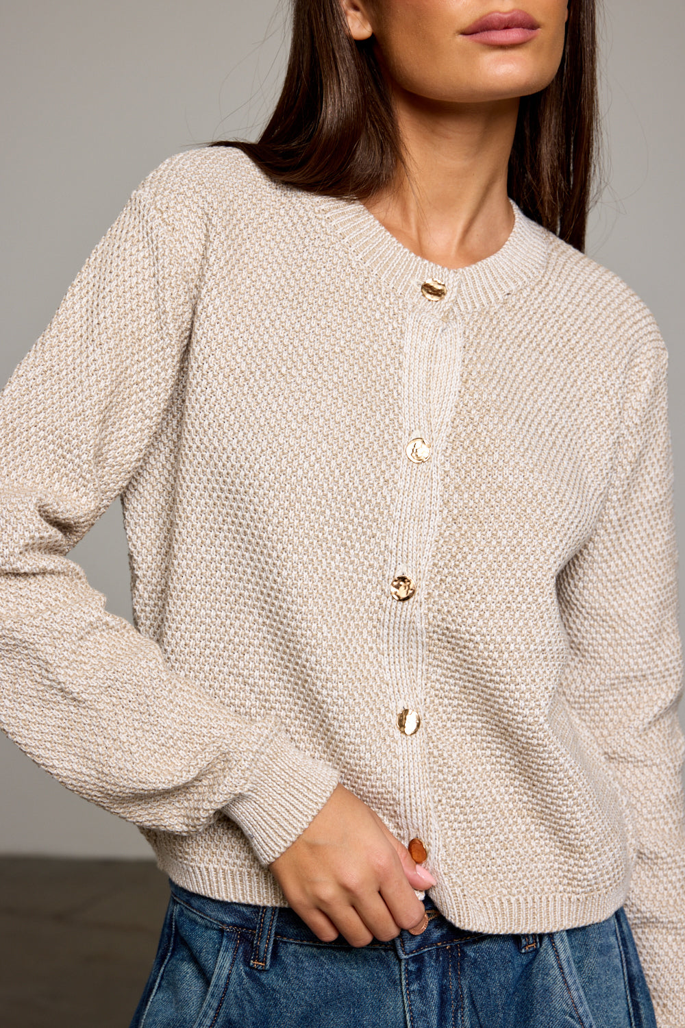 קרדיגן בגזרה קרובה לגוף מבד סריגה צפוף בשילוב צווארון מעוגל, כפתורים מוזהבים מלפנים ושרוולים ארוכים