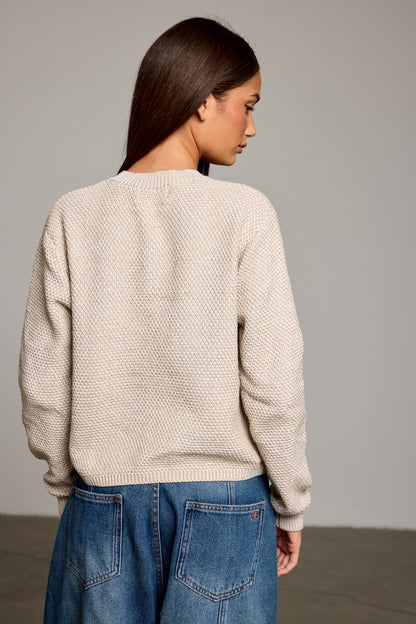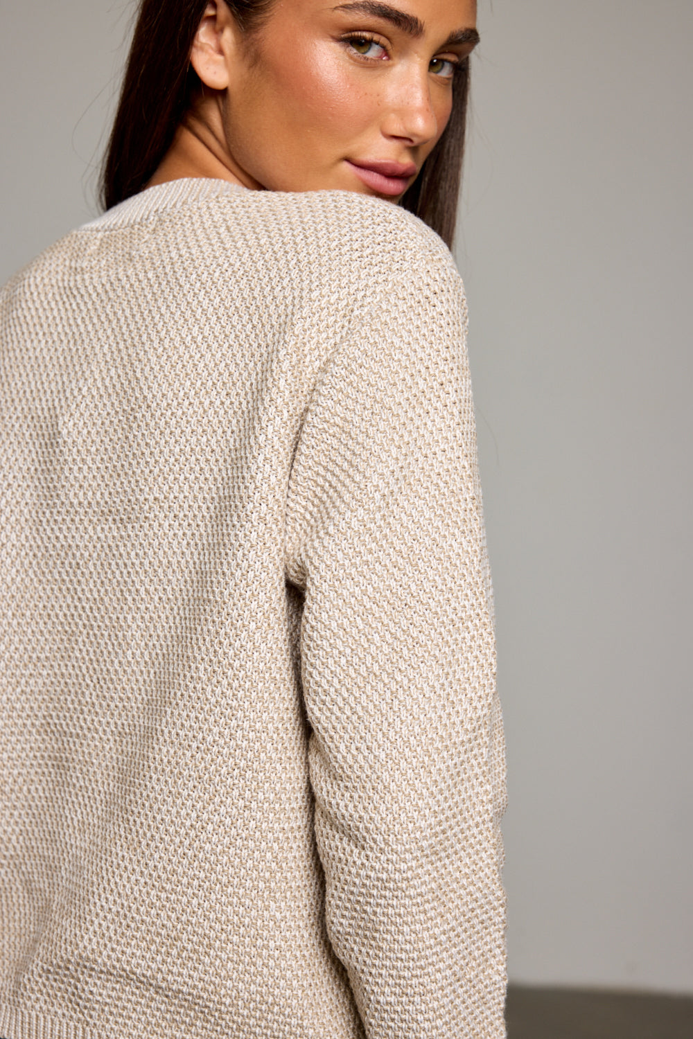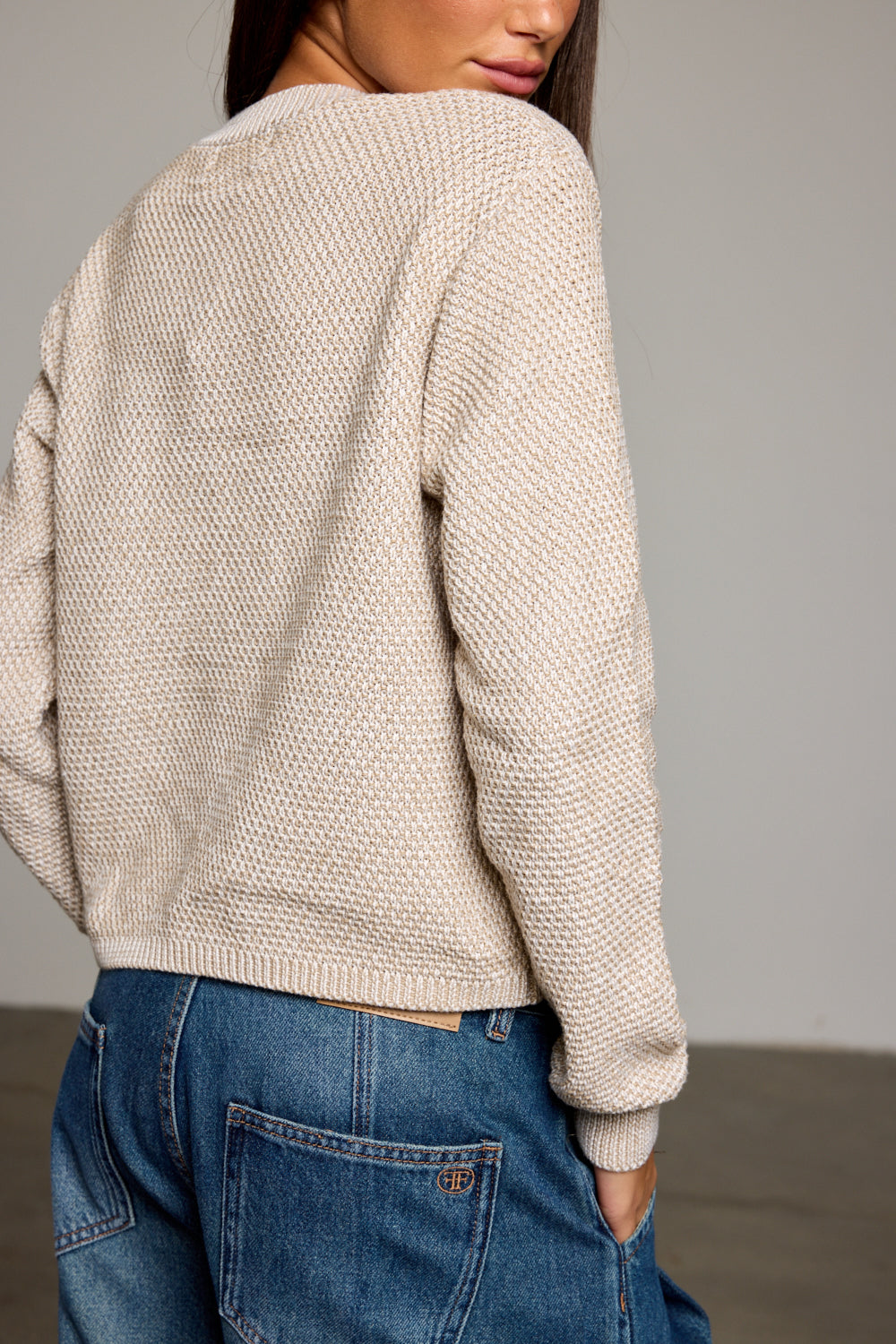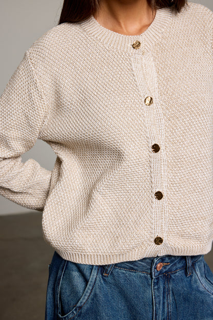 קרדיגן בגזרה קרובה לגוף מבד סריגה צפוף בשילוב צווארון מעוגל, כפתורים מוזהבים מלפנים ושרוולים ארוכים