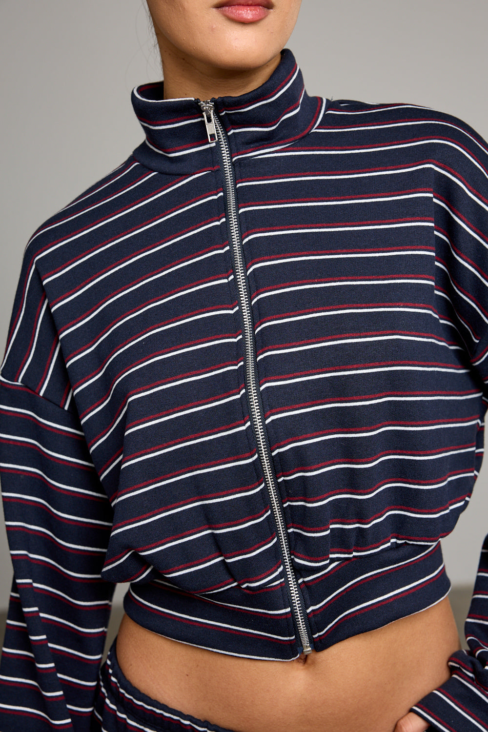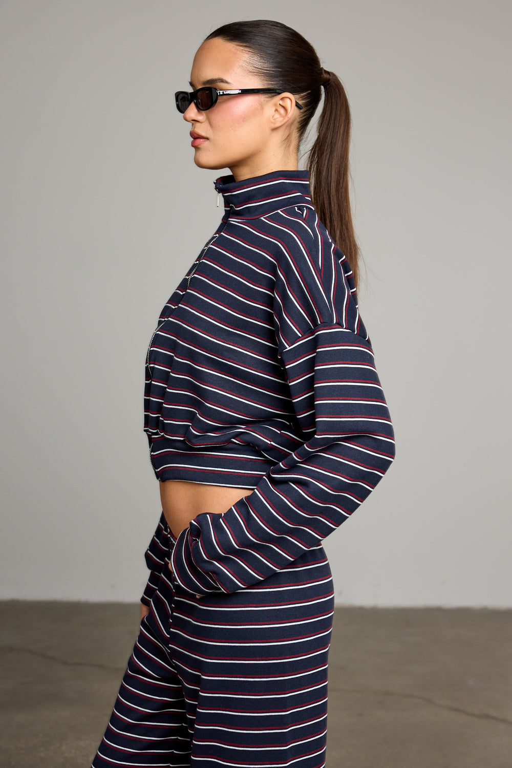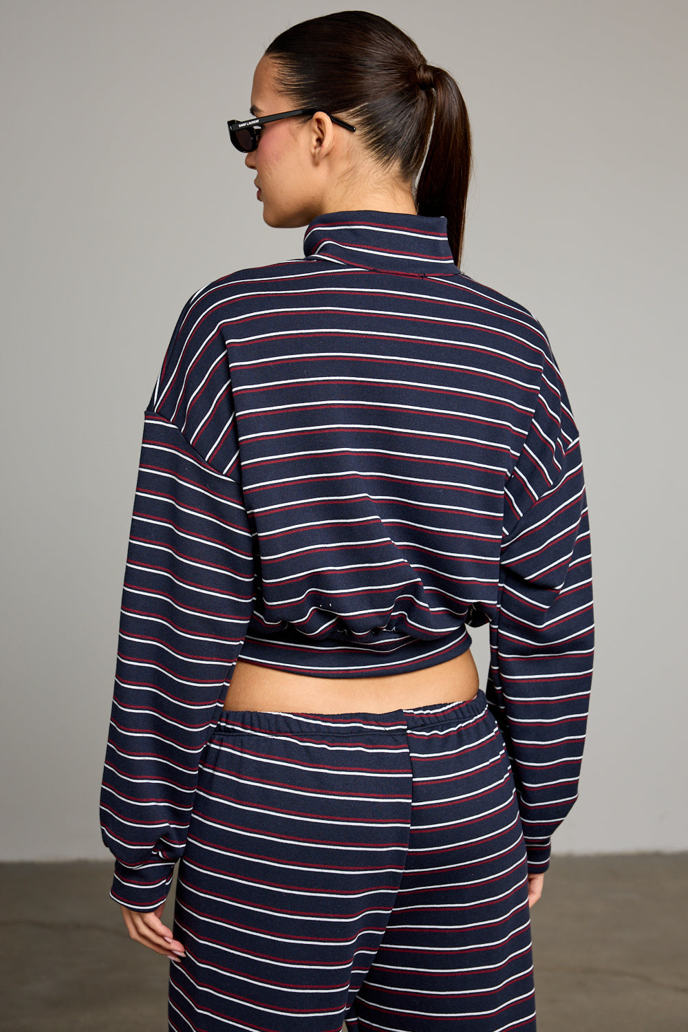 פוטר בגזרה משוחררת מבד פסים נעים למגע בשילוב צווארון גולף גבוה, כיווצים במותן וסגירת רוכסן. שלבי עם מכנסי אלין ליצירת לוק בייסיק מושלם!