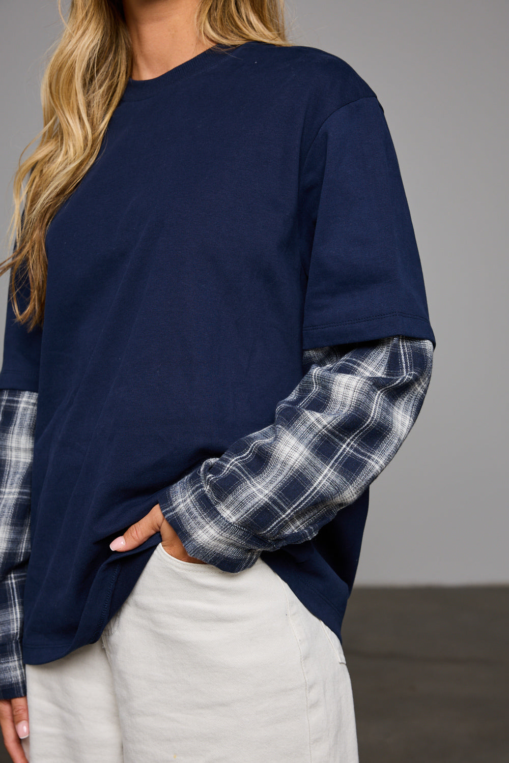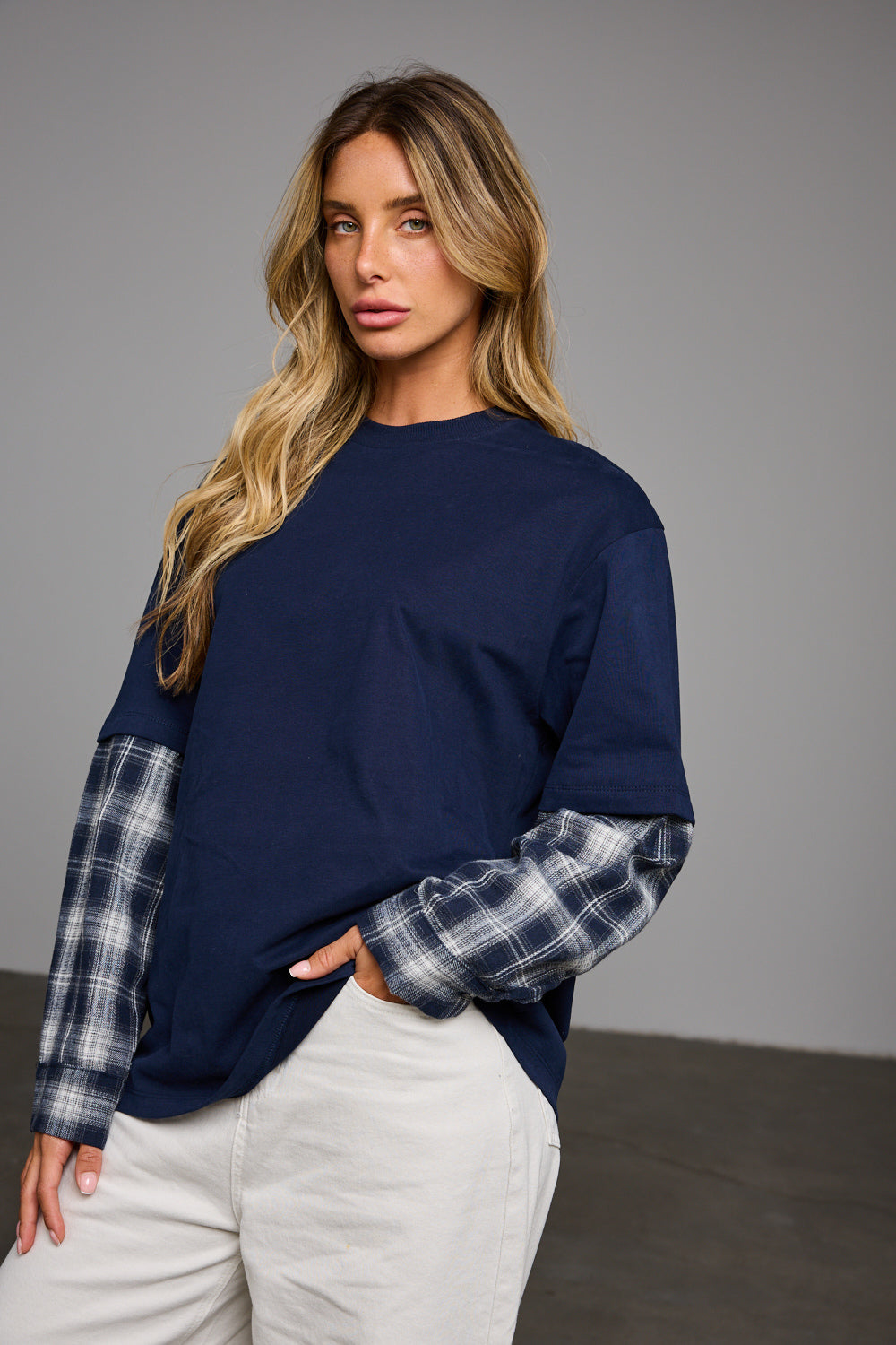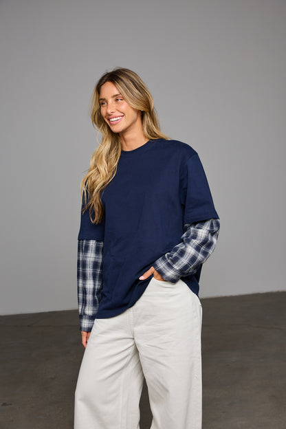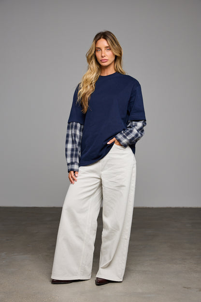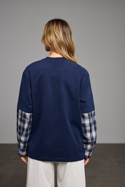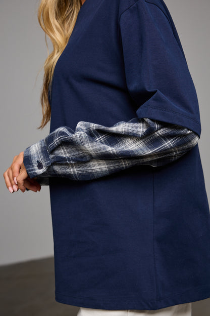 חולצה בגזרת אוברסייז מבד נעים ורך למגע בשילוב צווארון מעוגל, שרוולים מנוגדים בדמוי מכופתרת