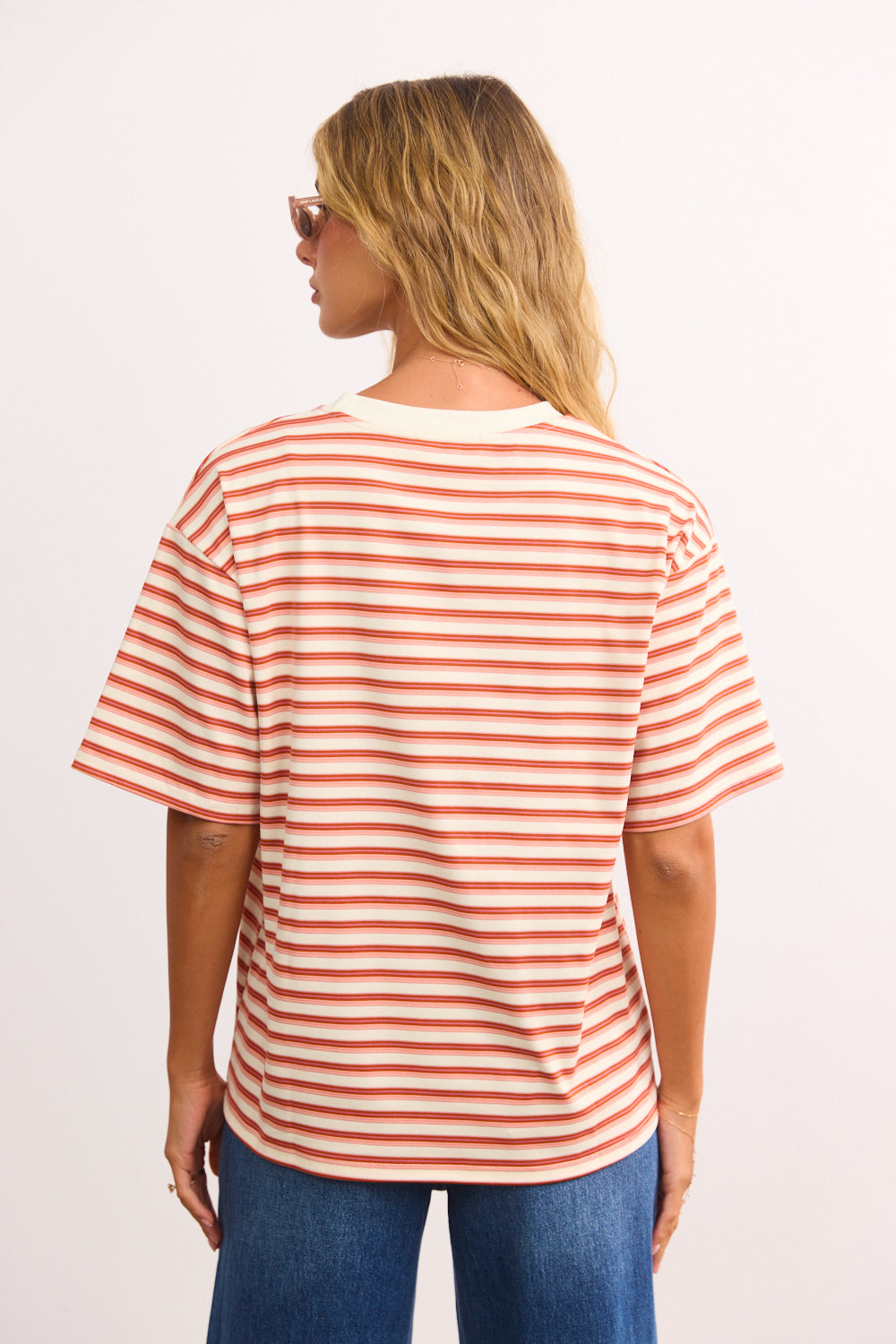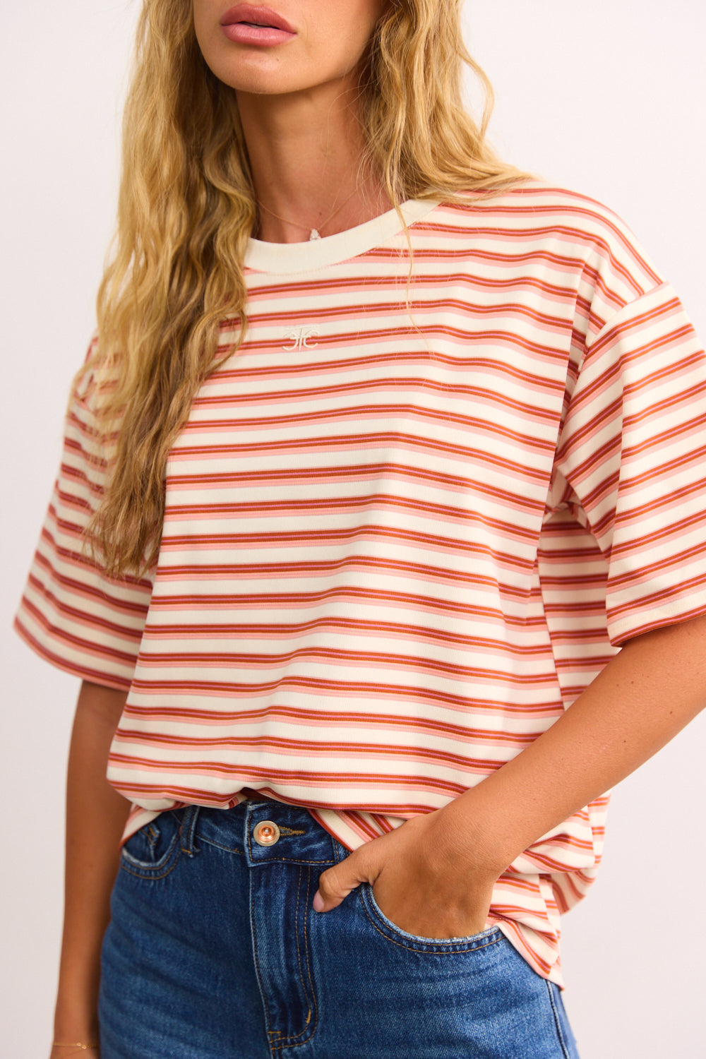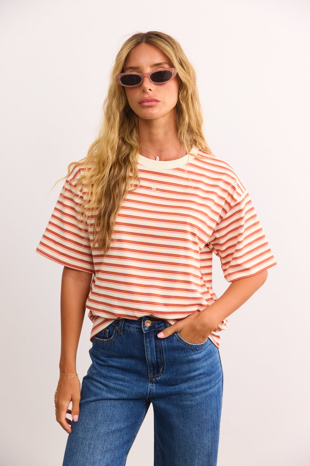 חולצה בגזרת אוברסייז מבד נעים למגע עם טקסטורת פסים, מפתח צווארון עגול ושרוולים קצרים. לחולצה לוגו רקום מלפנים