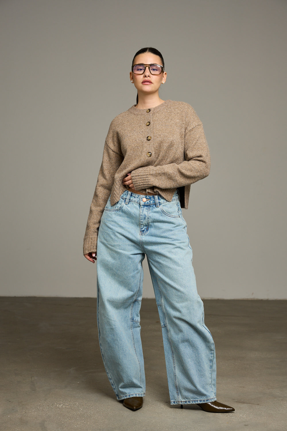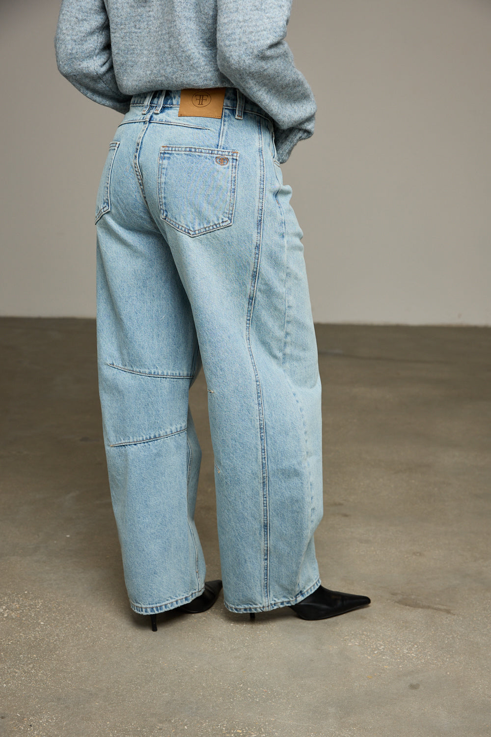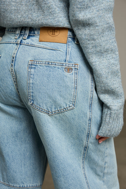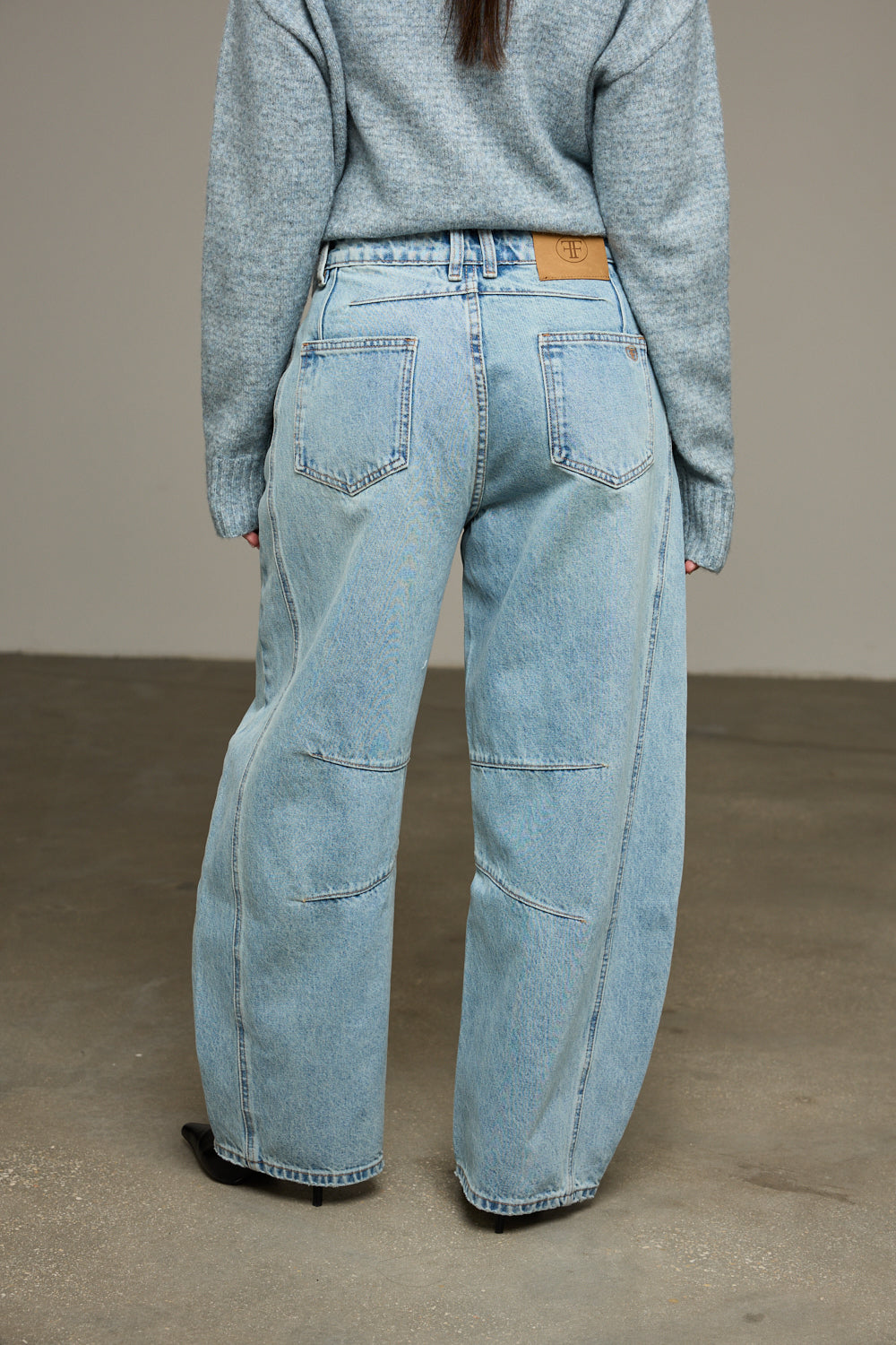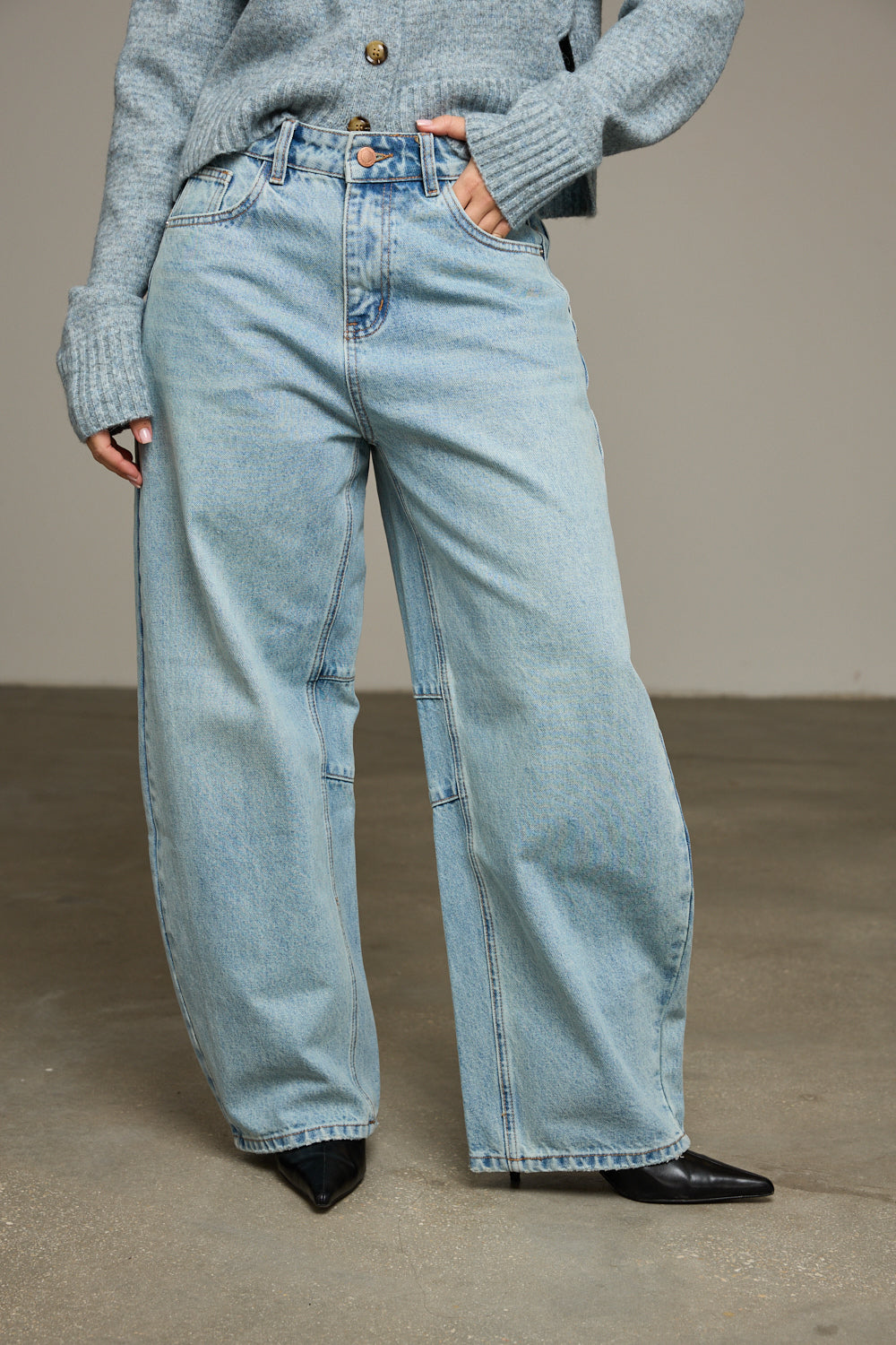 מכנסי ג'ינס בגזרה בלון משוחררים בשילוב תפרי צד אלכסוניים, לולאות לחגורה, חמישה כיסים, תפרים עיצוביים וסגירת כפתור עם רוכסן מלפנים