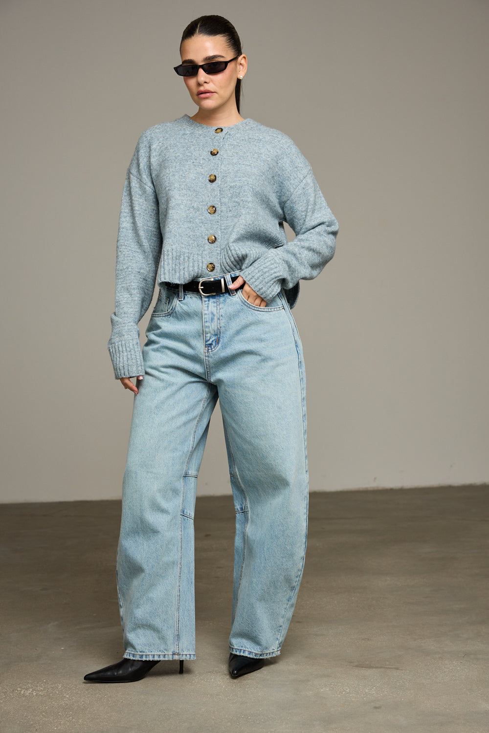 מכנסי ג'ינס בגזרה בלון משוחררים בשילוב תפרי צד אלכסוניים, לולאות לחגורה, חמישה כיסים, תפרים עיצוביים וסגירת כפתור עם רוכסן מלפנים