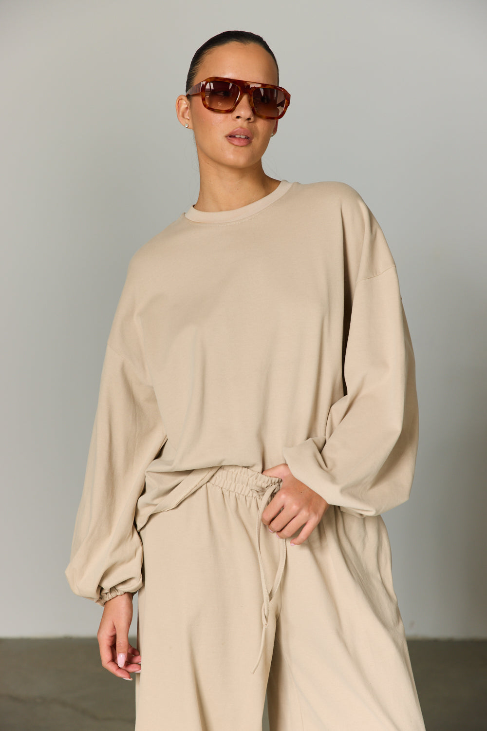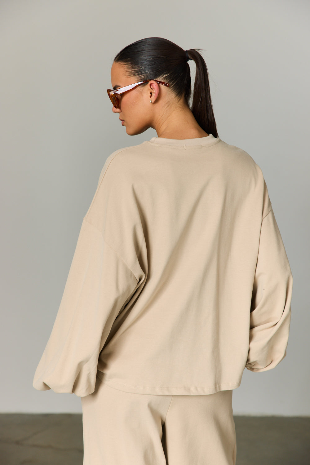 חולצה בגזרה משוחררת מבד נעים ורך למגע בשילוב שרוולים תפוחים וצווארון מעוגל. שלבי עם מכנסי קטי ליצירת לוק נינוח ויפה