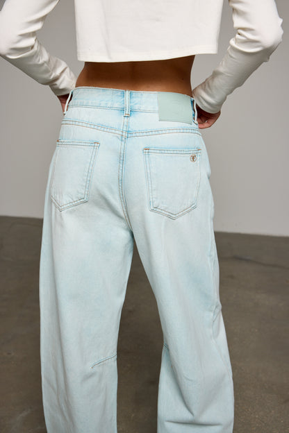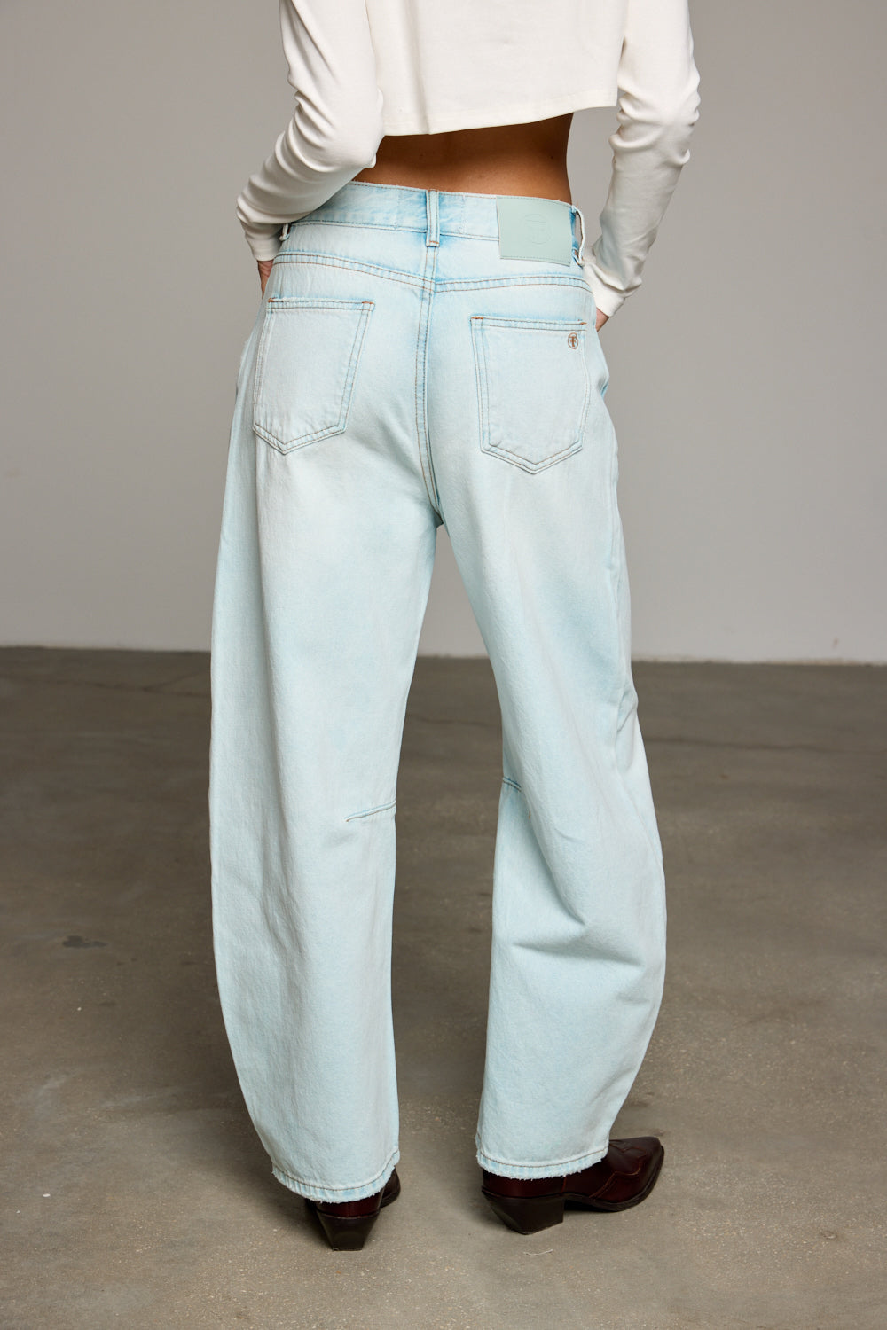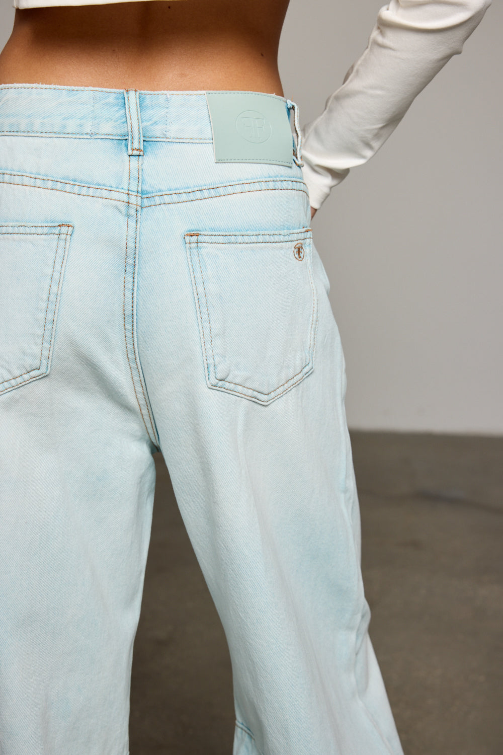 ג'ינס בגזרת בויפרנד בשילוב שטיפה, חמישה כיסים, לולאות לחגורה, תפרים דקורטיבים וסגירת כפתור עם רוכסן