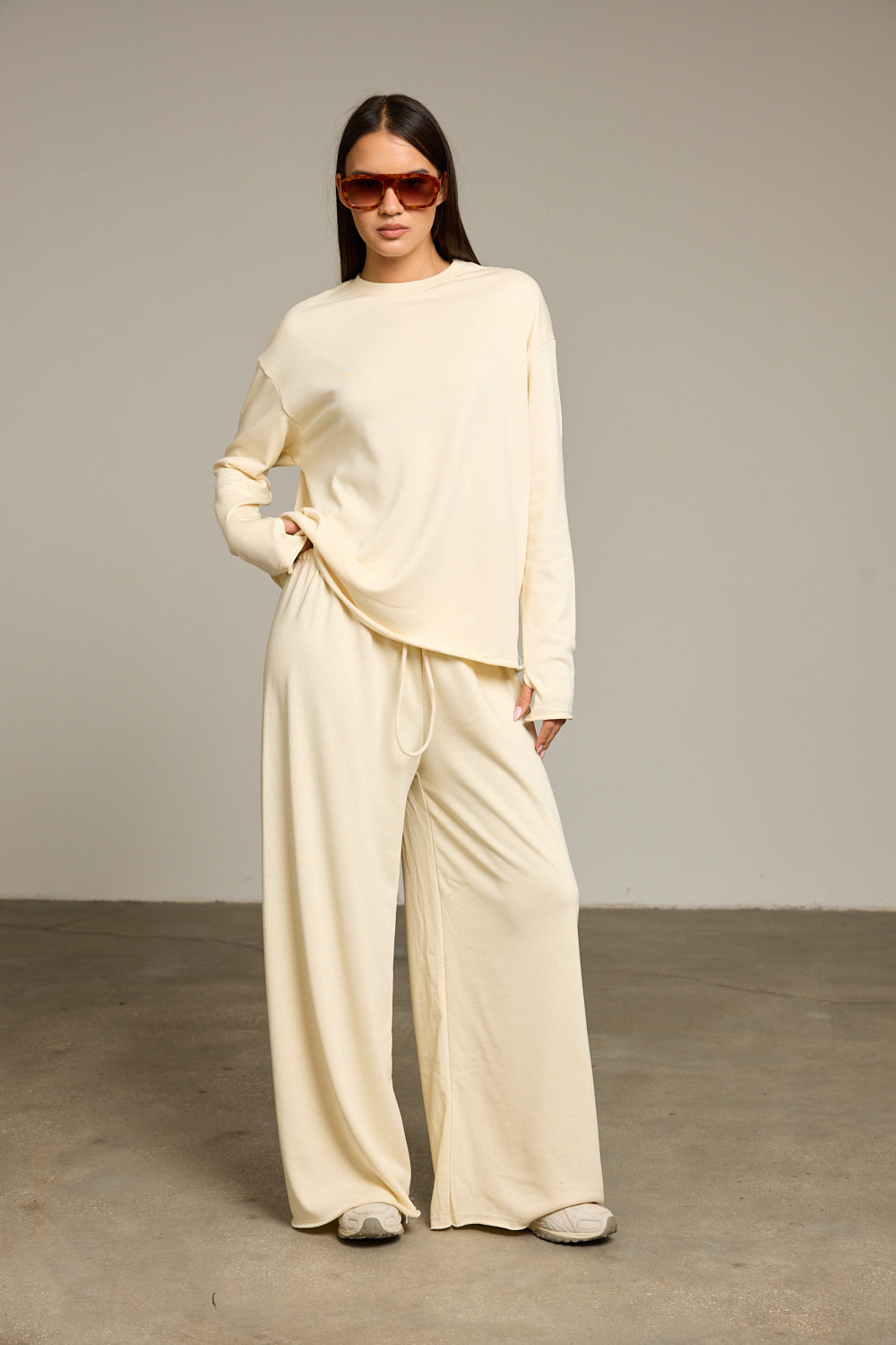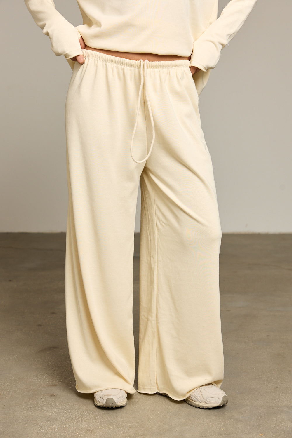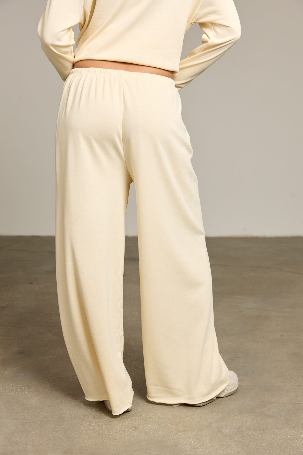 מכנסיים בגזרה גבוה ומתרחבת בשילוב מותן אלסטית צרה, שרוך קשירה פנימי להידוק וסיומת גזורה. שלבי עם חולצת לאמר ללוק בייסיק הכי שווה!