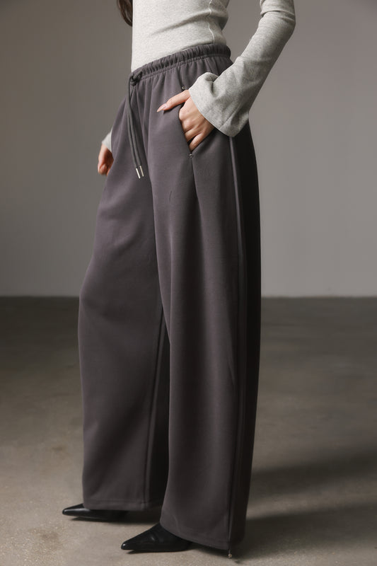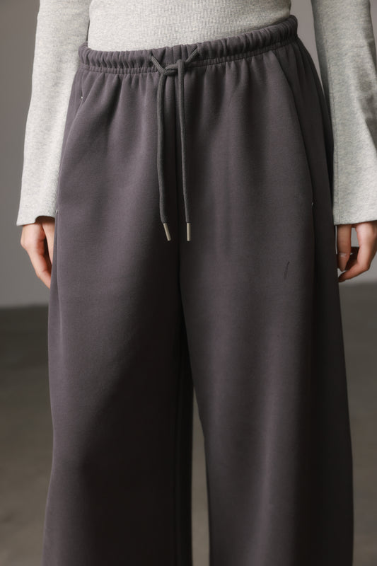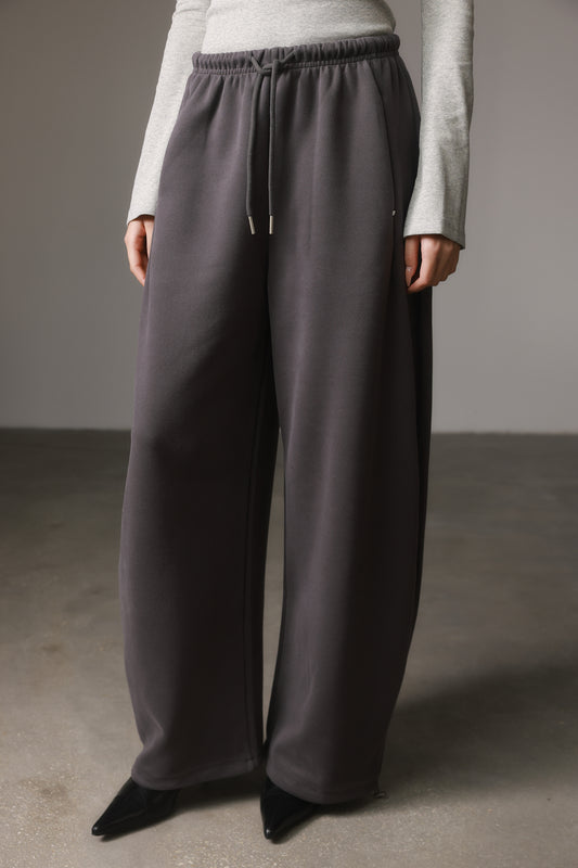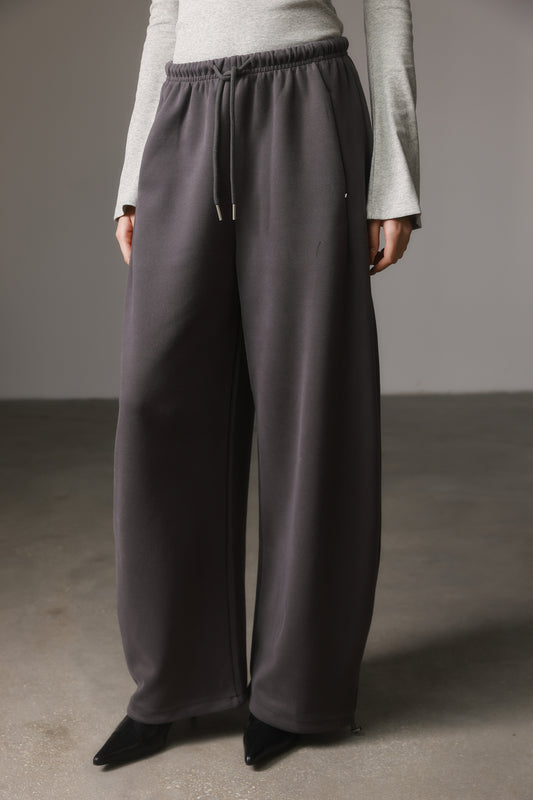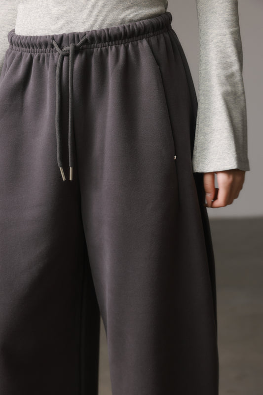 מכנסי בלון בגזרה משוחררת מבד נעים למגע עם טקסטורה מנומרת בשילוב מותן אלסטית, שרוך קשירה ומכפלת גומי