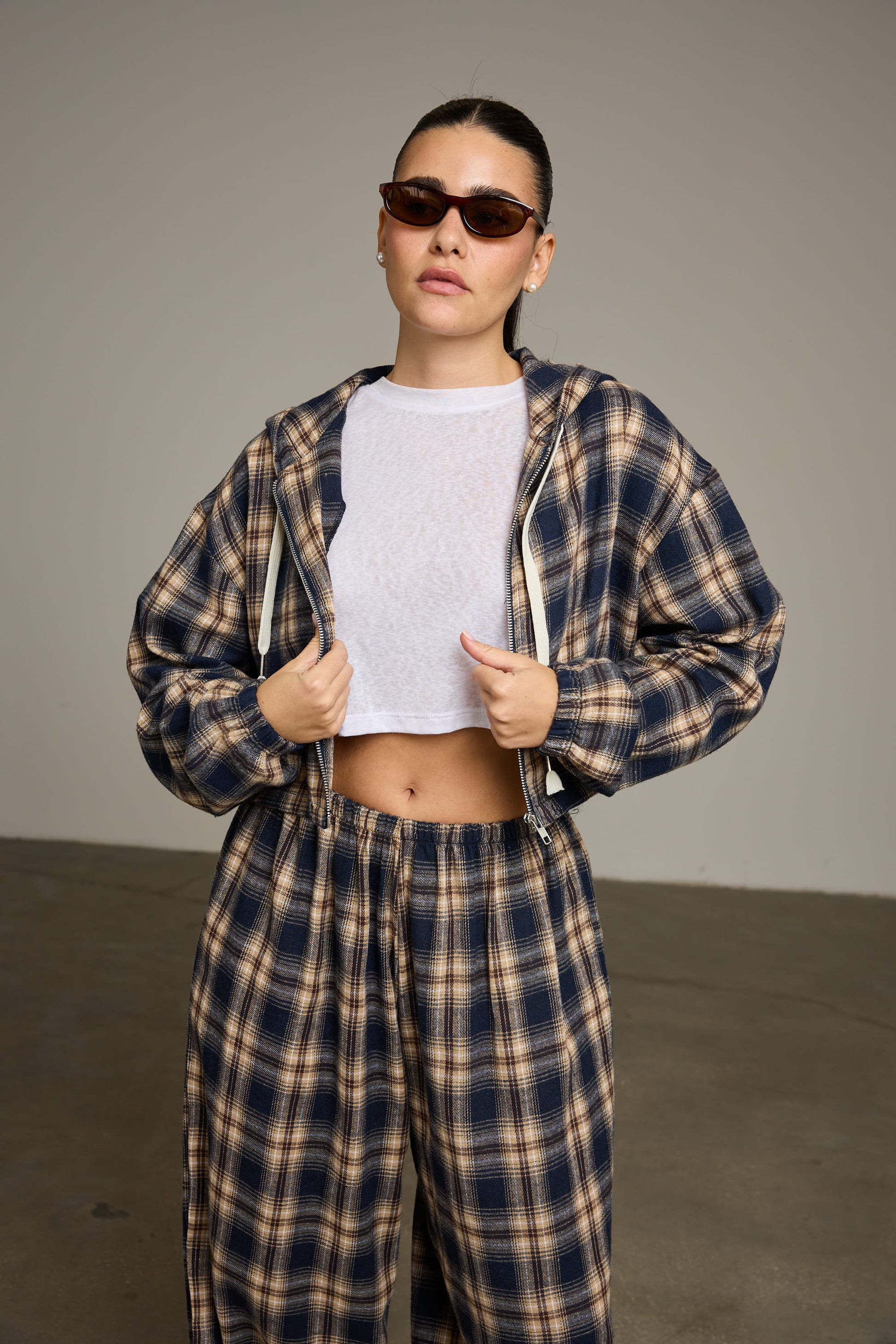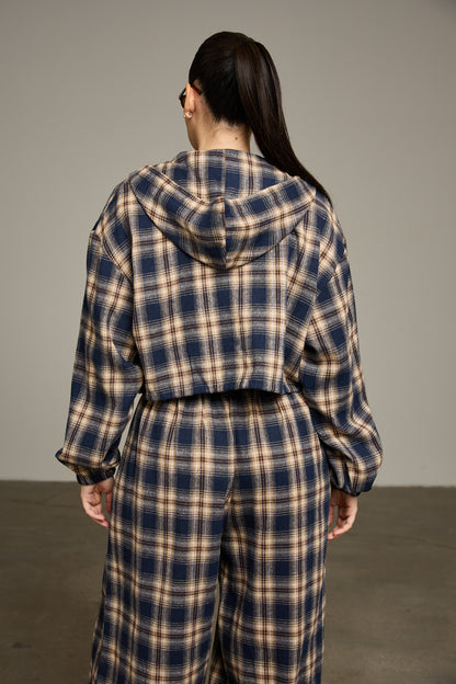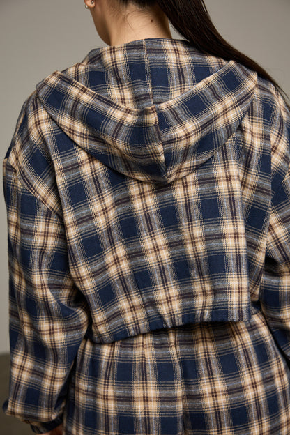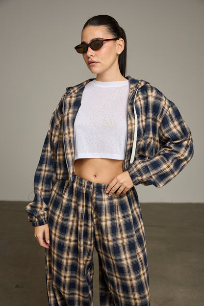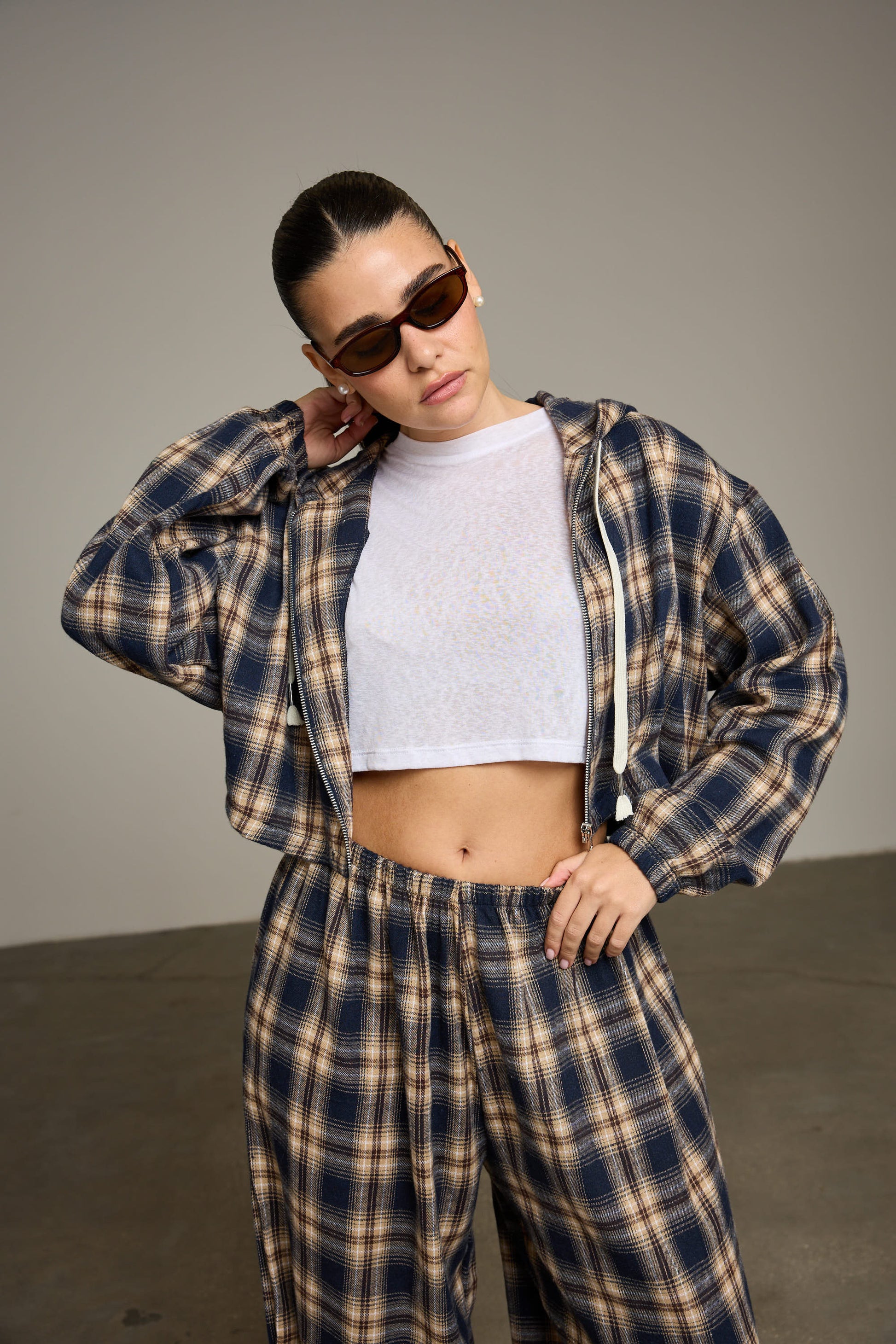 ז'קט קרופ משבצות בשילוב כובע קפוצ'ון ושרוך קשירה להידוק.שלבי עם מכנסי לינה ליצירת לוק יפה ונינוח!