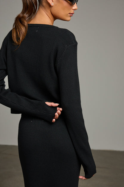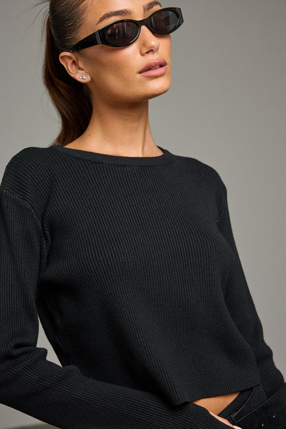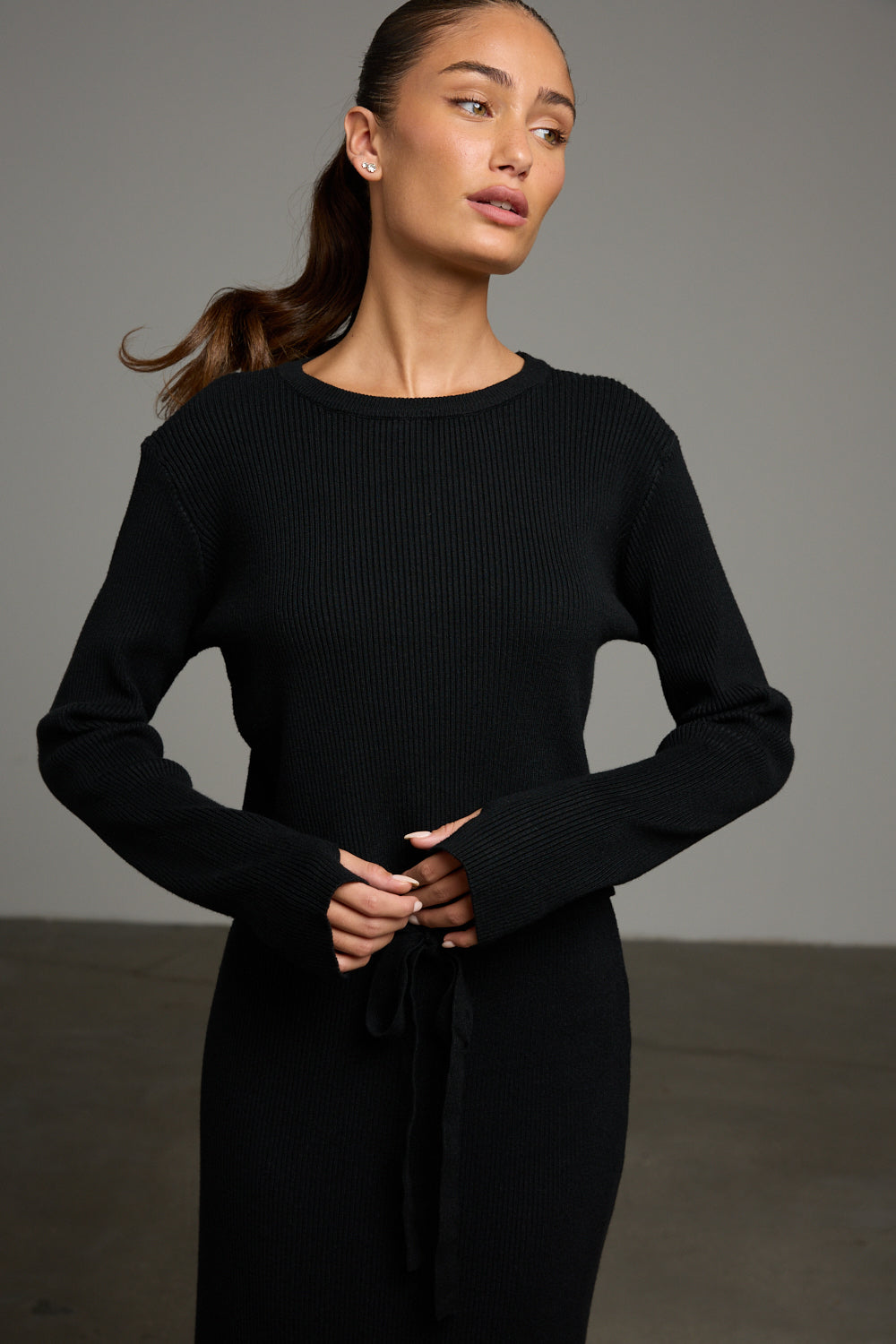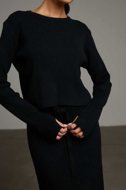 חולצת סריג בגזרה קרובה לגוף מבד נעים למגע עם טקסטורת פסים לאורך בשילוב צווארון עגול ושרוולים ארוכים עם פתח לאגודל. שלבי עם חצאית ליסה ליצירת לוק משגע!