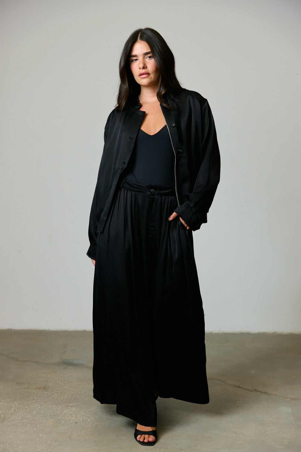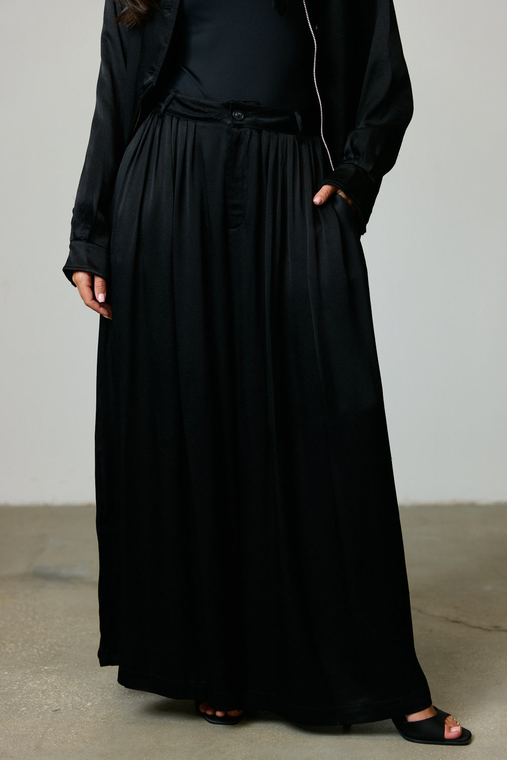 מכנסי פשתן בגזרה רחבה בשילוב מותן אחורית אלסטית, קפלים מלפנים וסגירת כפתור עם רוכסן. שלבי עם ז'קט מאגן ליצירת לוק היסטרי!