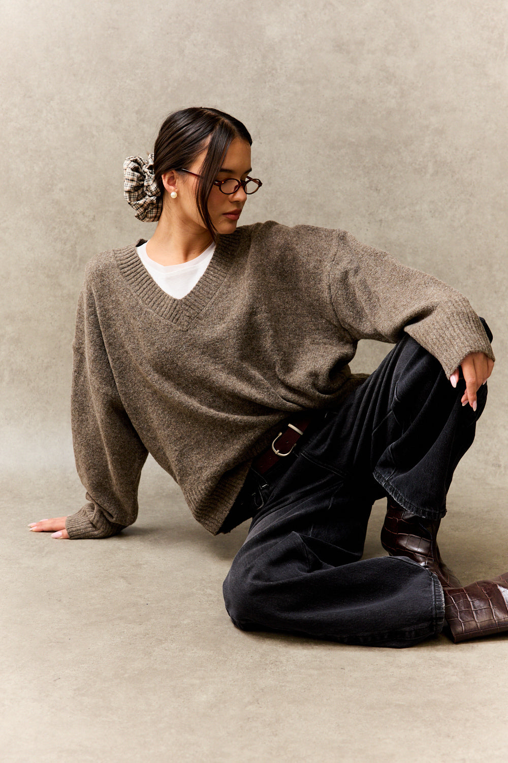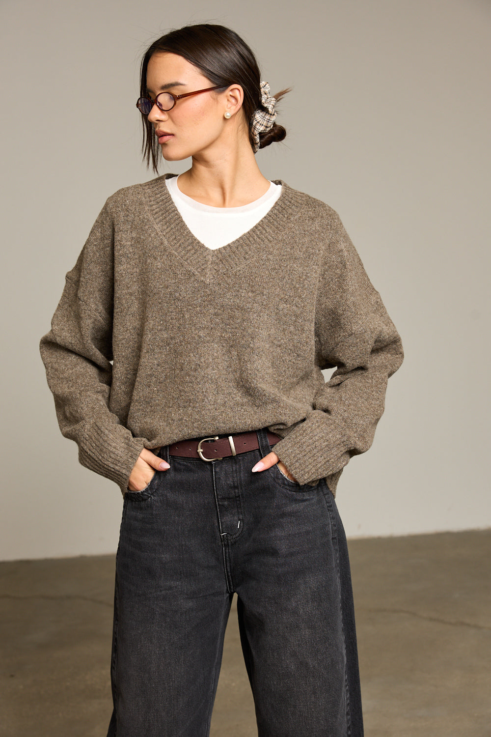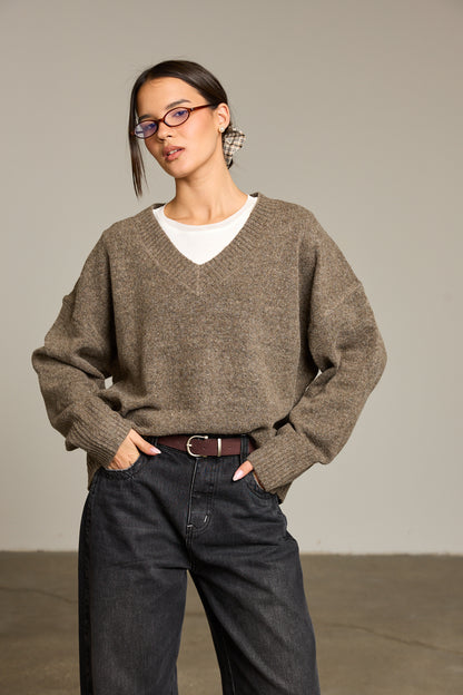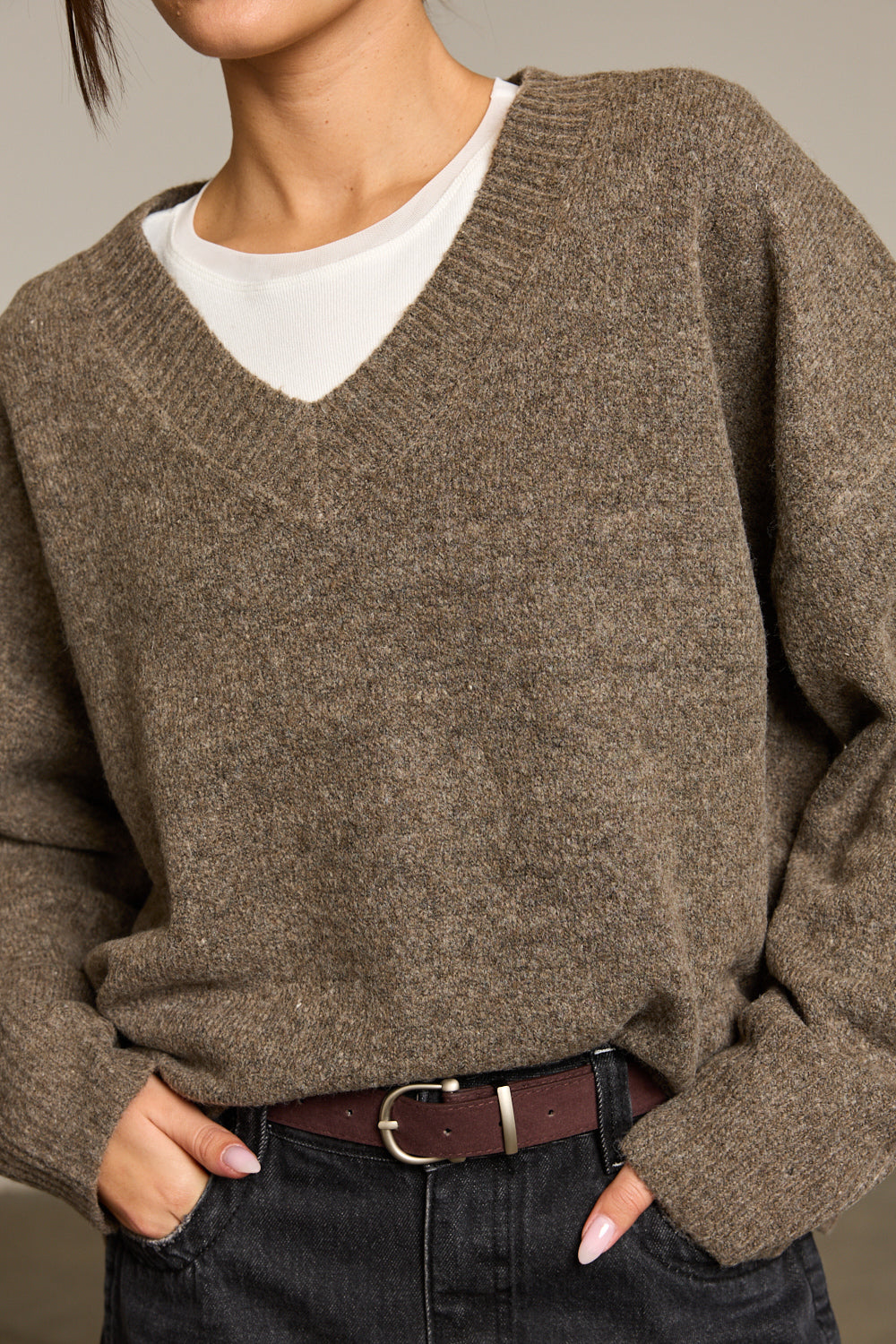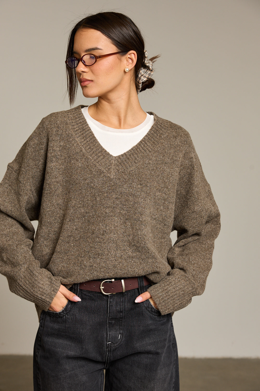 סריג בגזרה משוחררת מבד נעים למגע בשילוב צווארון וי עמוק
