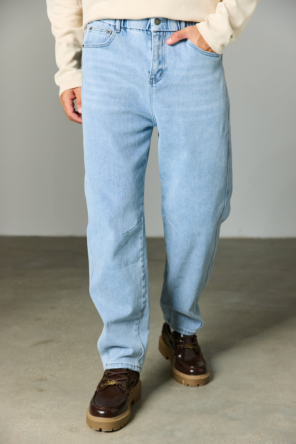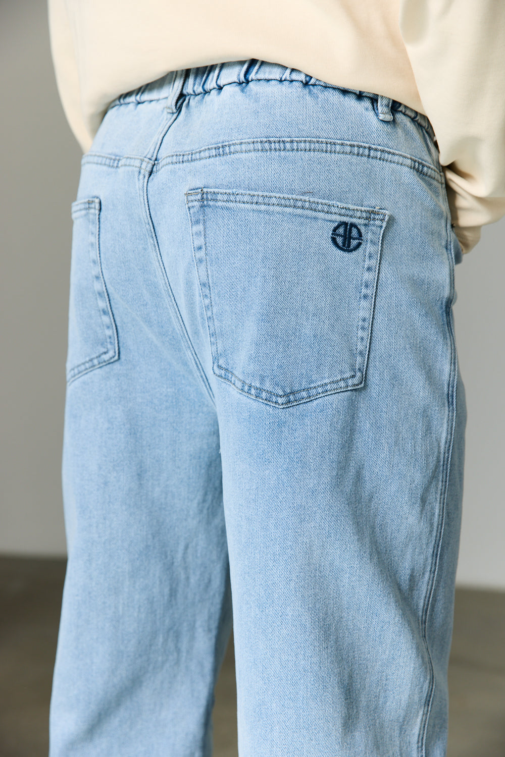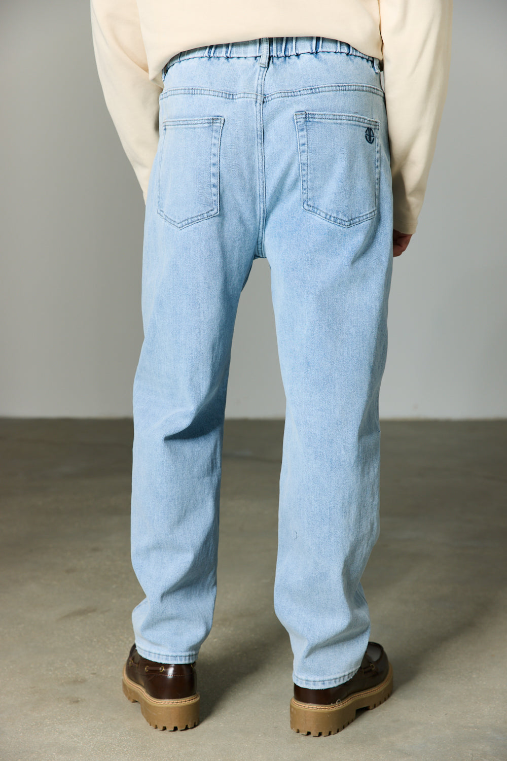 מכנסי ג'ינס בגזרה משוחררת מבד לייקרה עם שטיפה עדינה בשילוב מותן אלסטית, שרוך קשירה להידוק וחמישה כיסים