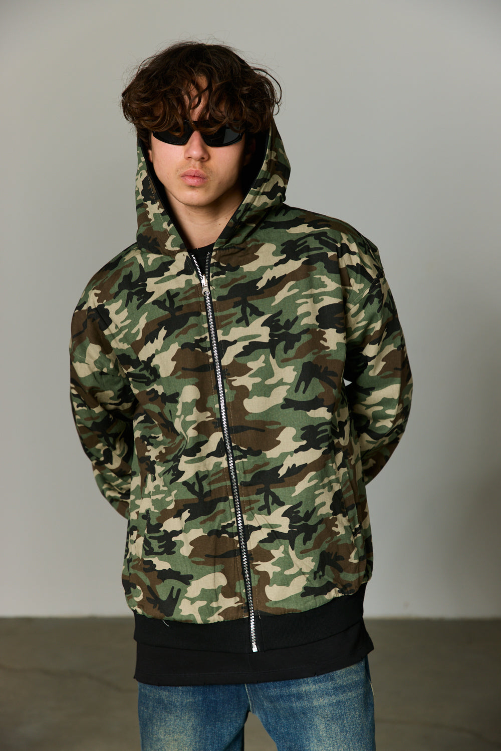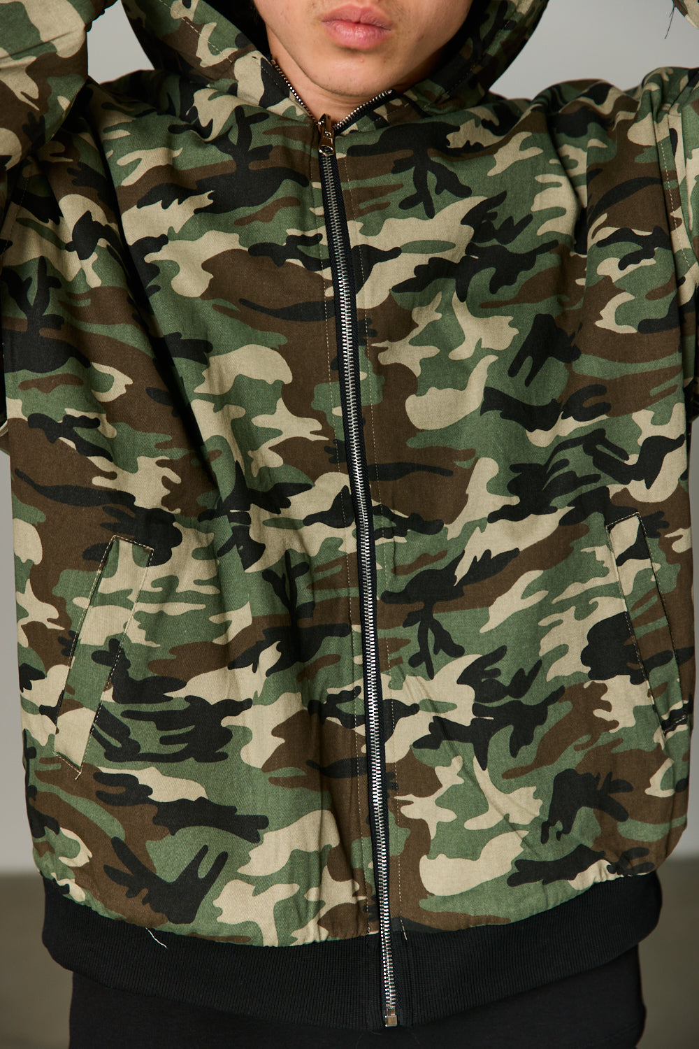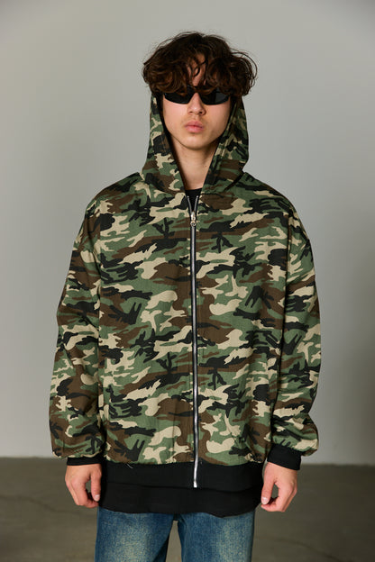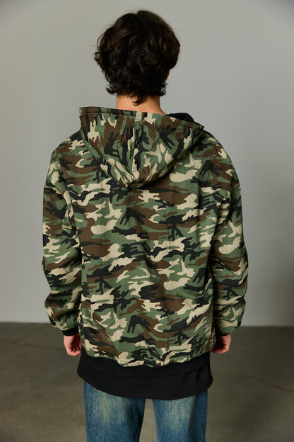 ז'קט בגזרה משוחררת מבד נעים למגע בשילוב סגירת רוכסן מלפנים, כובע, שרוולים ארוכים, צמד כיסים וביטנה צבאית. הז'קט דו צדדי