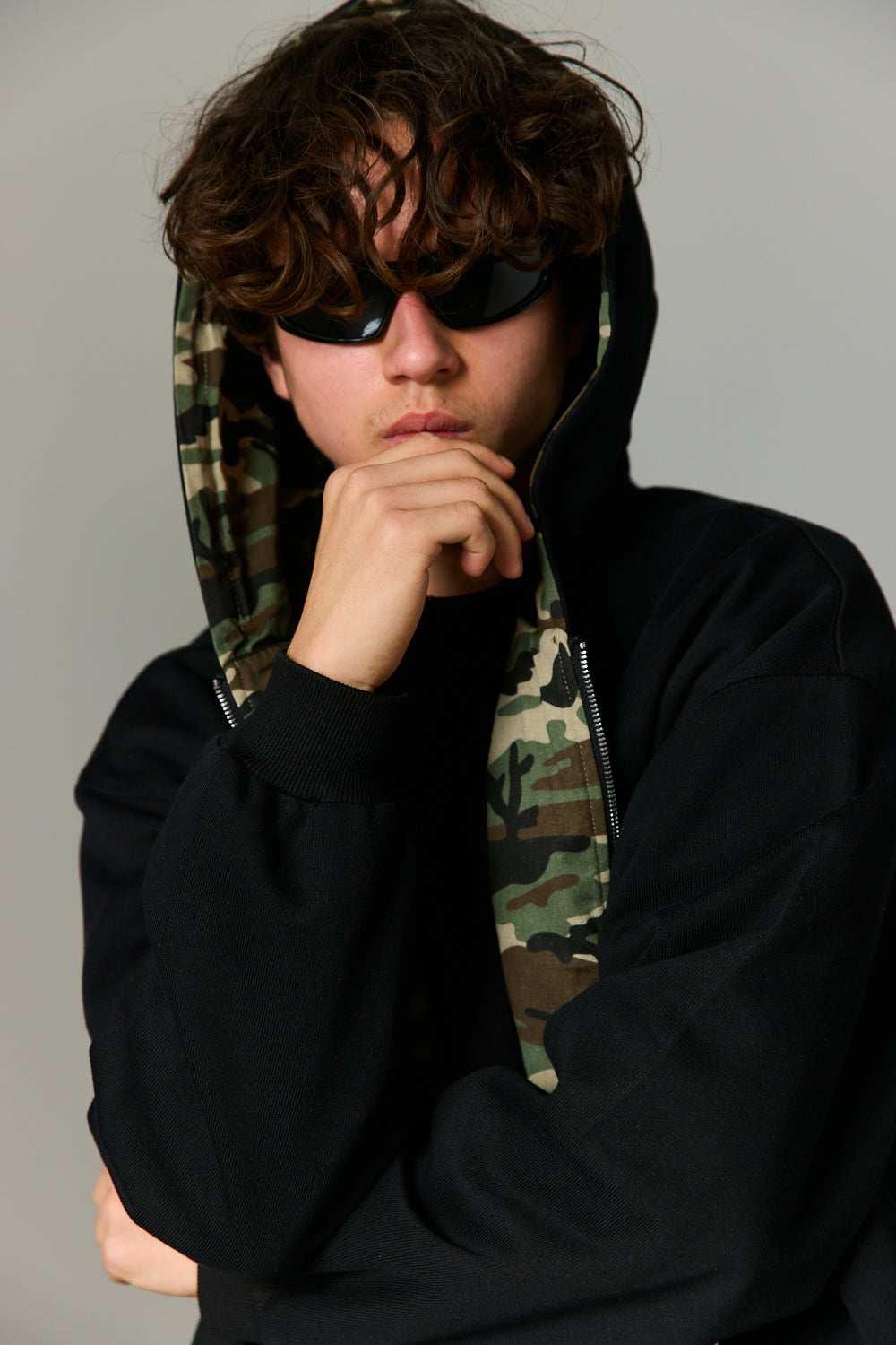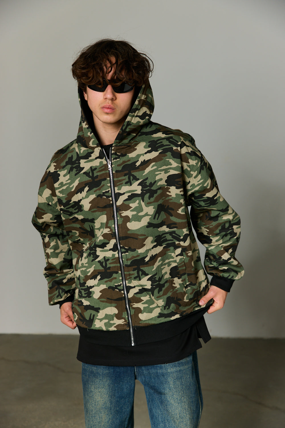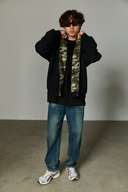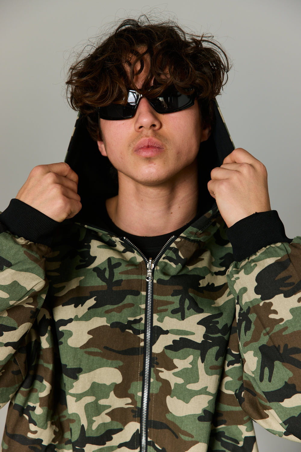 ז'קט בגזרה משוחררת מבד נעים למגע בשילוב סגירת רוכסן מלפנים, כובע, שרוולים ארוכים, צמד כיסים וביטנה צבאית. הז'קט דו צדדי