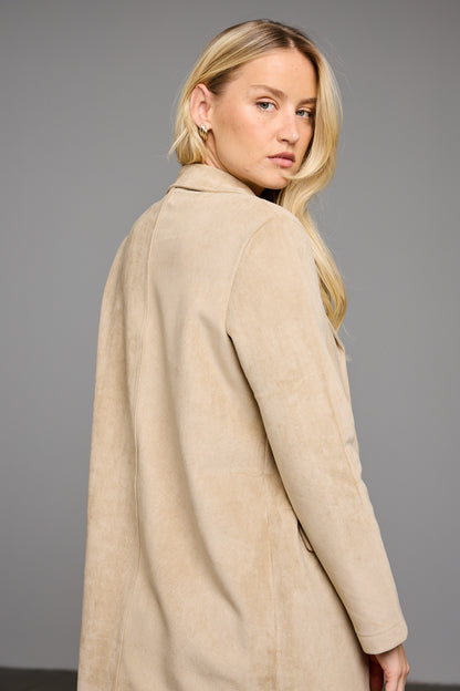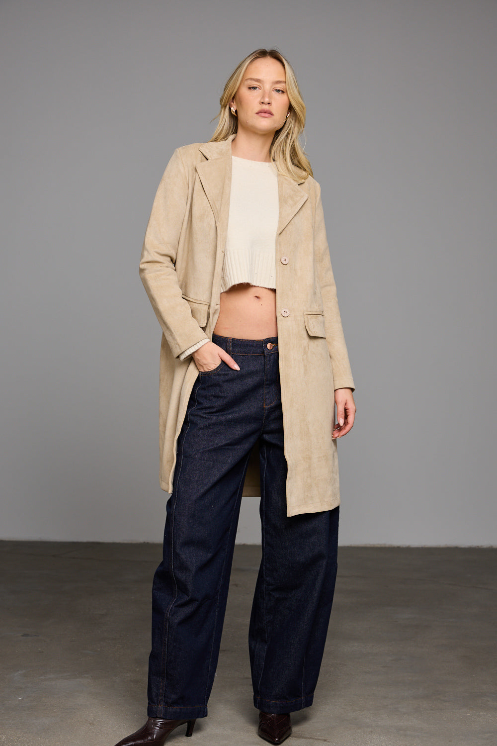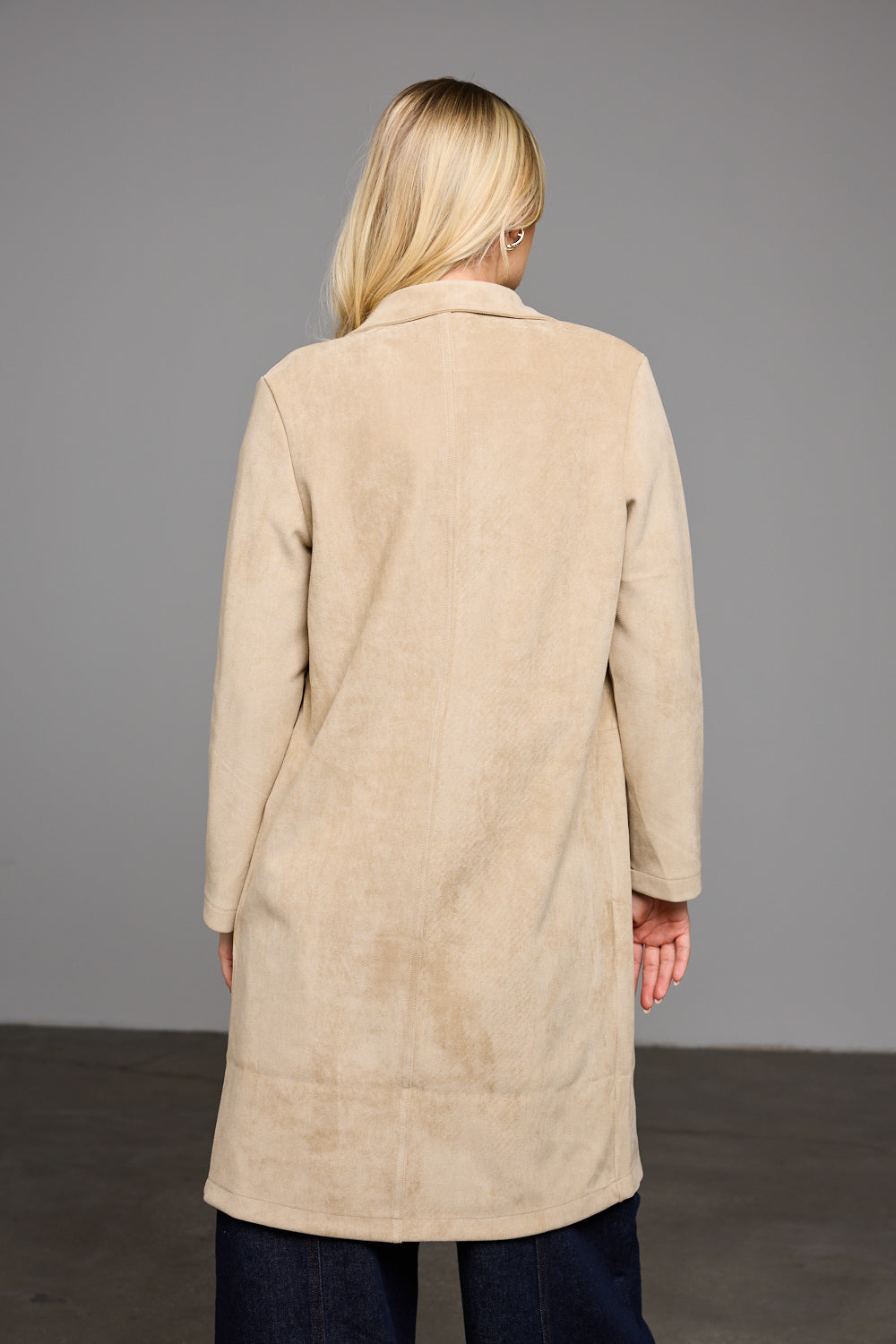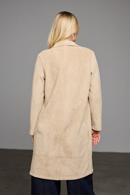 מעיל בגזרה ישרה וארוכה בשילוב צווארון דש, סגירת כפתורים וצמד כיסים