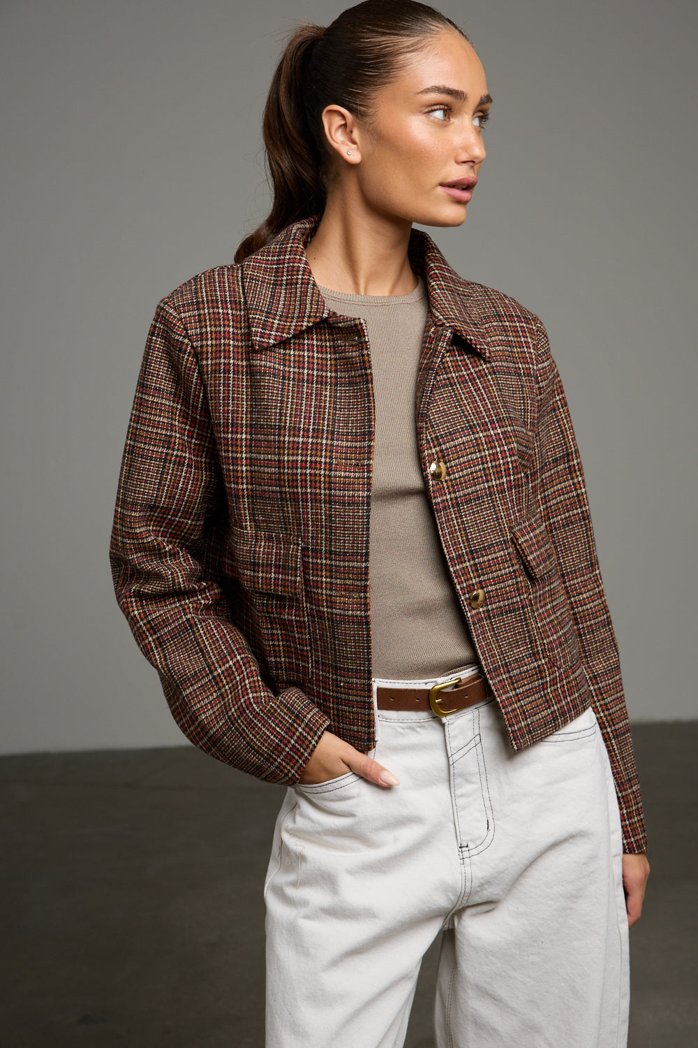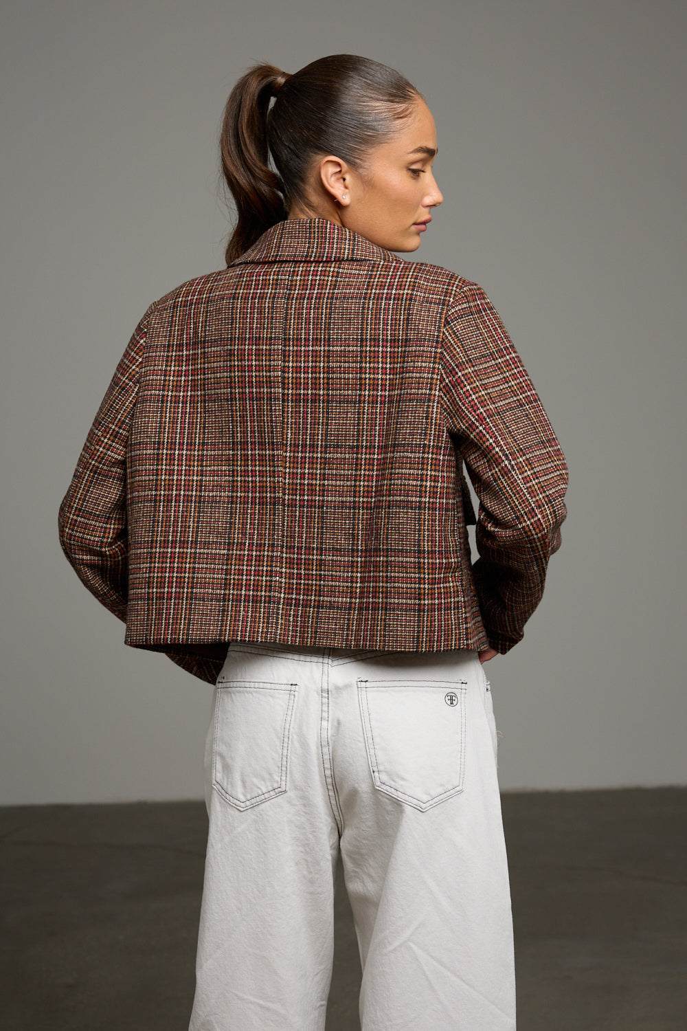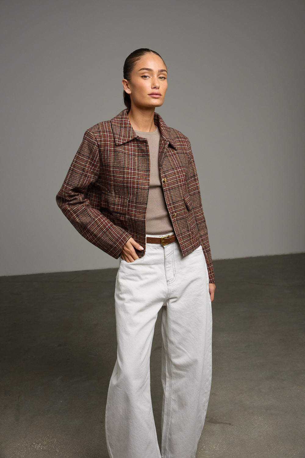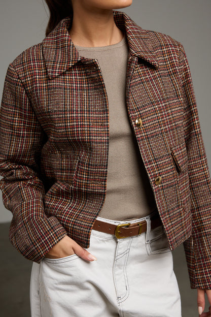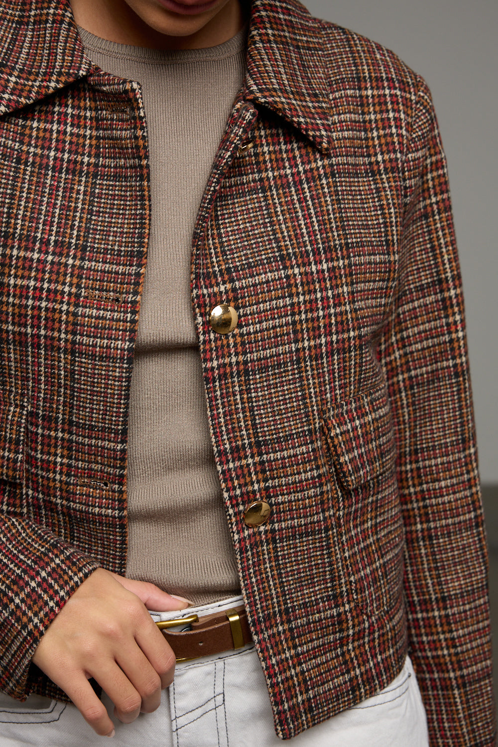 ג'קט בגזרה קרובה לגוף עד קו במותן בשילוב צווארון קלאסי, כפתורים מוזהבים מלפנים, כיסים דקורטיבים וטקסטורת משבצות