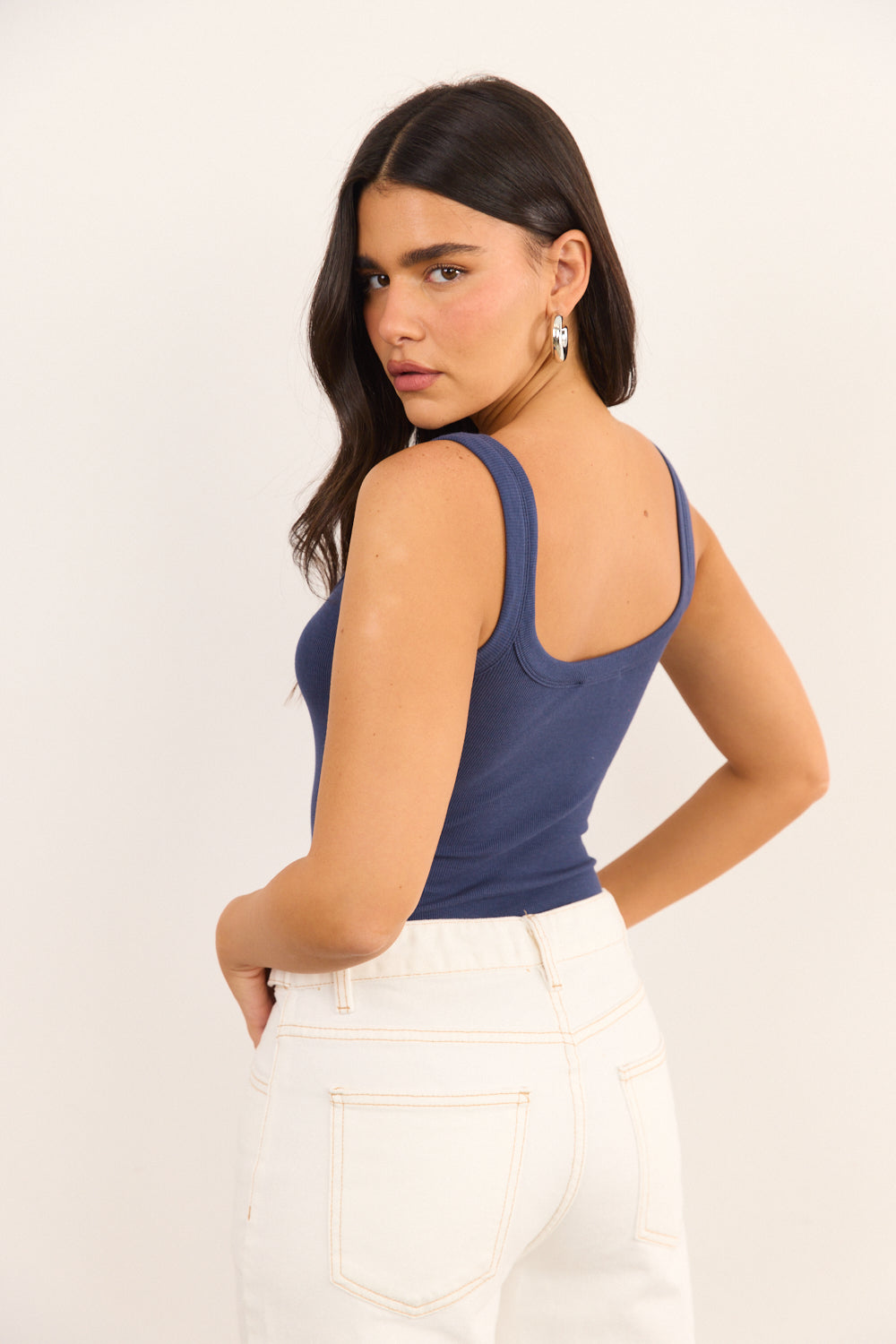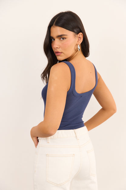 בגד גוף בגזרה צמודה מבד ריב אלסטי בשילוב כתפיות רחבות. לבגד גוף תחתון ברזילאי וסגירת תיק תק
