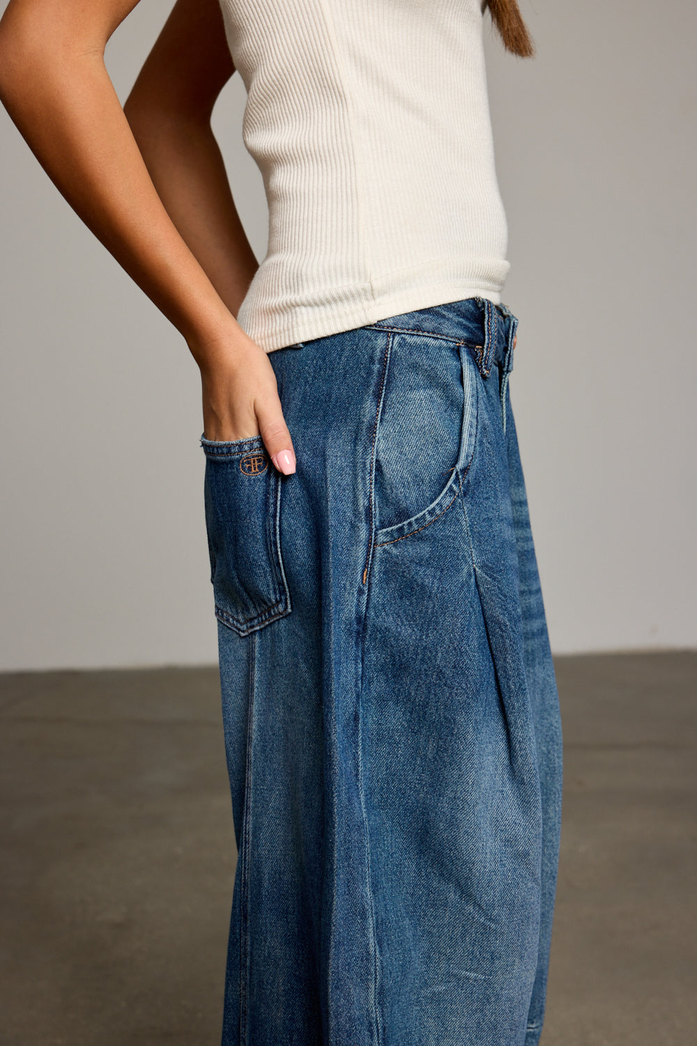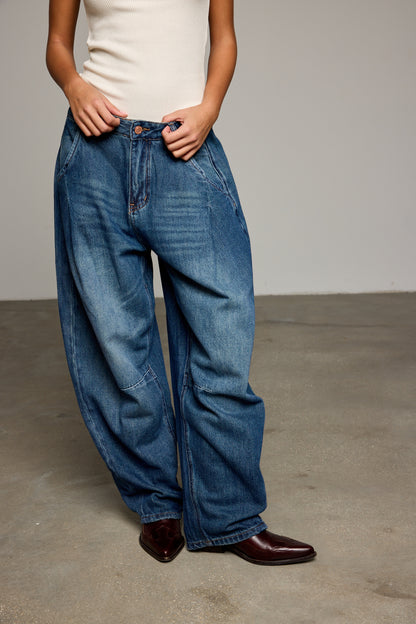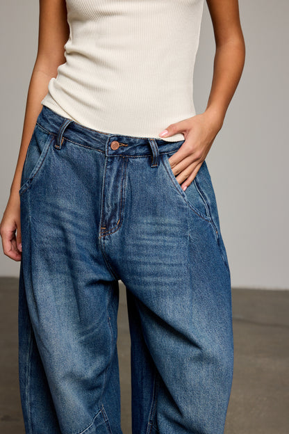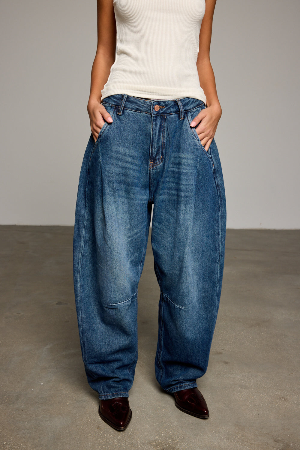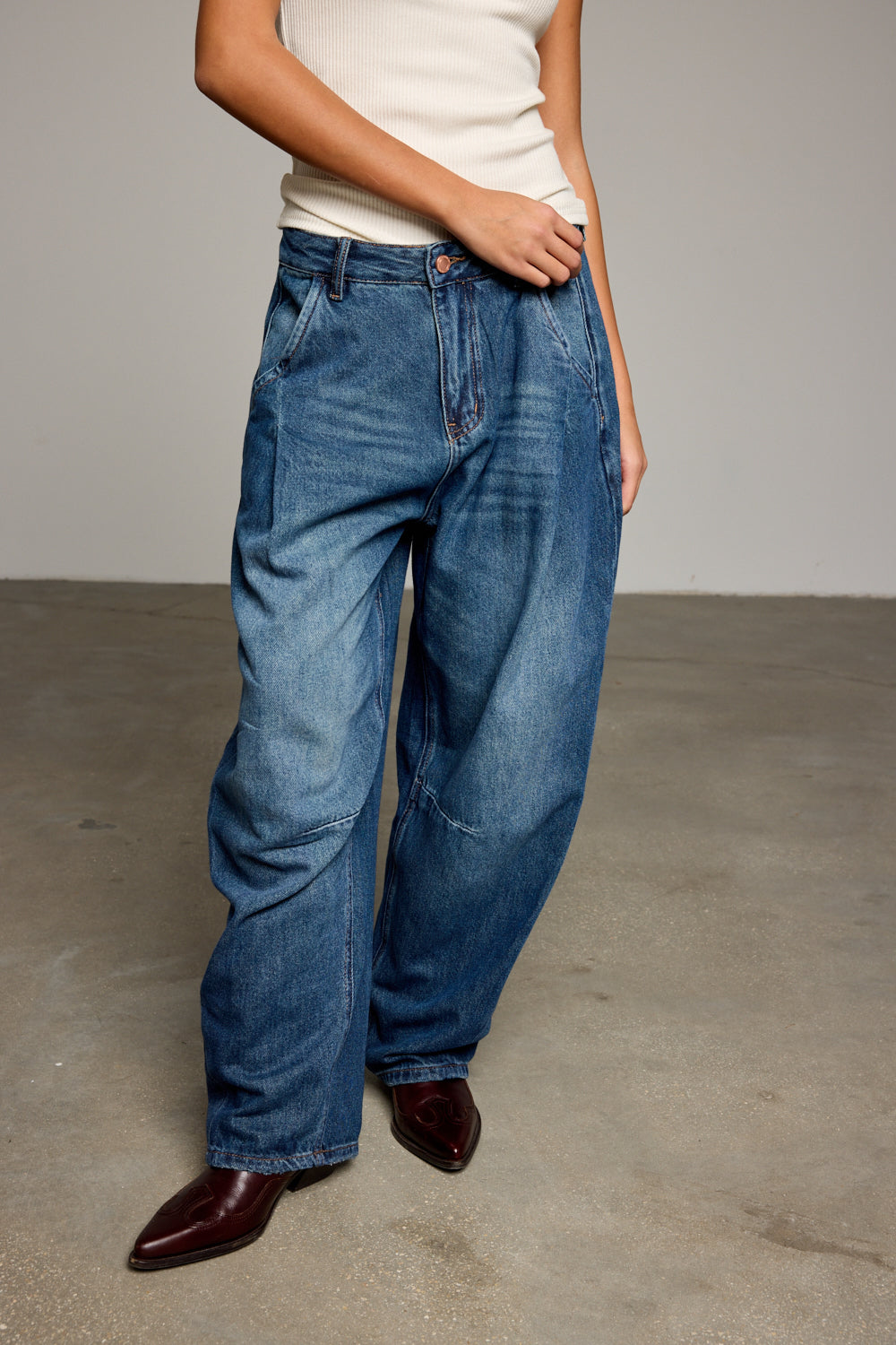 ג'ינס בגזרת בויפרנד בשילוב שטיפה מלפנים, ארבעה כיסים, כיווצים מלפנים, לולאות לחגורה וסגירת כפתור עם רוכסן מלפנים