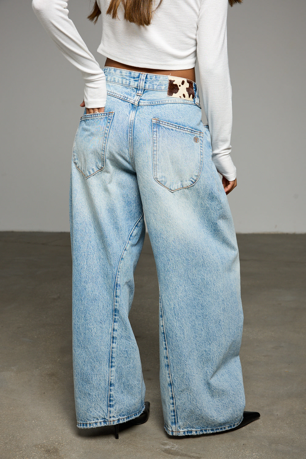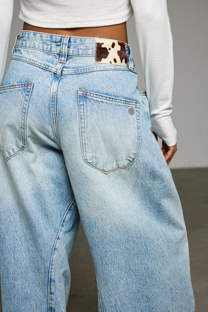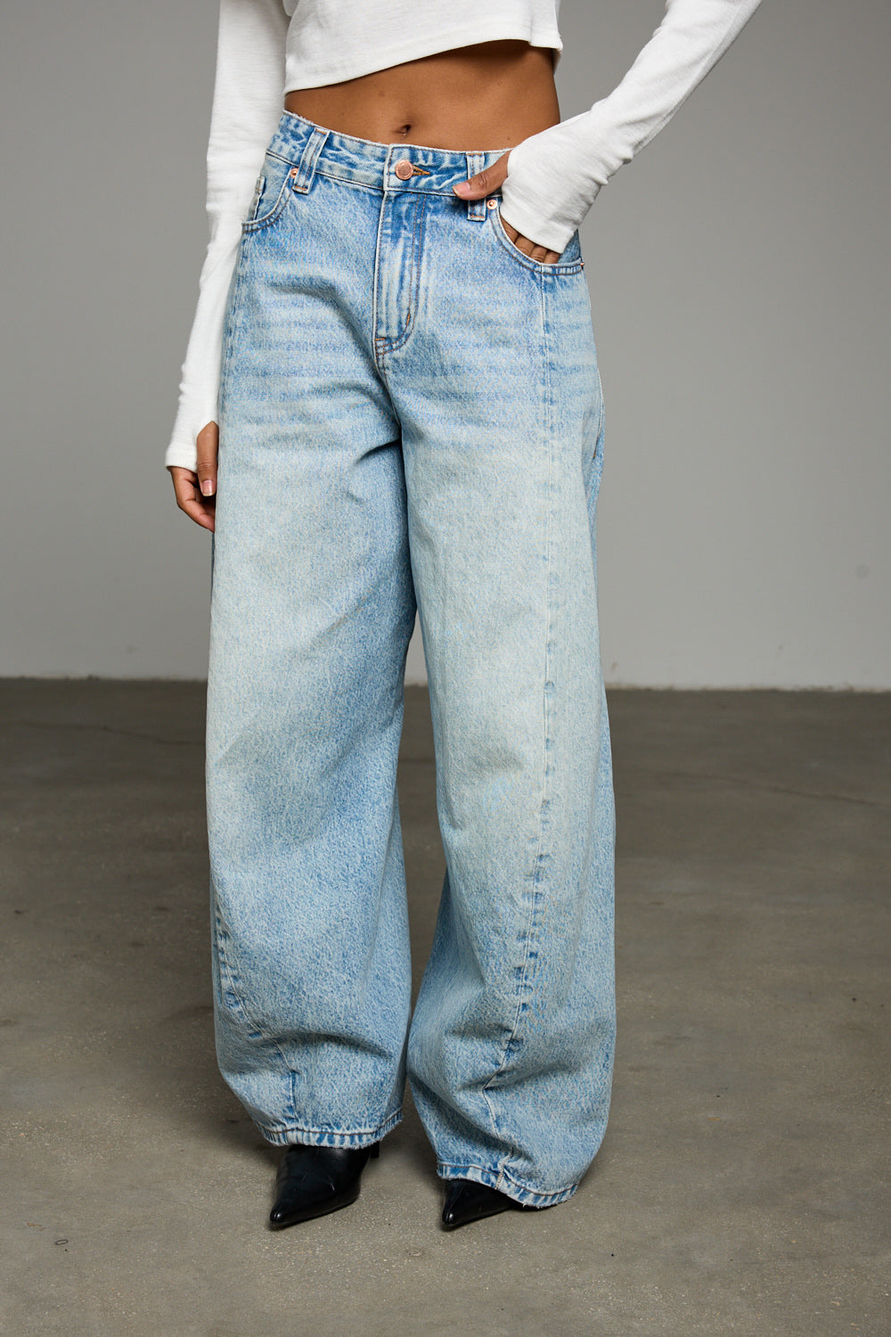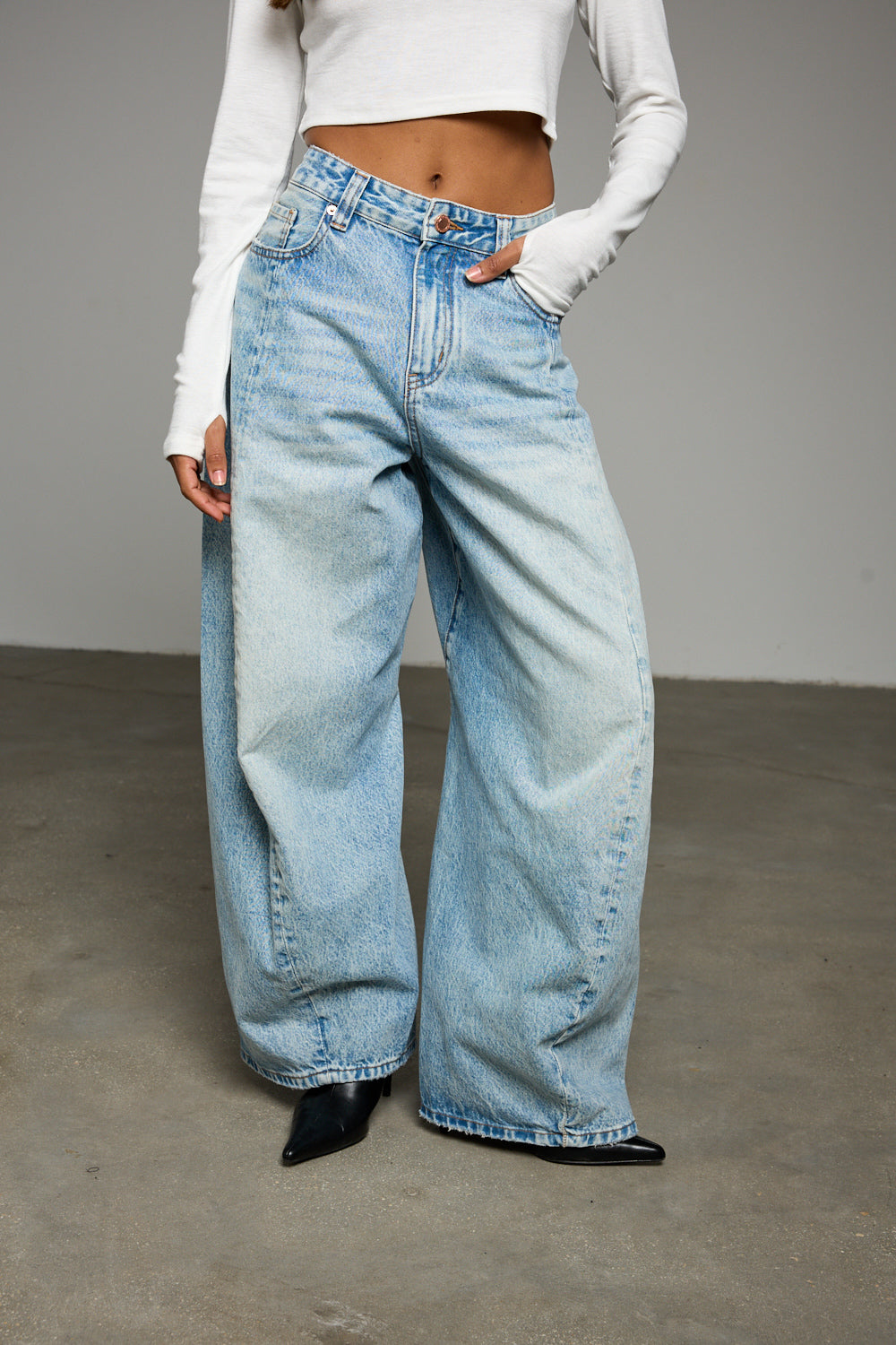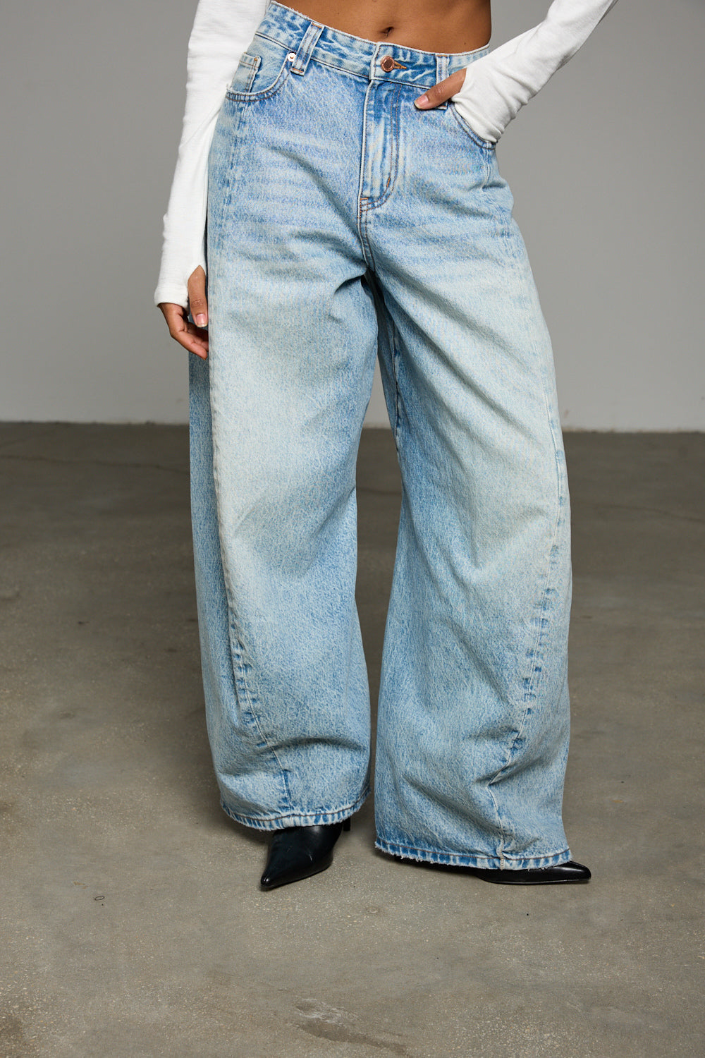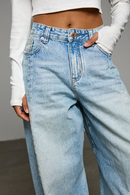 ג'ינס בגזרת אוברסייז מבד דנים בשילוב לולאות לחגורה, חמישה כיסים, תפרים מובלטים מלפנים, פאץ פרה וסגירת כפתור עם רוכסן