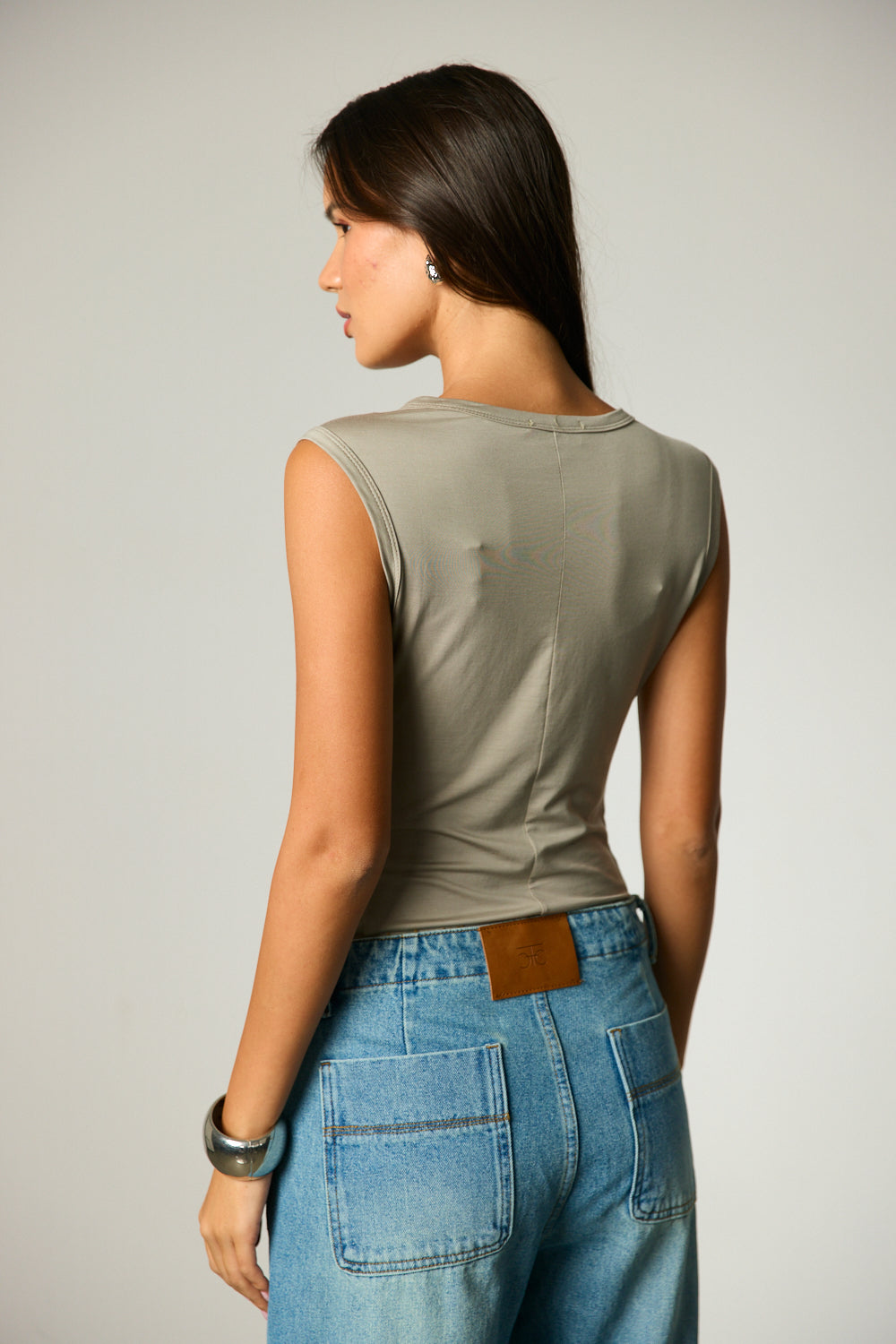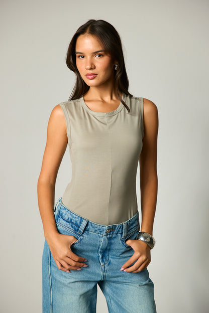 גופייה בגזרה קרובה לגוף מבד נשפך ונעים למגע בשילוב כתפיות רחבות, מפתח צוואר עגול ועיטורי תפר מלפנים