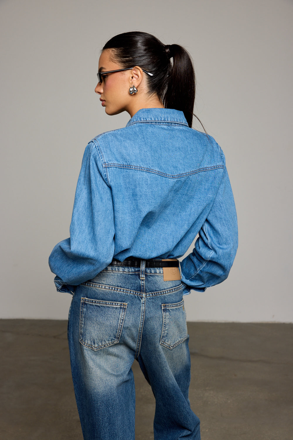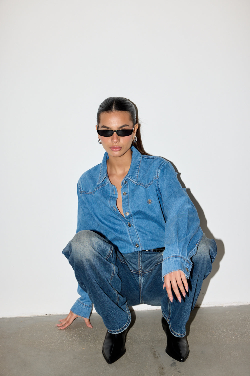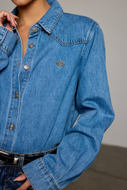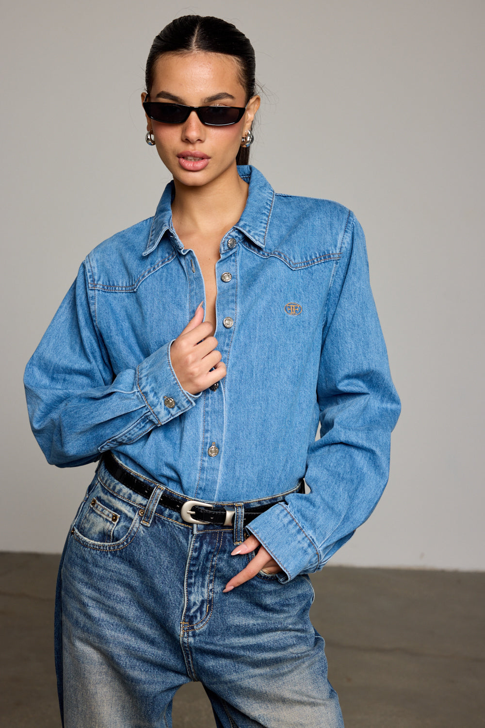 מכופתרת ג'ינס בגזרה קרובה לגוף בשילוב לוגו רקום, צווארון קלאסי וסגירת כפתורים מלפנים