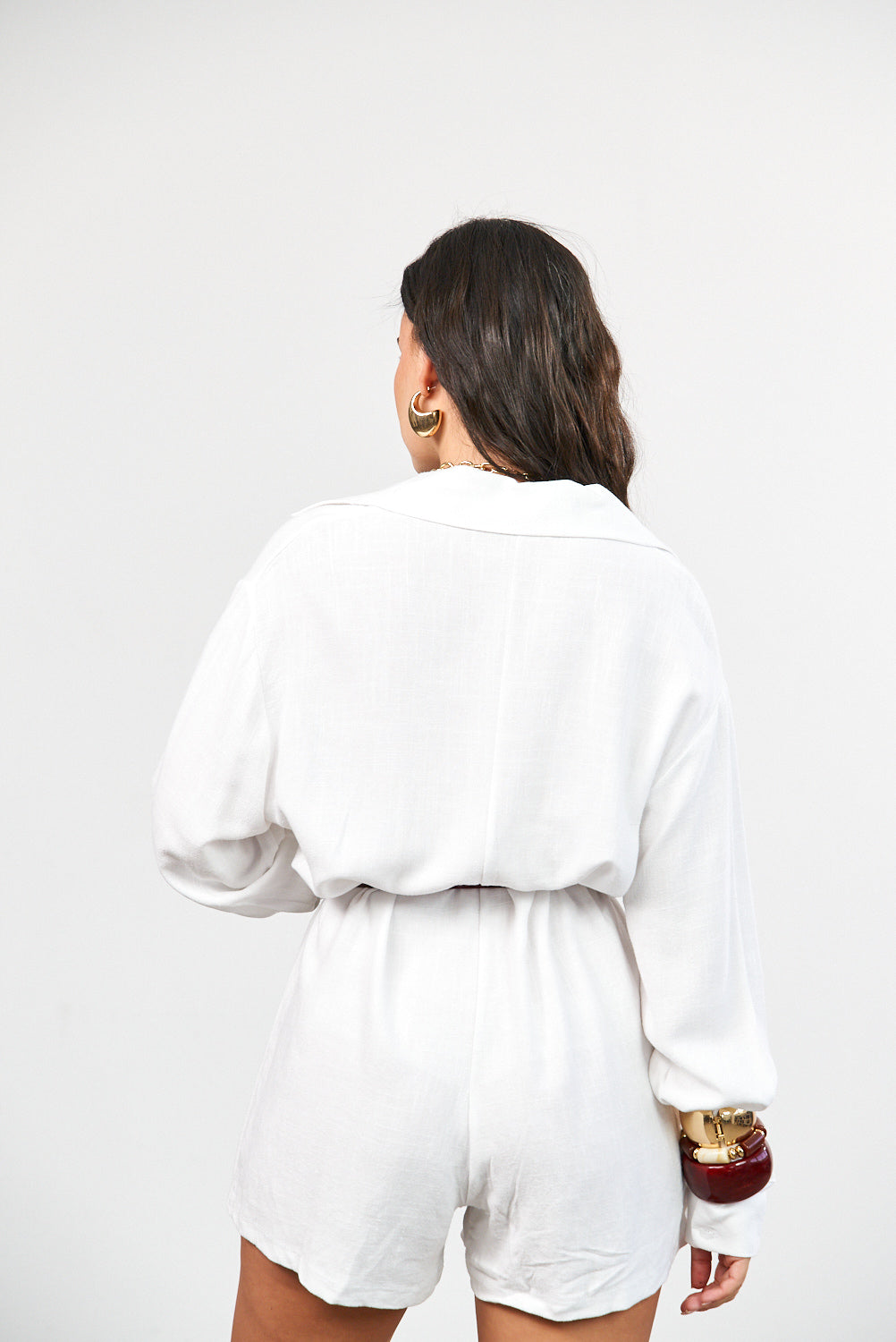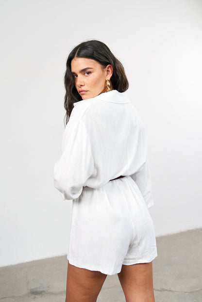 אוברול בגזרה משוחררת מבד פשתן נעים למגע בשילוב צווארון קלאסי, כפתורים מלפנים ומפתח וי עמוק