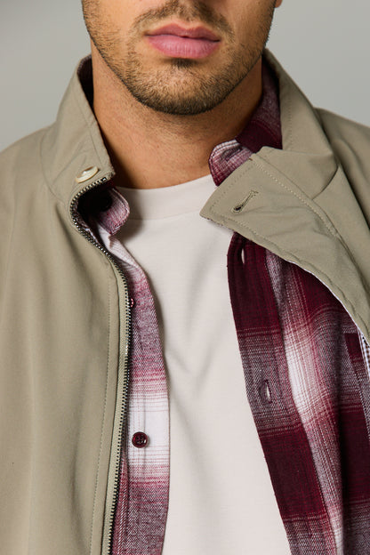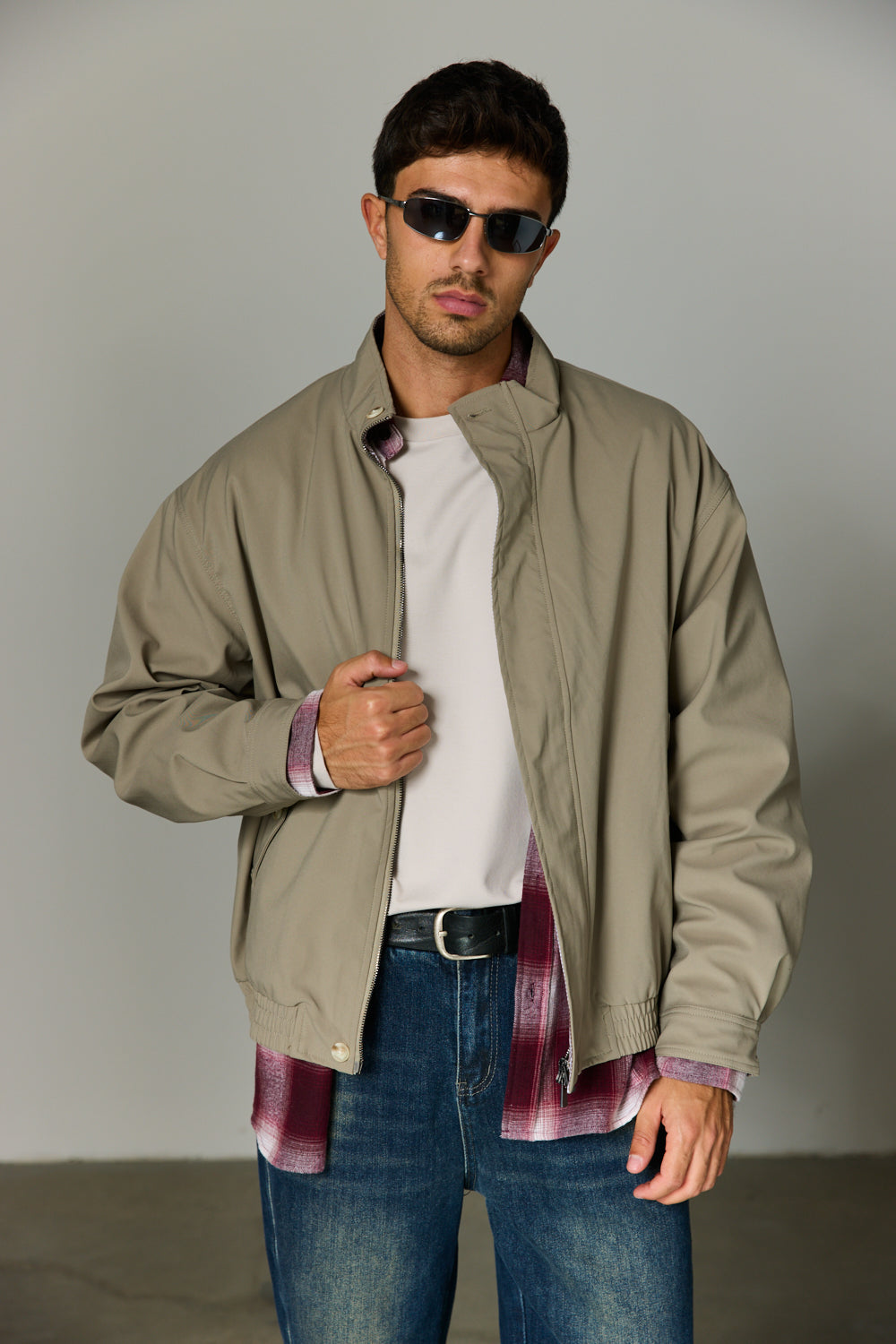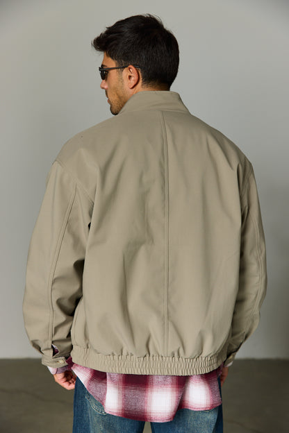 ג'קט בגזרה משוחררת מבד עמיד בשילוב צווארון גבוה, סגירת רוכסן עם תיק תק מלפנים, צמד כיסים ושרוולים ארוכים