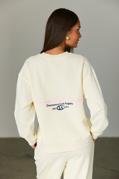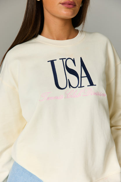 חולצה בגזרה משוחררת מבד פוטר נעים למגע בשילוב הדפס רקום מלפנים, צווארון מעוגל ושרוולים ארוכים. שלבי עם מכנסי USA ללוק היסטרי!