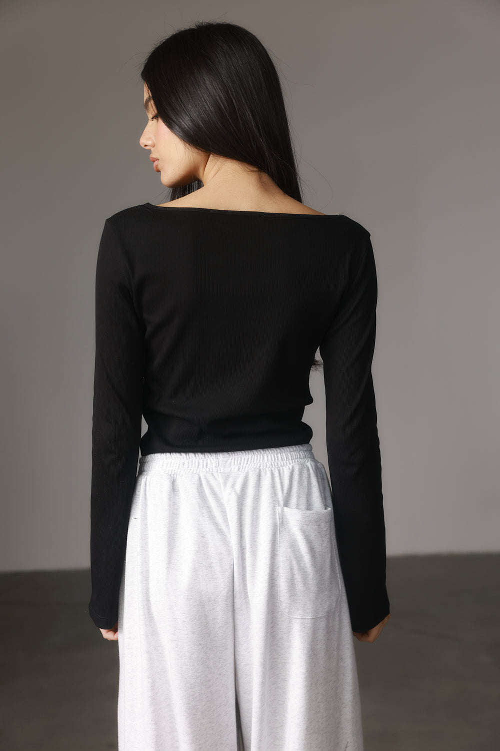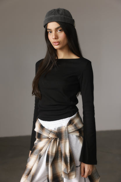 חולצה בגזרה צמודה מבד ריב בשילוב מפתח צוואר סירה ושרוולים מתרחבים